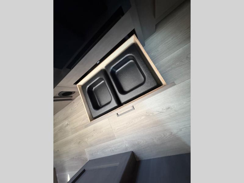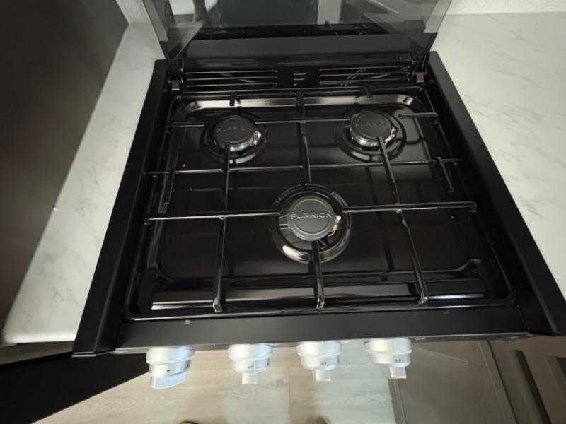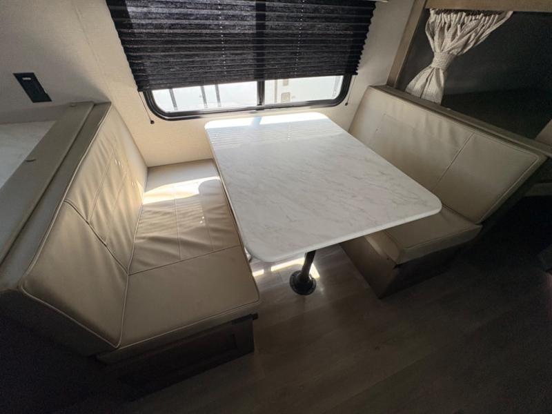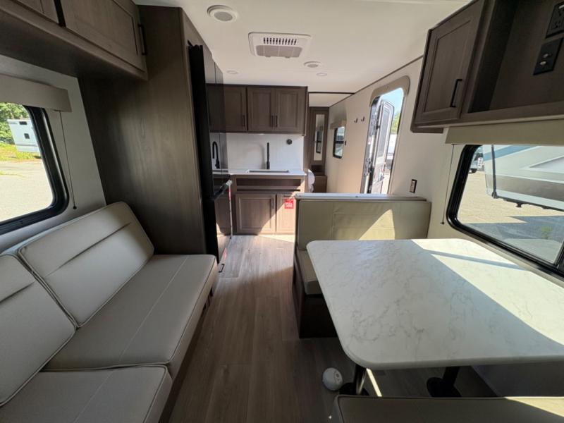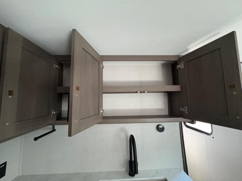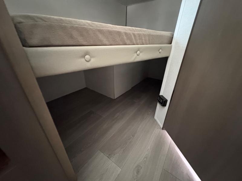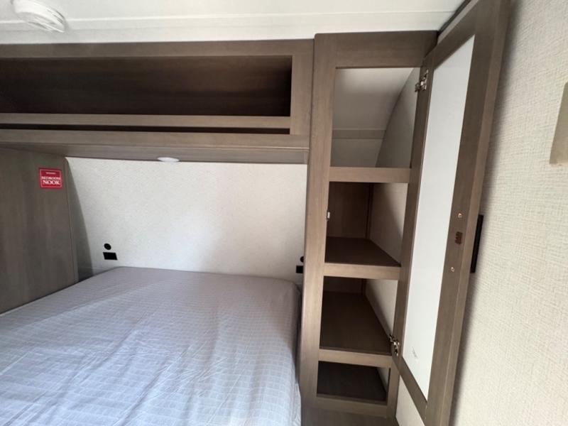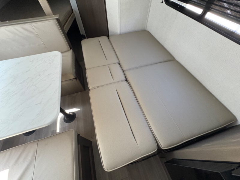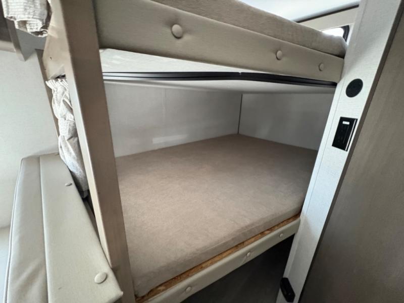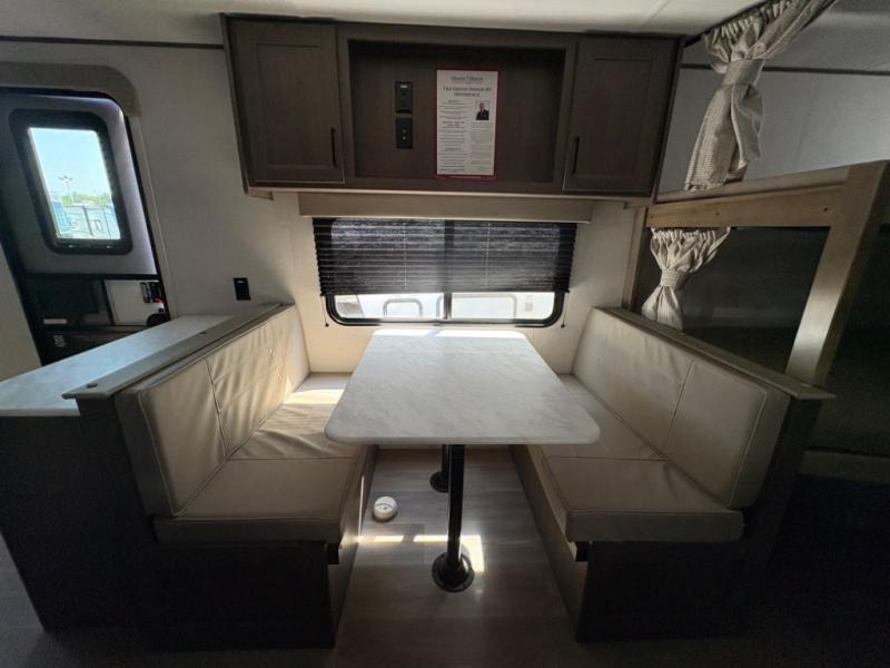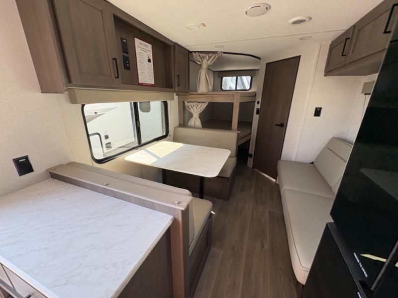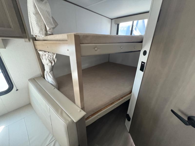 This is the perfect travel trailer if you like to camp with friends and family. Since there are double-size bunks, a queen bed in the front bedroom, plus a booth dinette and sofa, you can sleep eight campers each night! The three burner range and microwave in the kitchen will let you cook meals each day, and the 12V refrigerator will keep your cold items fresh. This model also includes a counter with extra storage underneath, a pull-out trash can storage for convenience, and a full bath to freshen up in each day. And you'll love having your own space in the front bedroom with a privacy curtain, dual wardrobes, and TV prep if you want to add a television!