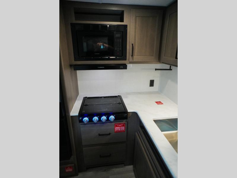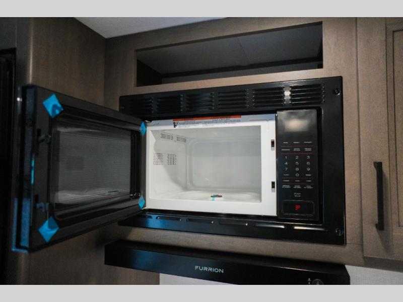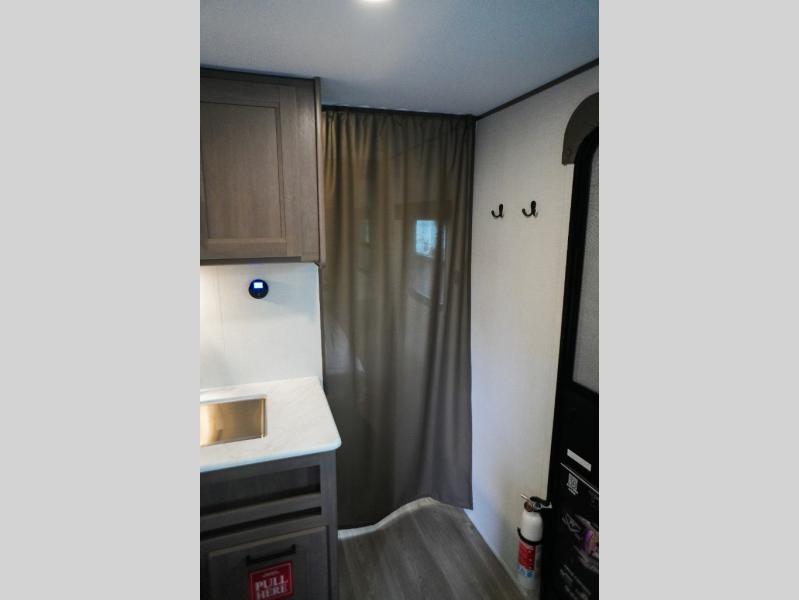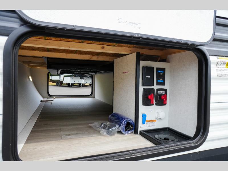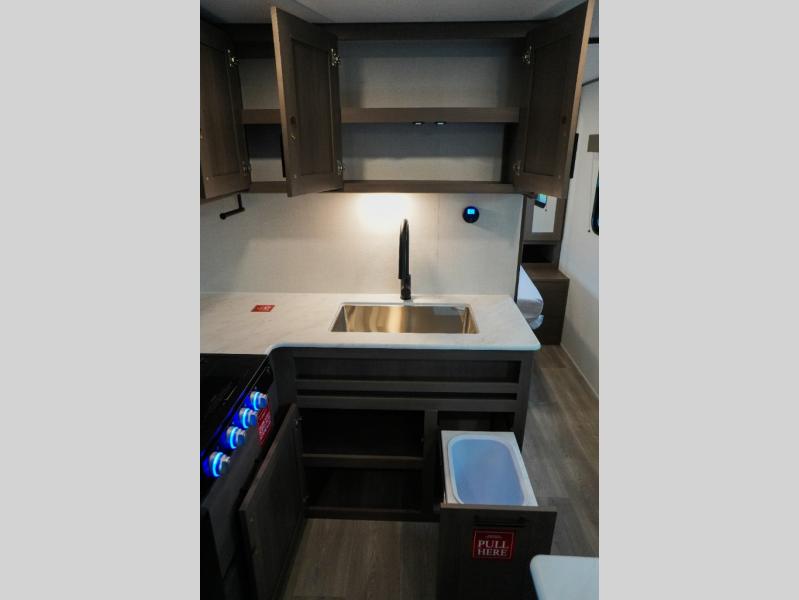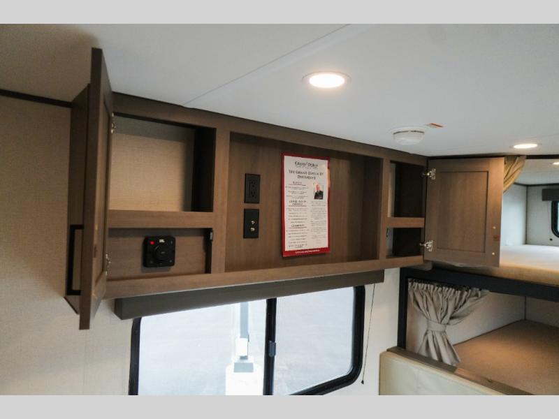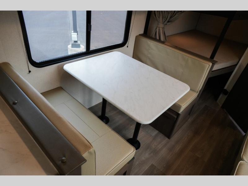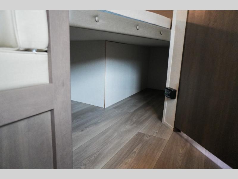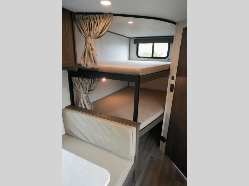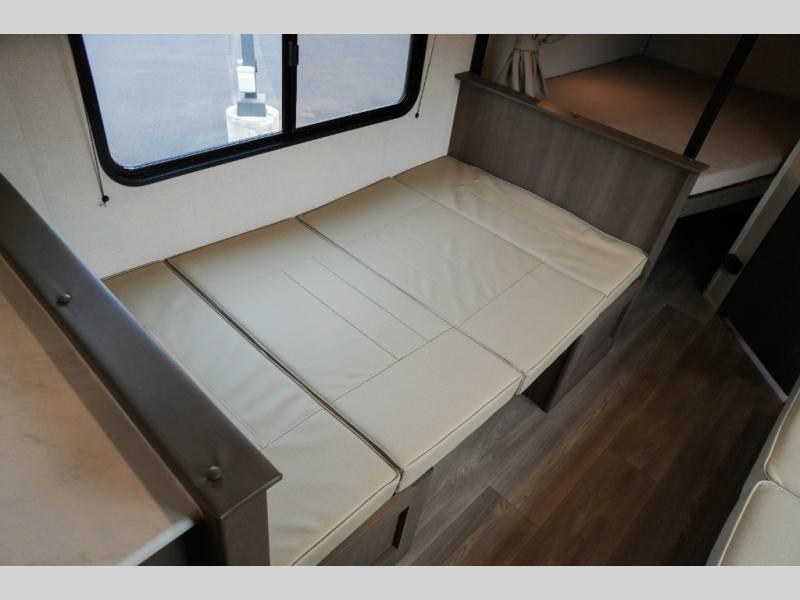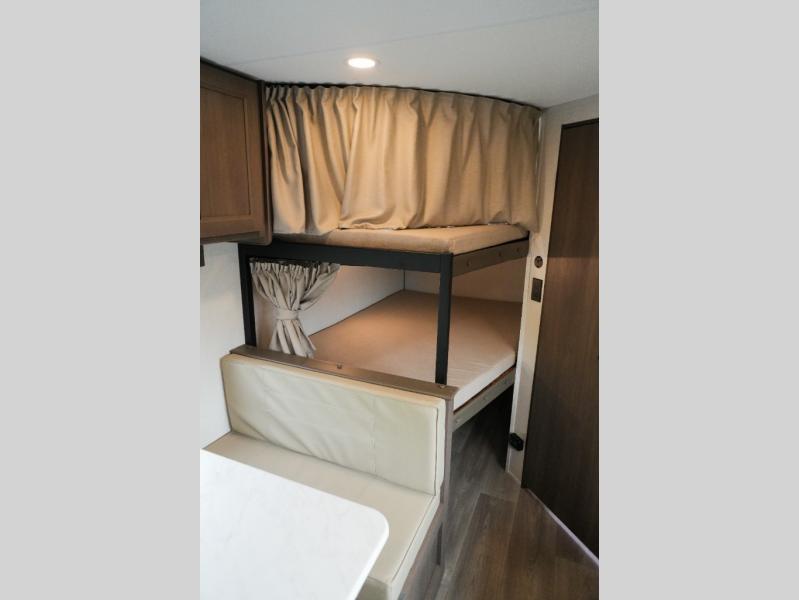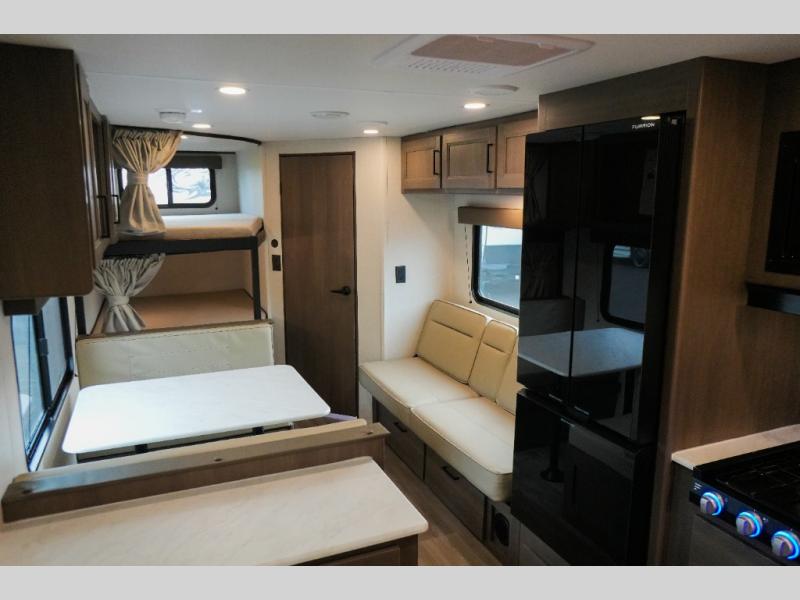 This is the perfect travel trailer if you like to camp with friends and family. Since there are double-size bunks, a queen bed in the front bedroom, plus a booth dinette and sofa, you can sleep eight campers each night! The three burner range and microwave in the kitchen will let you cook meals each day, and the 12V refrigerator will keep your cold items fresh. This model also includes a counter with extra storage underneath, a pull-out trash can storage for convenience, and a full bath to freshen up in each day. And you'll love having your own space in the front bedroom with a privacy curtain, dual wardrobes, and TV prep if you want to add a television!