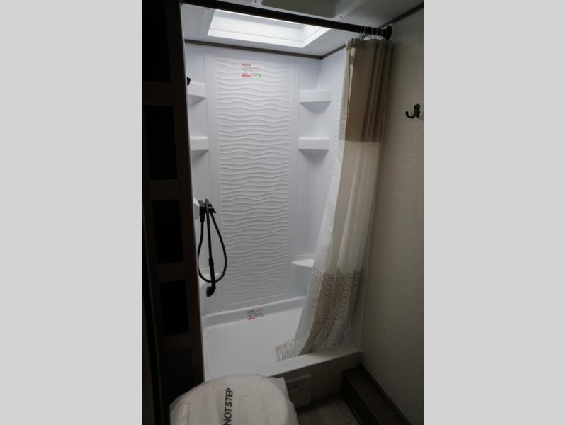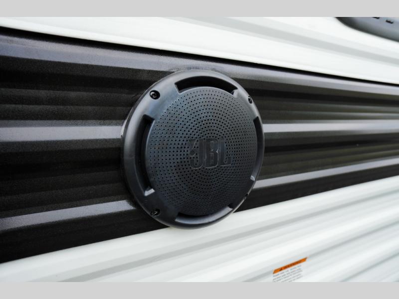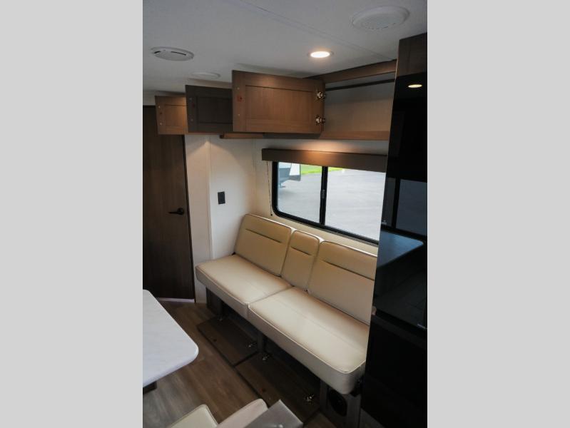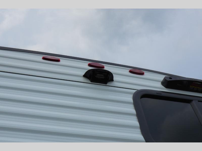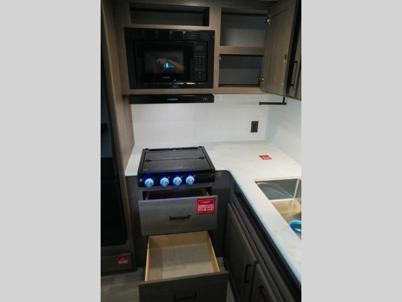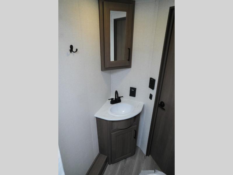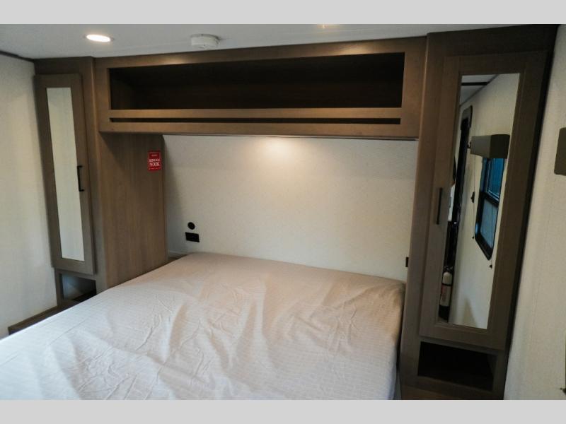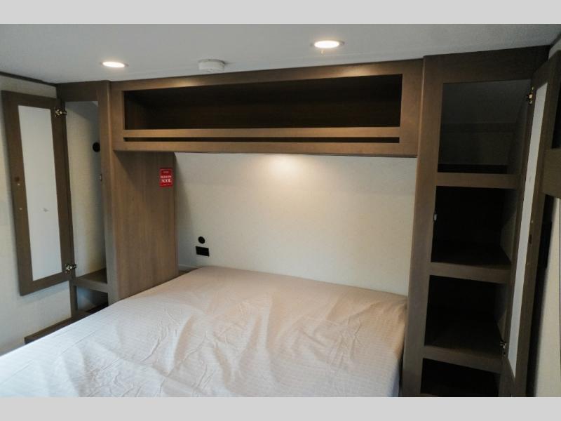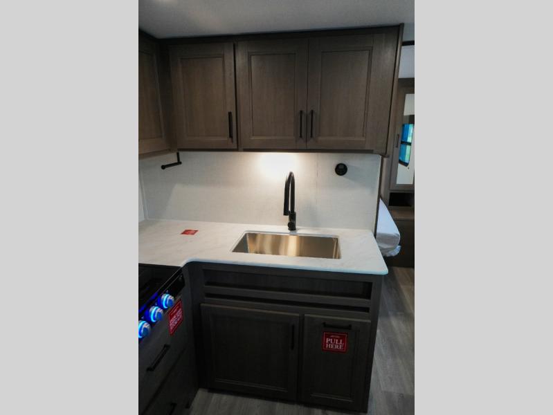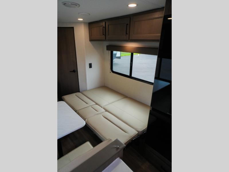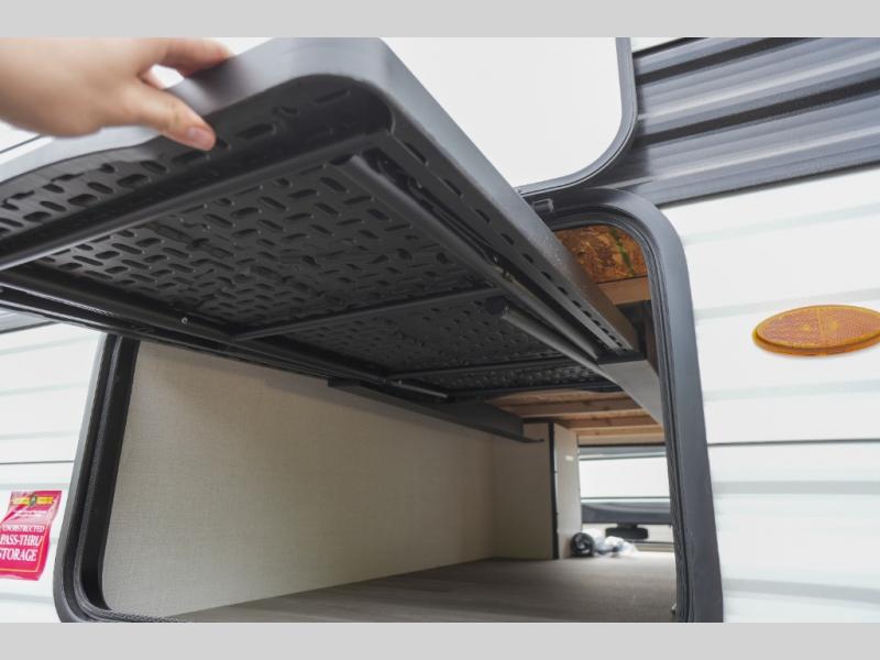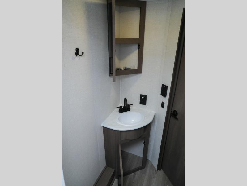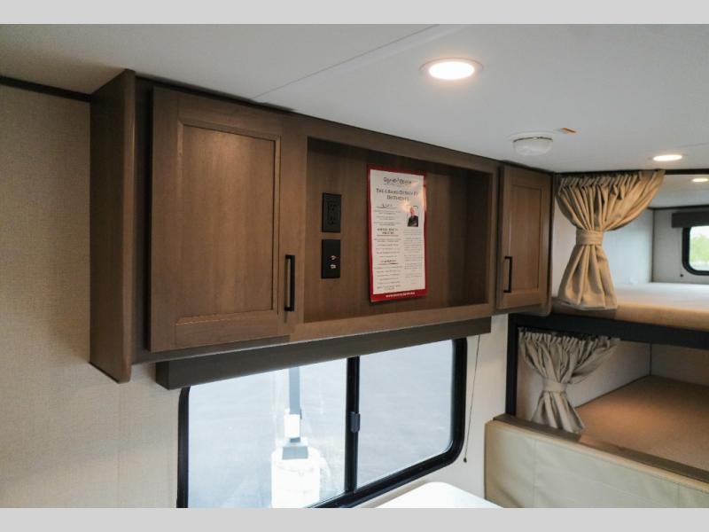 This is the perfect travel trailer if you like to camp with friends and family. Since there are double-size bunks, a queen bed in the front bedroom, plus a booth dinette and sofa, you can sleep eight campers each night! The three burner range and microwave in the kitchen will let you cook meals each day, and the 12V refrigerator will keep your cold items fresh. This model also includes a counter with extra storage underneath, a pull-out trash can storage for convenience, and a full bath to freshen up in each day. And you'll love having your own space in the front bedroom with a privacy curtain, dual wardrobes, and TV prep if you want to add a television!