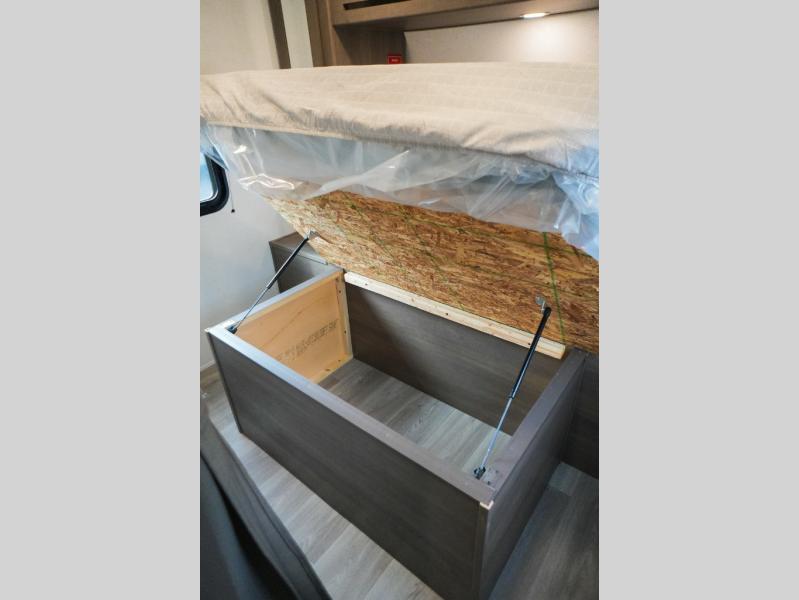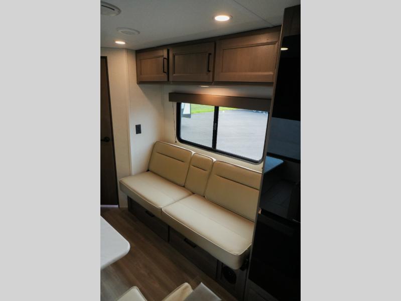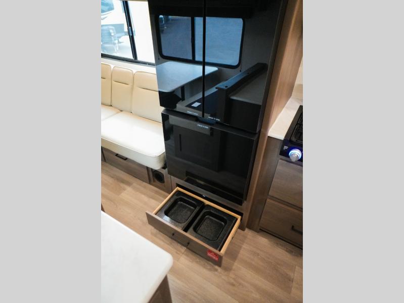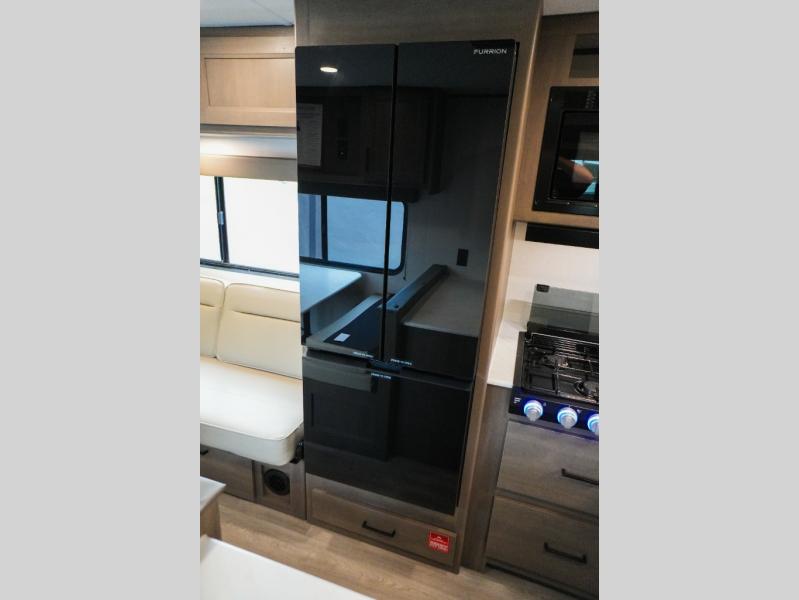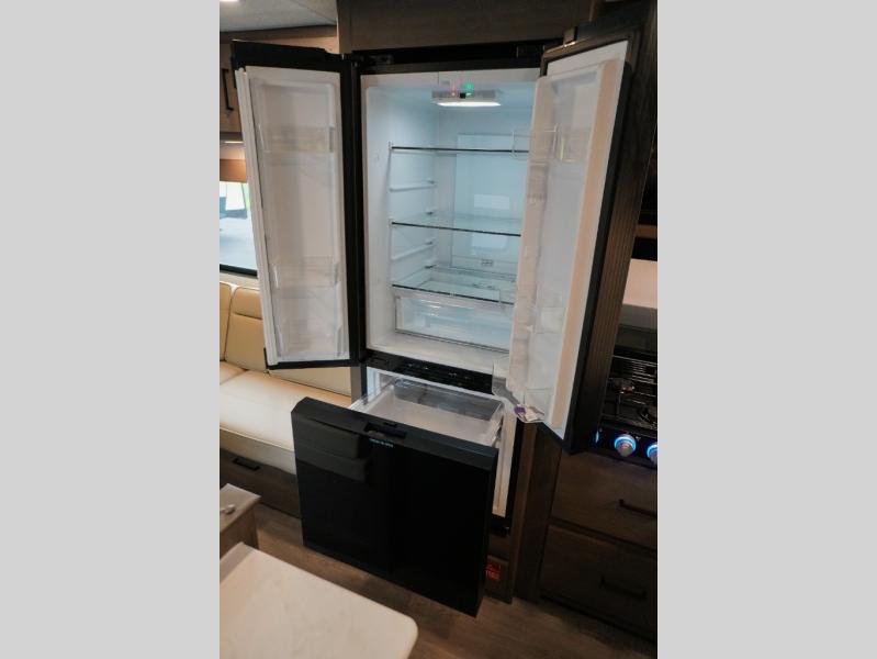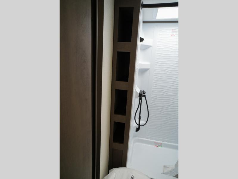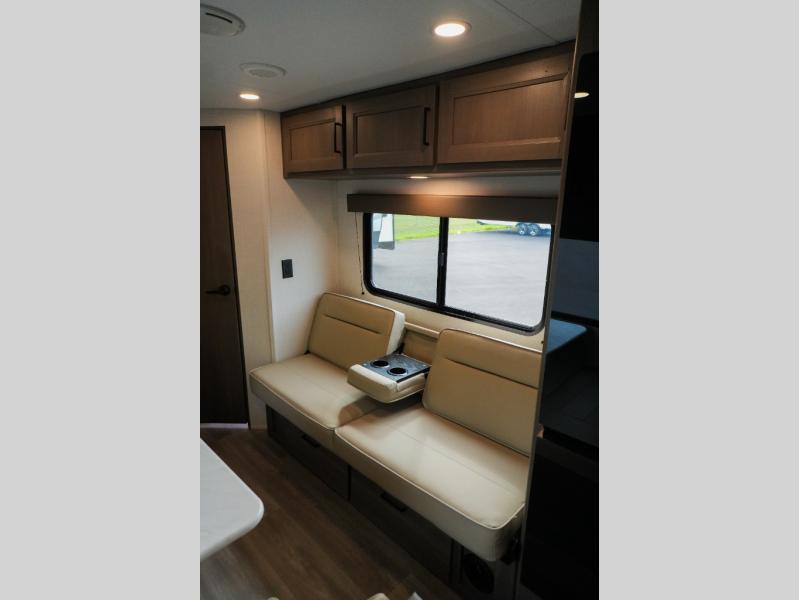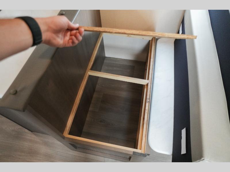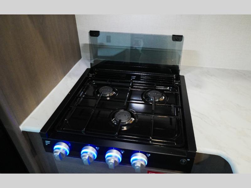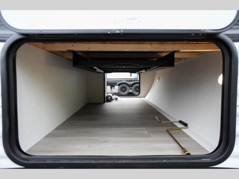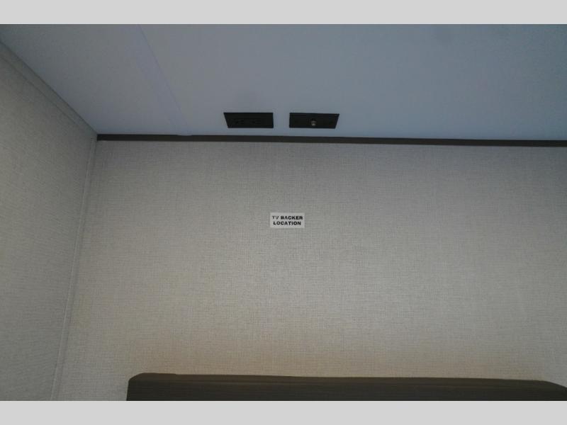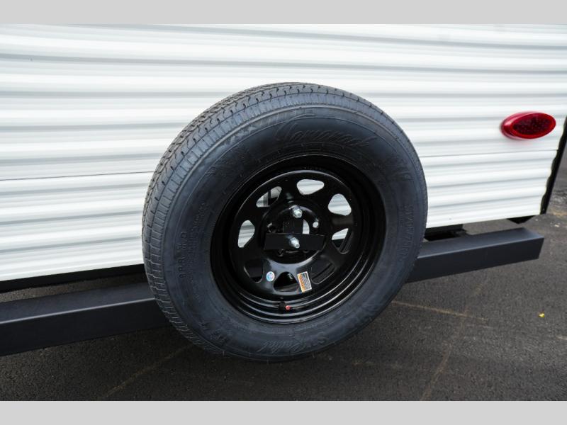 This is the perfect travel trailer if you like to camp with friends and family. Since there are double-size bunks, a queen bed in the front bedroom, plus a booth dinette and sofa, you can sleep eight campers each night! The three burner range and microwave in the kitchen will let you cook meals each day, and the 12V refrigerator will keep your cold items fresh. This model also includes a counter with extra storage underneath, a pull-out trash can storage for convenience, and a full bath to freshen up in each day. And you'll love having your own space in the front bedroom with a privacy curtain, dual wardrobes, and TV prep if you want to add a television!