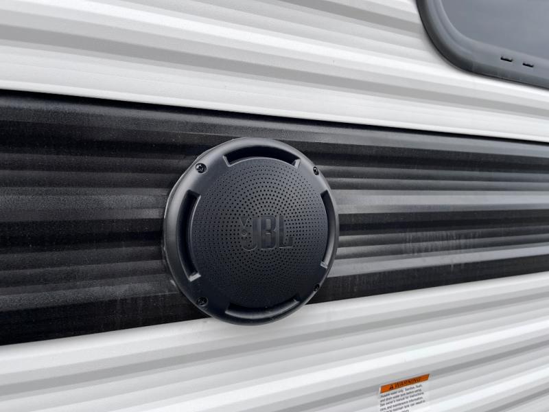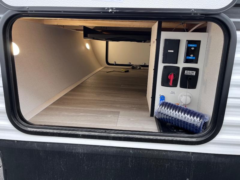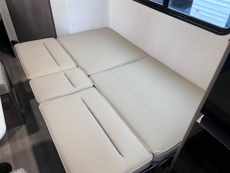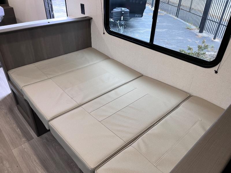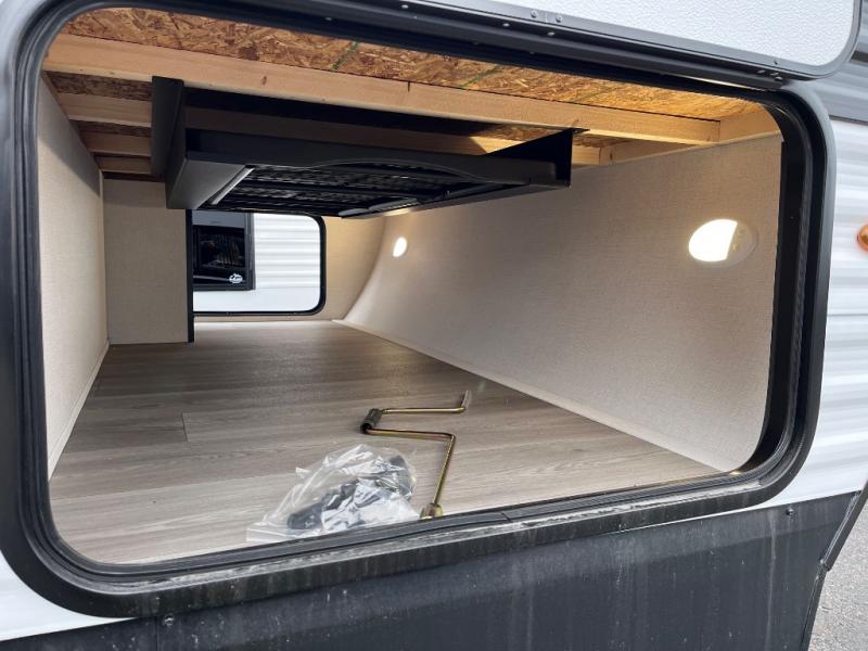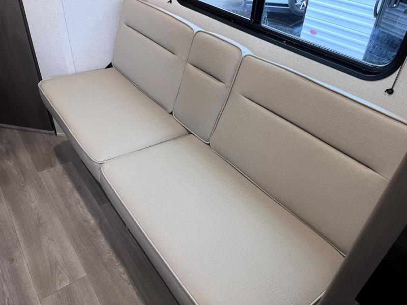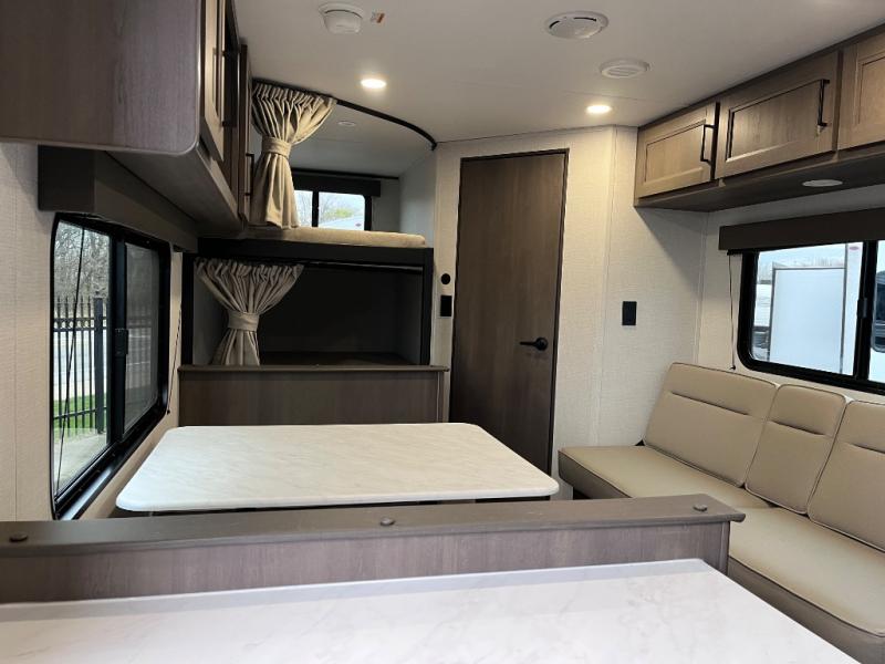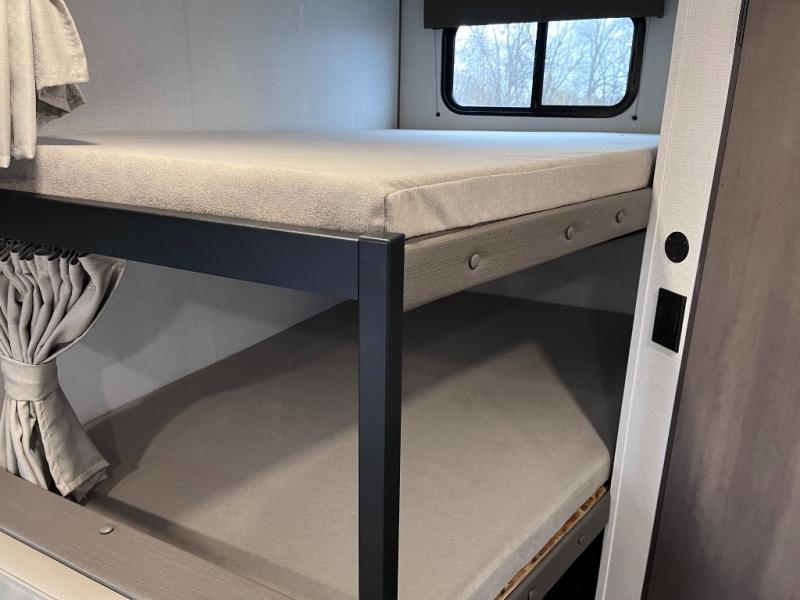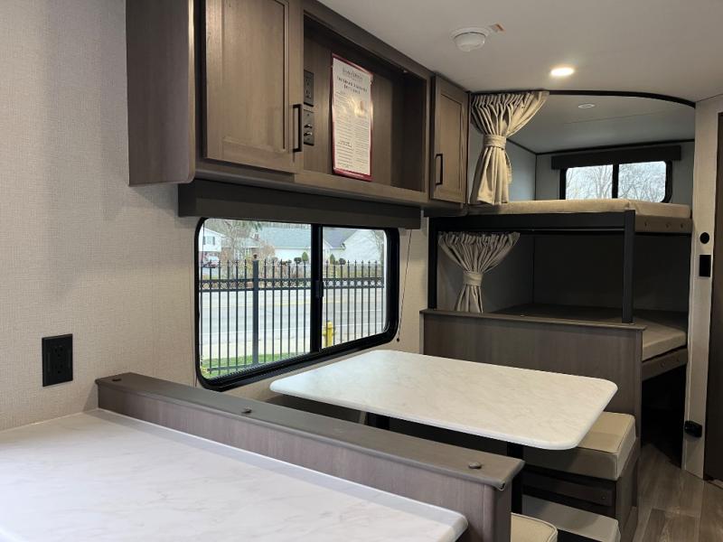 This is the perfect travel trailer if you like to camp with friends and family. Since there are double-size bunks, a queen bed in the front bedroom, plus a booth dinette and sofa, you can sleep eight campers each night! The three burner range and microwave in the kitchen will let you cook meals each day, and the 12V refrigerator will keep your cold items fresh. This model also includes a counter with extra storage underneath, a pull-out trash can storage for convenience, and a full bath to freshen up in each day. And you'll love having your own space in the front bedroom with a privacy curtain, dual wardrobes, and TV prep if you want to add a television!