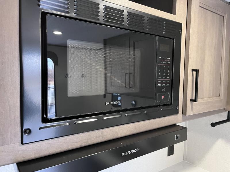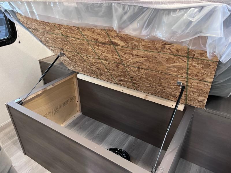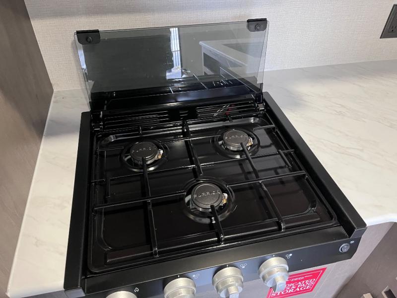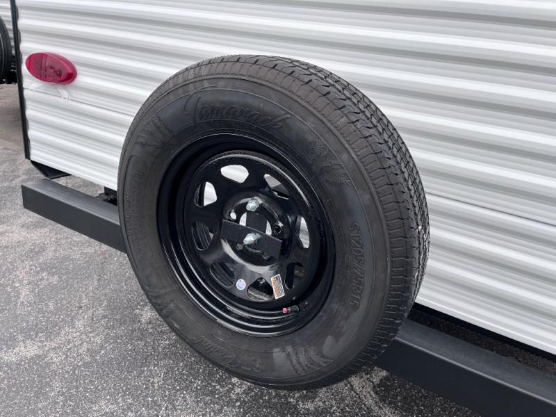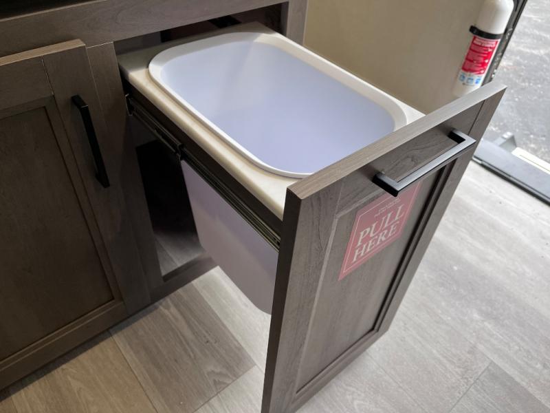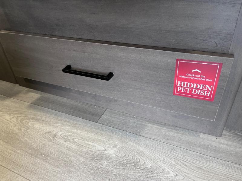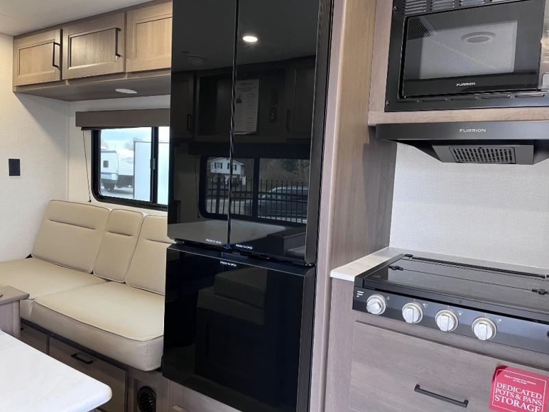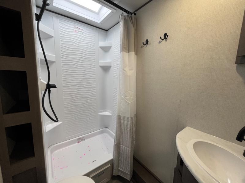 This is the perfect travel trailer if you like to camp with friends and family. Since there are double-size bunks, a queen bed in the front bedroom, plus a booth dinette and sofa, you can sleep eight campers each night! The three burner range and microwave in the kitchen will let you cook meals each day, and the 12V refrigerator will keep your cold items fresh. This model also includes a counter with extra storage underneath, a pull-out trash can storage for convenience, and a full bath to freshen up in each day. And you'll love having your own space in the front bedroom with a privacy curtain, dual wardrobes, and TV prep if you want to add a television!