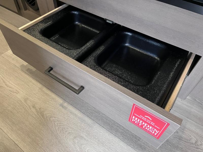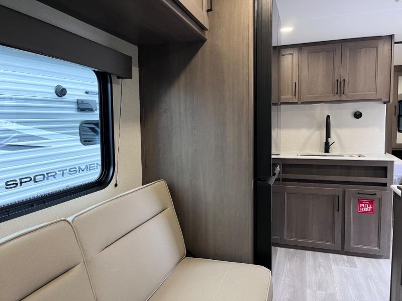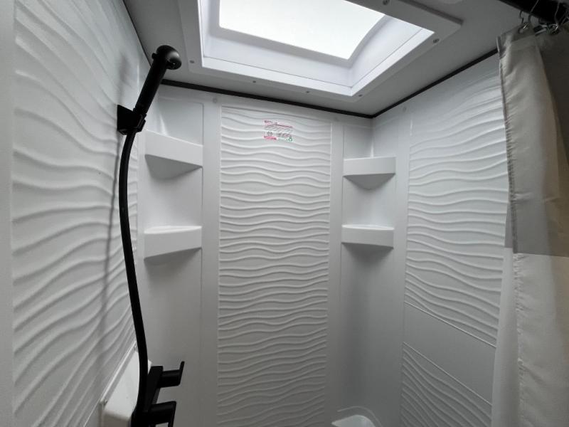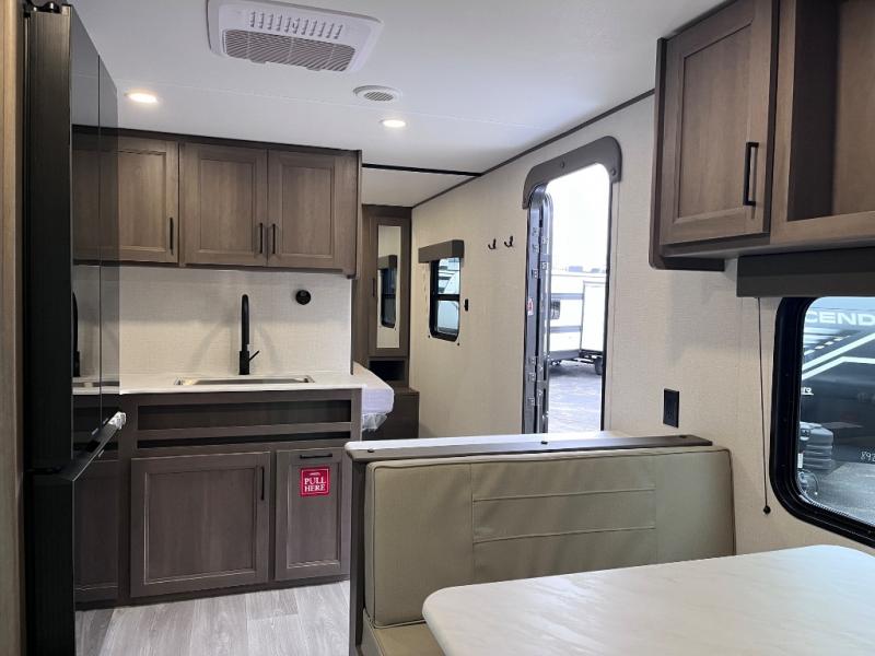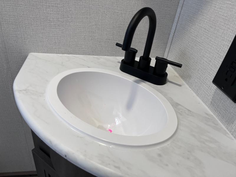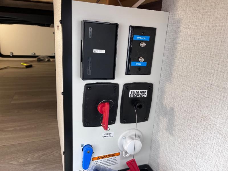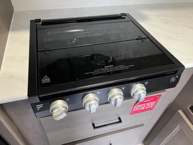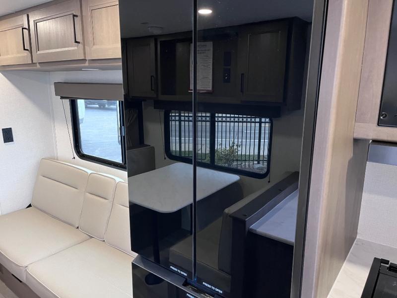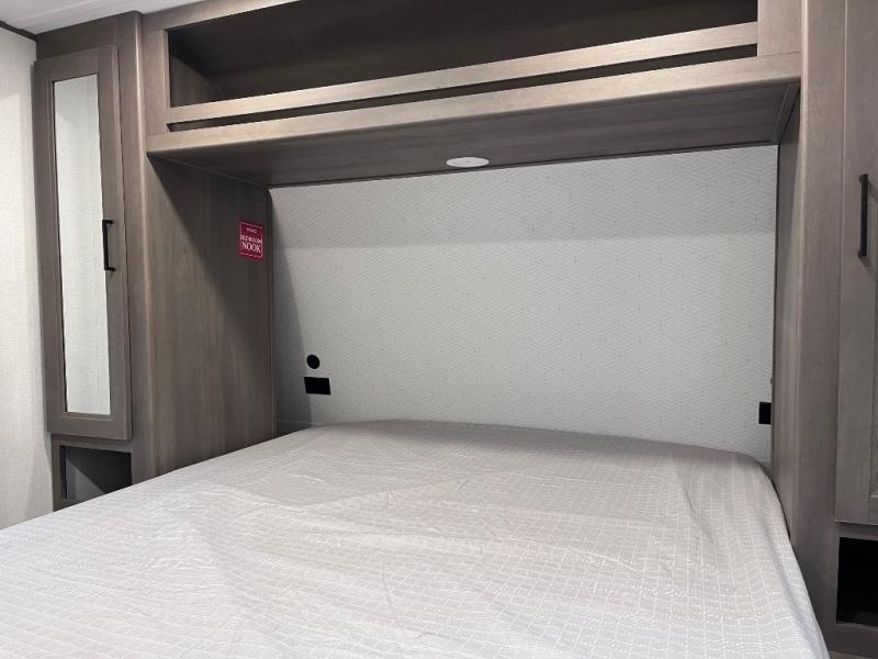 This is the perfect travel trailer if you like to camp with friends and family. Since there are double-size bunks, a queen bed in the front bedroom, plus a booth dinette and sofa, you can sleep eight campers each night! The three burner range and microwave in the kitchen will let you cook meals each day, and the 12V refrigerator will keep your cold items fresh. This model also includes a counter with extra storage underneath, a pull-out trash can storage for convenience, and a full bath to freshen up in each day. And you'll love having your own space in the front bedroom with a privacy curtain, dual wardrobes, and TV prep if you want to add a television!