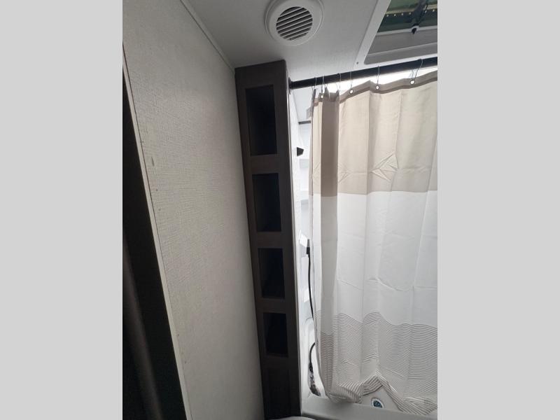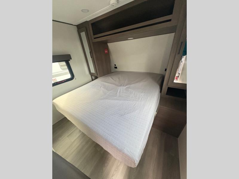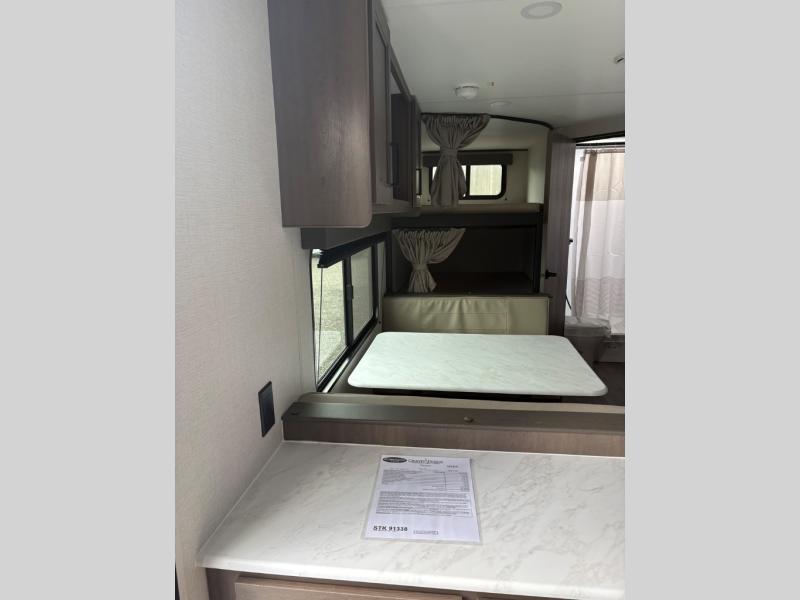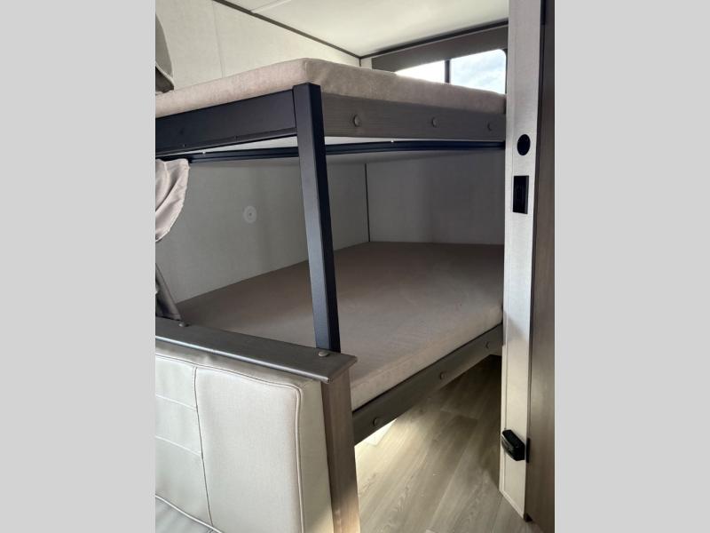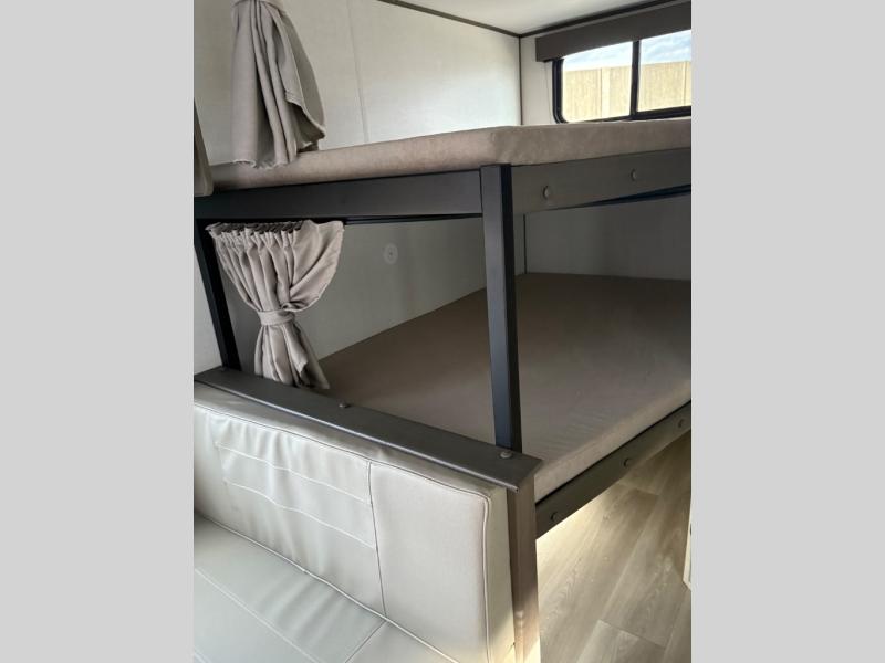This is the perfect travel trailer if you like to camp with friends and family. Since there are double-size bunks, a queen bed in the front bedroom, plus a booth dinette and sofa, you can sleep eight campers each night! The three burner range and microwave in the kitchen will let you cook meals each day, and the 12V refrigerator will keep your cold items fresh. This model also includes a counter with extra storage underneath, a pull-out trash can storage for convenience, and a full bath to freshen up in each day. And you'll love having your own space in the front bedroom with a privacy curtain, dual wardrobes, and TV prep if you want to add a television!