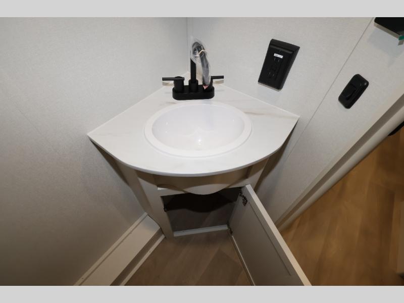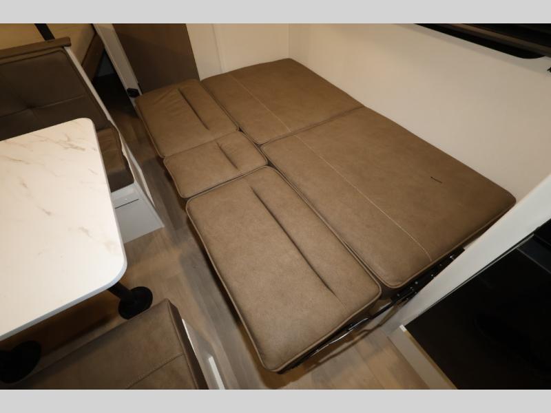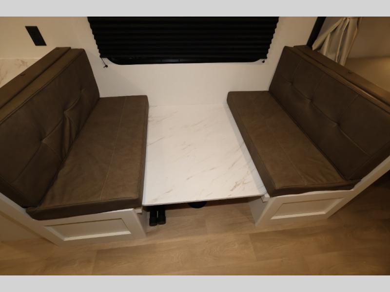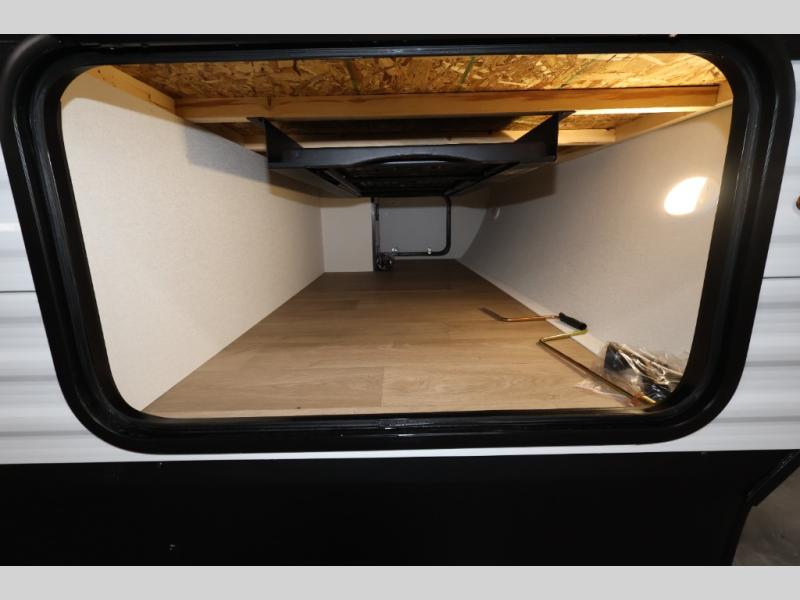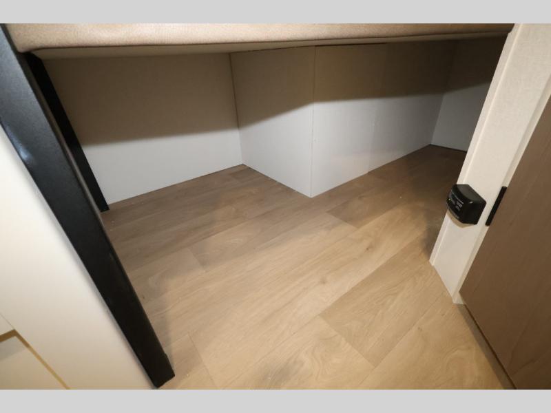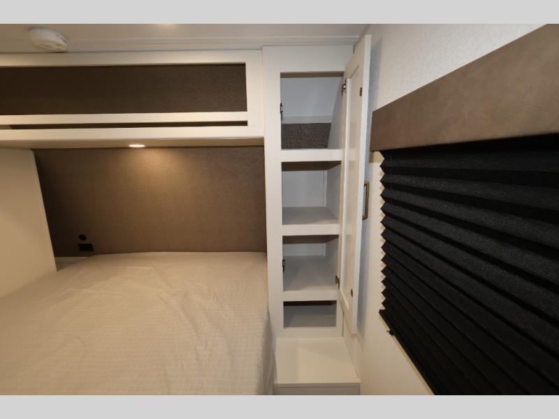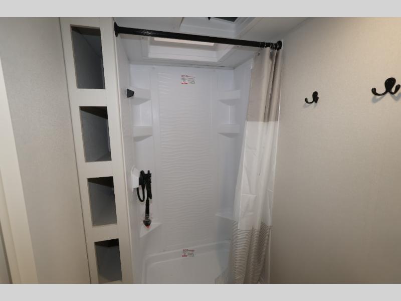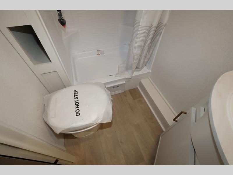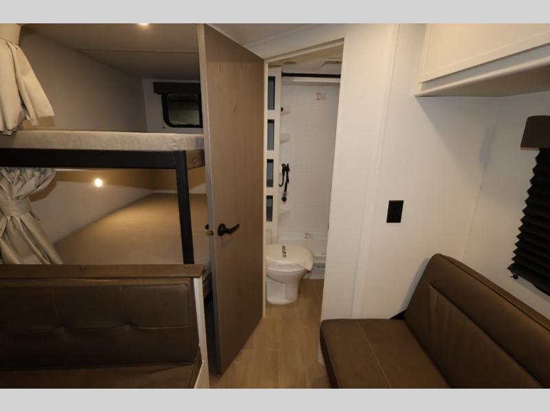 This is the perfect travel trailer if you like to camp with friends and family. Since there are double-size bunks, a queen bed in the front bedroom, plus a booth dinette and sofa, you can sleep eight campers each night! The three burner range and microwave in the kitchen will let you cook meals each day, and the 12V refrigerator will keep your cold items fresh. This model also includes a counter with extra storage underneath, a pull-out trash can storage for convenience, and a full bath to freshen up in each day. And you'll love having your own space in the front bedroom with a privacy curtain, dual wardrobes, and TV prep if you want to add a television!