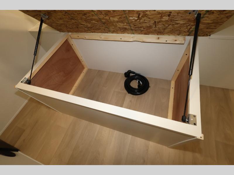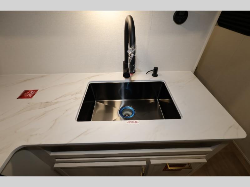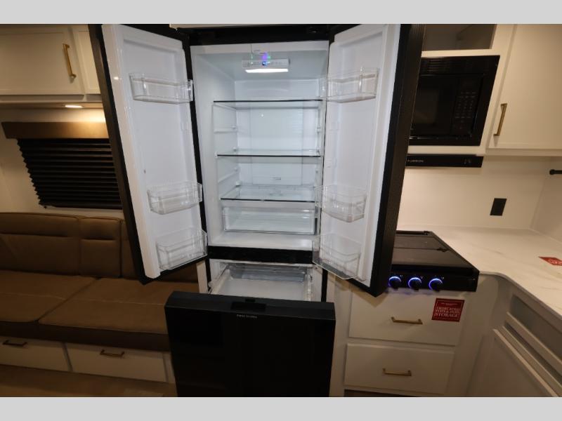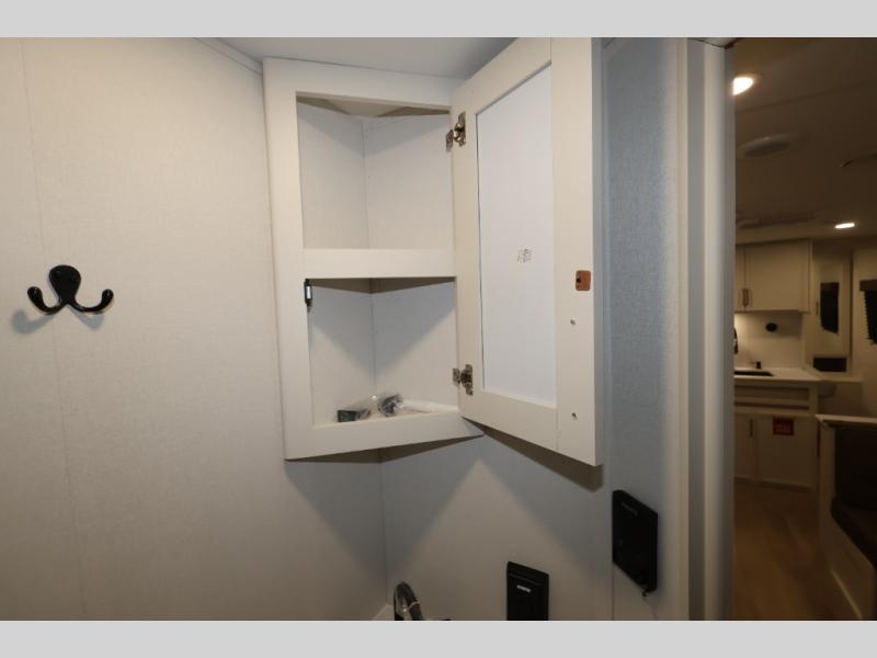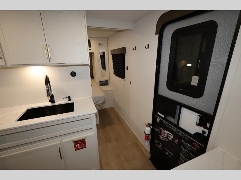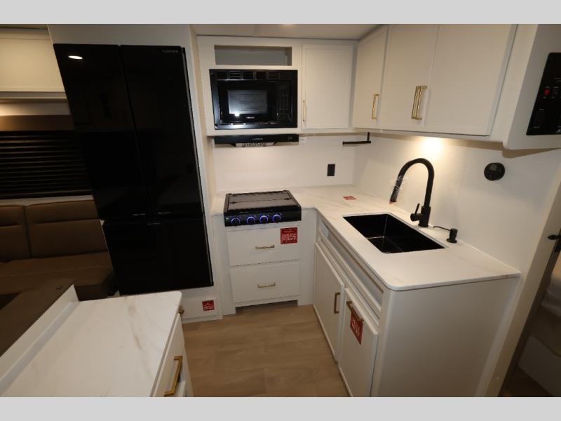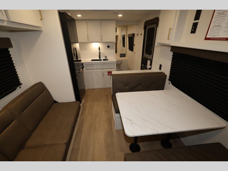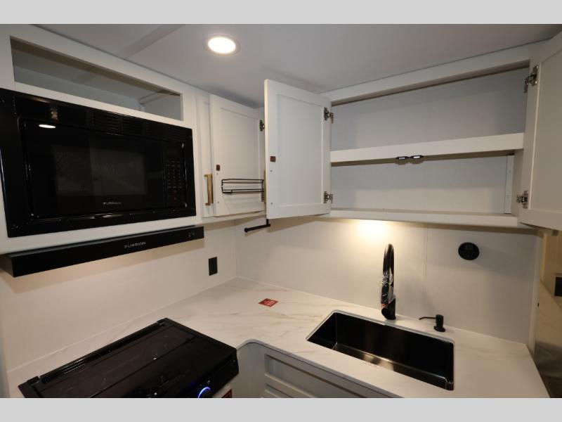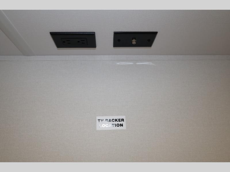 This is the perfect travel trailer if you like to camp with friends and family. Since there are double-size bunks, a queen bed in the front bedroom, plus a booth dinette and sofa, you can sleep eight campers each night! The three burner range and microwave in the kitchen will let you cook meals each day, and the 12V refrigerator will keep your cold items fresh. This model also includes a counter with extra storage underneath, a pull-out trash can storage for convenience, and a full bath to freshen up in each day. And you'll love having your own space in the front bedroom with a privacy curtain, dual wardrobes, and TV prep if you want to add a television!
