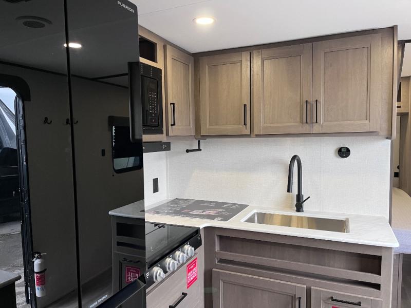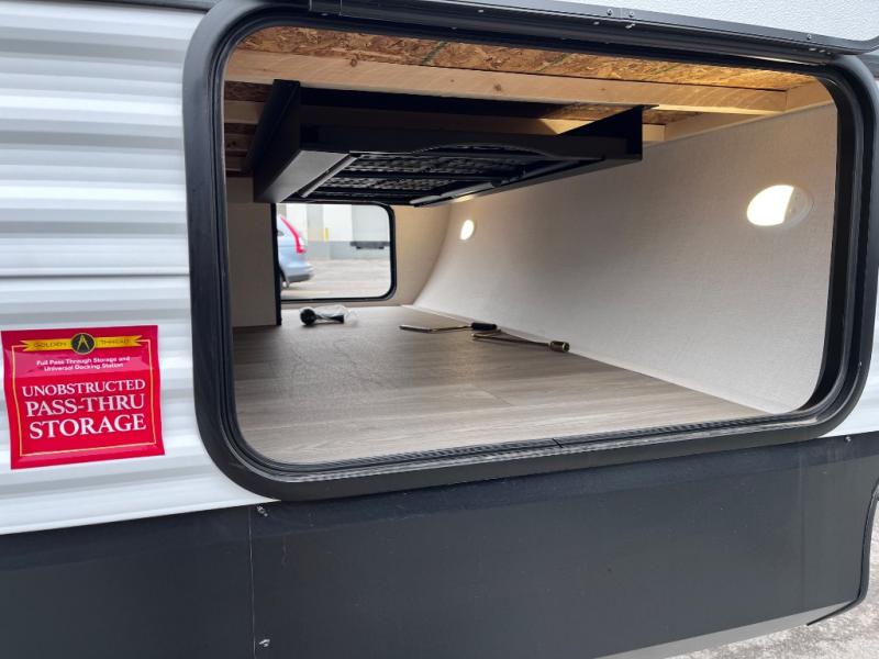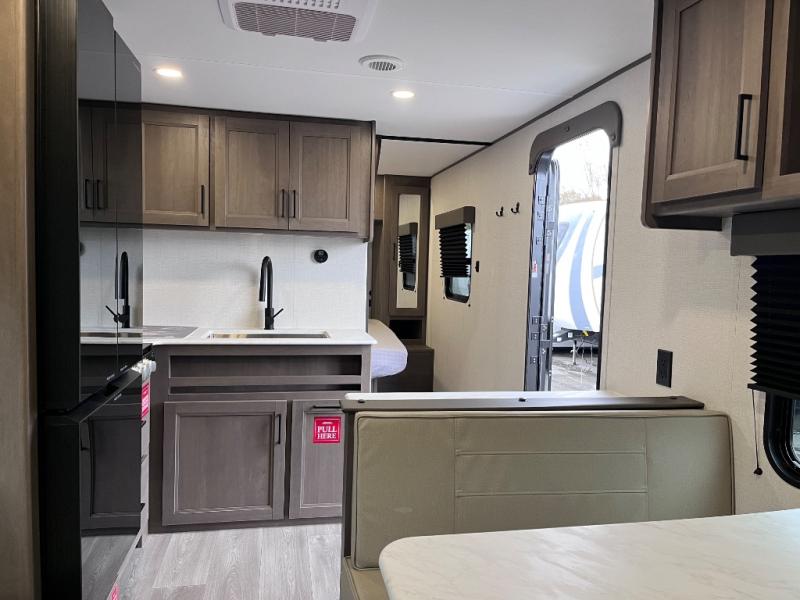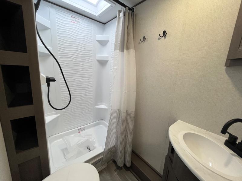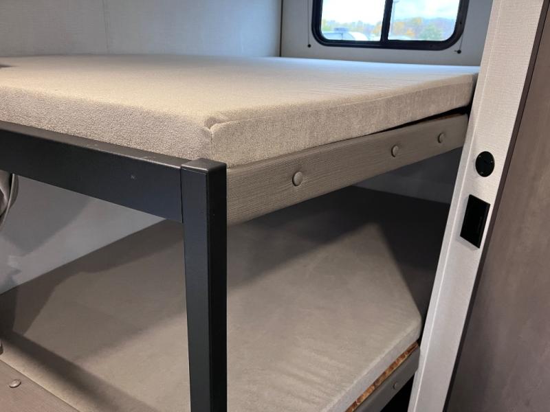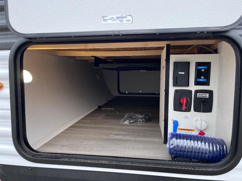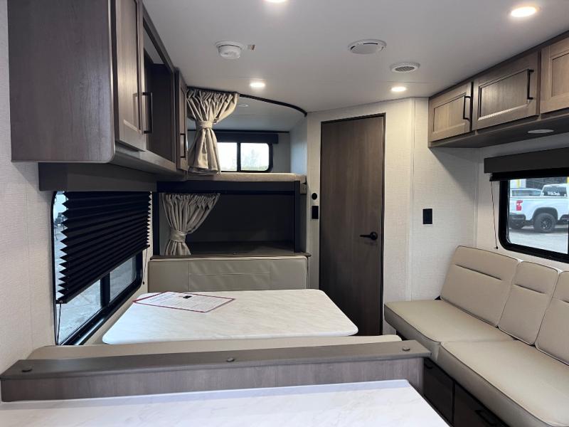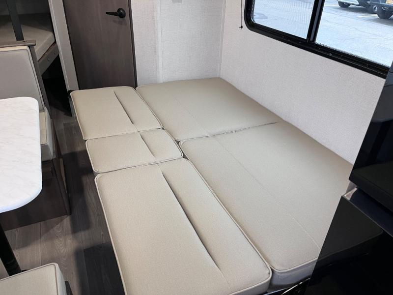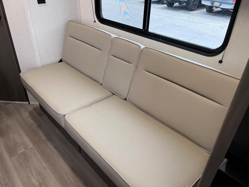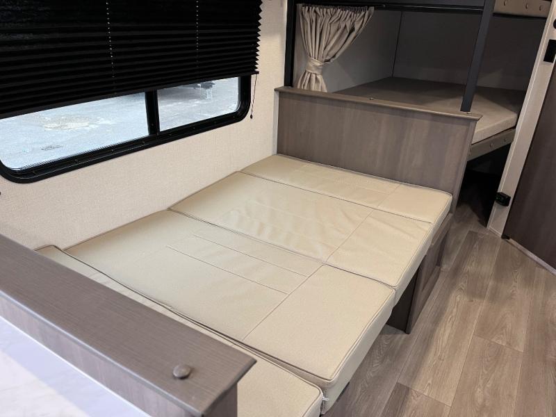 This is the perfect travel trailer if you like to camp with friends and family. Since there are double-size bunks, a queen bed in the front bedroom, plus a booth dinette and sofa, you can sleep eight campers each night! The three burner range and microwave in the kitchen will let you cook meals each day, and the 12V refrigerator will keep your cold items fresh. This model also includes a counter with extra storage underneath, a pull-out trash can storage for convenience, and a full bath to freshen up in each day. And you'll love having your own space in the front bedroom with a privacy curtain, dual wardrobes, and TV prep if you want to add a television!