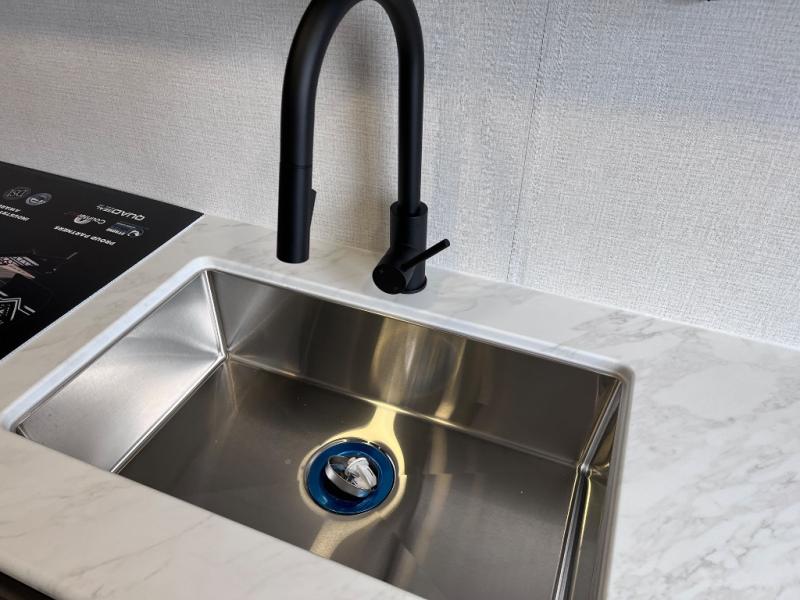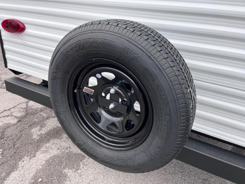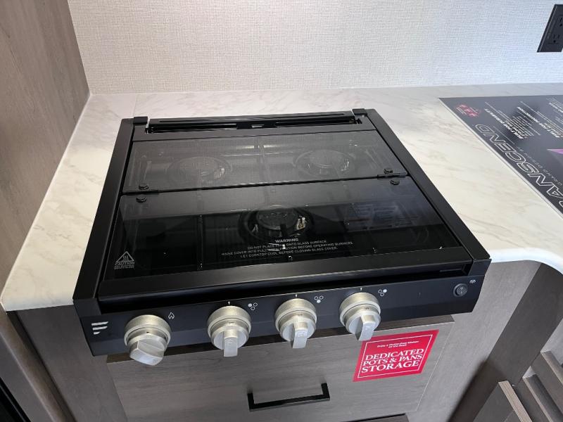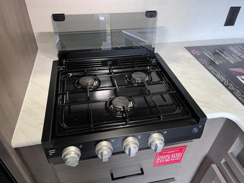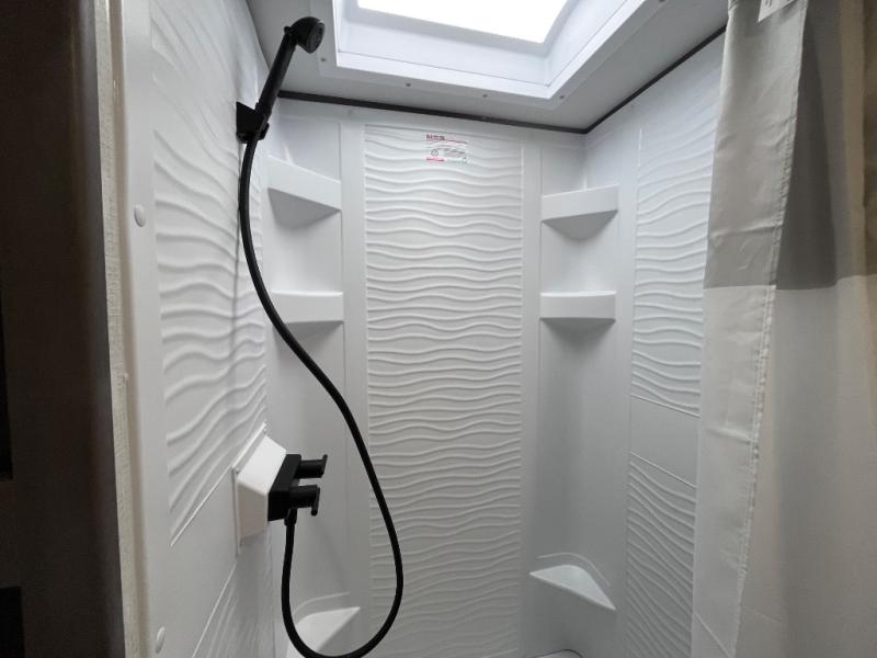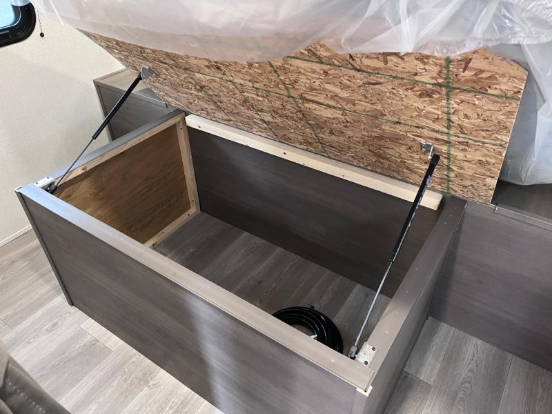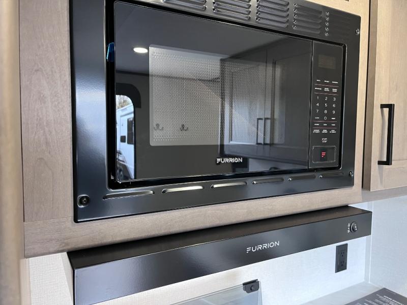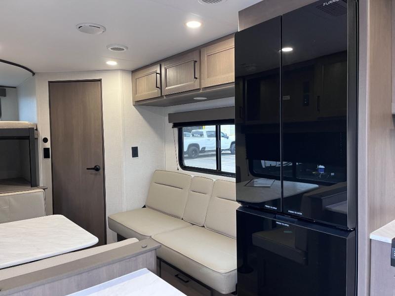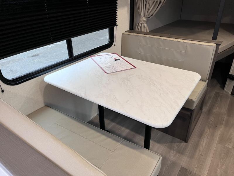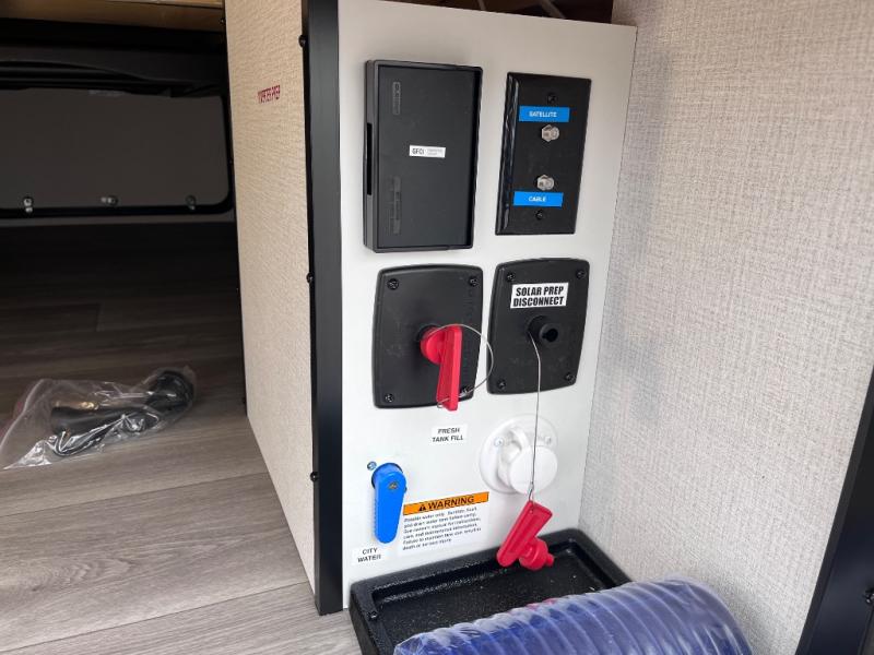 This is the perfect travel trailer if you like to camp with friends and family. Since there are double-size bunks, a queen bed in the front bedroom, plus a booth dinette and sofa, you can sleep eight campers each night! The three burner range and microwave in the kitchen will let you cook meals each day, and the 12V refrigerator will keep your cold items fresh. This model also includes a counter with extra storage underneath, a pull-out trash can storage for convenience, and a full bath to freshen up in each day. And you'll love having your own space in the front bedroom with a privacy curtain, dual wardrobes, and TV prep if you want to add a television!