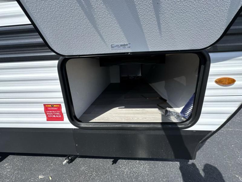This is the perfect travel trailer if you like to camp with friends and family. Since there are double-size bunks, a queen bed in the front bedroom, plus a booth dinette and sofa, you can sleep eight campers each night! The three burner range and microwave in the kitchen will let you cook meals each day, and the 12V refrigerator will keep your cold items fresh. This model also includes a counter with extra storage underneath, a pull-out trash can storage for convenience, and a full bath to freshen up in each day. And you'll love having your own space in the front bedroom with a privacy curtain, dual wardrobes, and TV prep if you want to add a television!