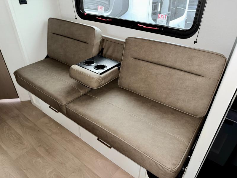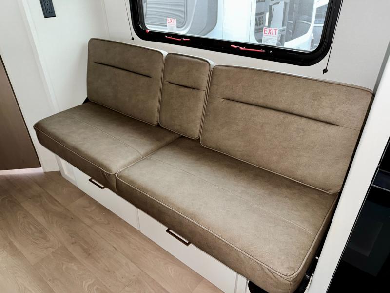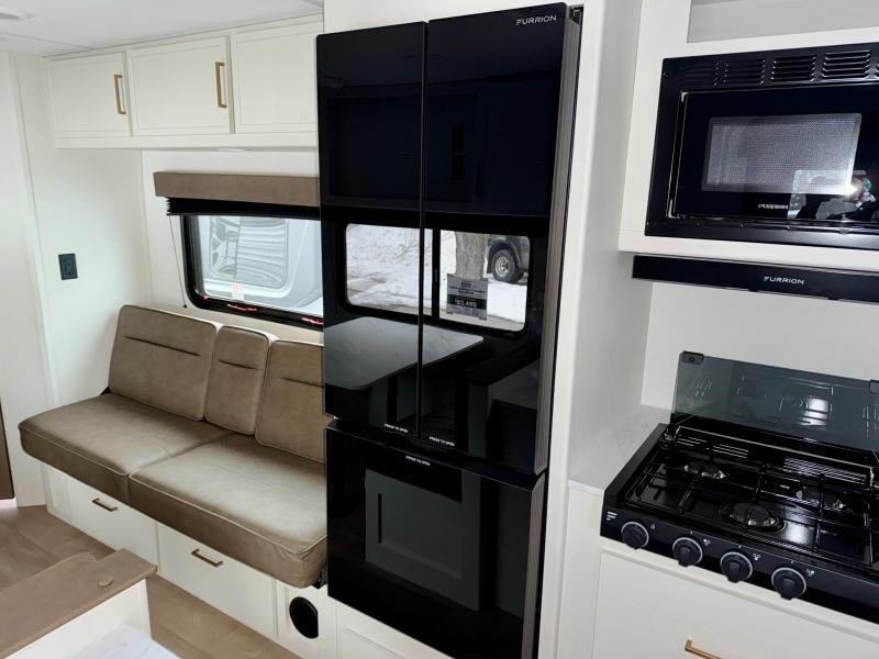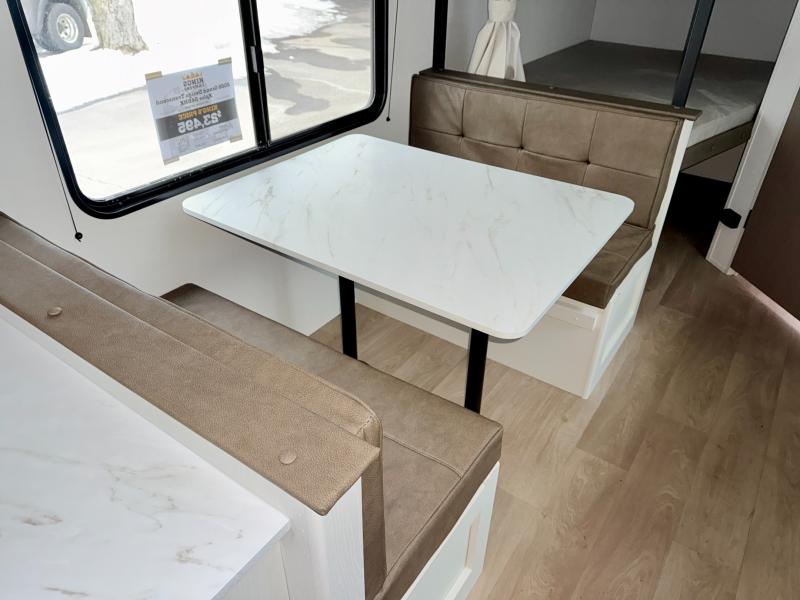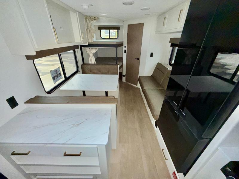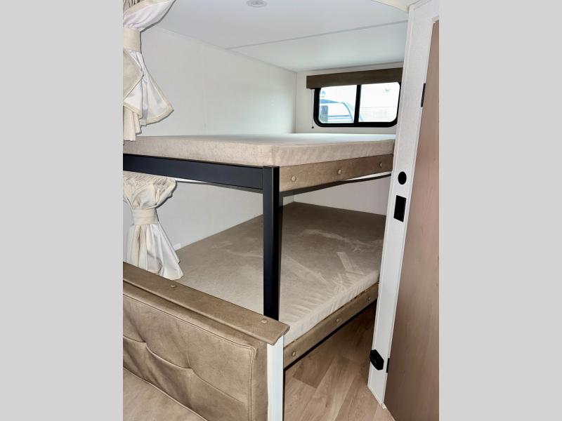This is the perfect travel trailer if you like to camp with friends and family. Since there are double-size bunks, a queen bed in the front bedroom, plus a booth dinette and sofa, you can sleep eight campers each night! The three burner range and microwave in the kitchen will let you cook meals each day, and the 12V refrigerator will keep your cold items fresh. This model also includes a counter with extra storage underneath, a pull-out trash can storage for convenience, and a full bath to freshen up in each day. And you'll love having your own space in the front bedroom with a privacy curtain, dual wardrobes, and TV prep if you want to add a television!