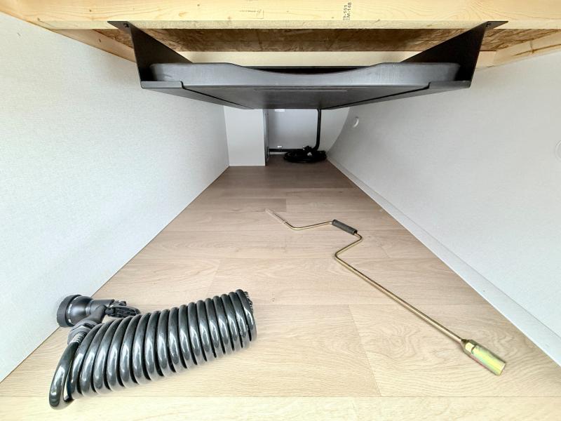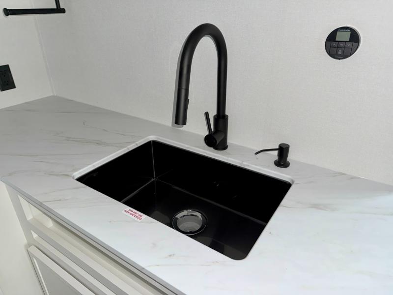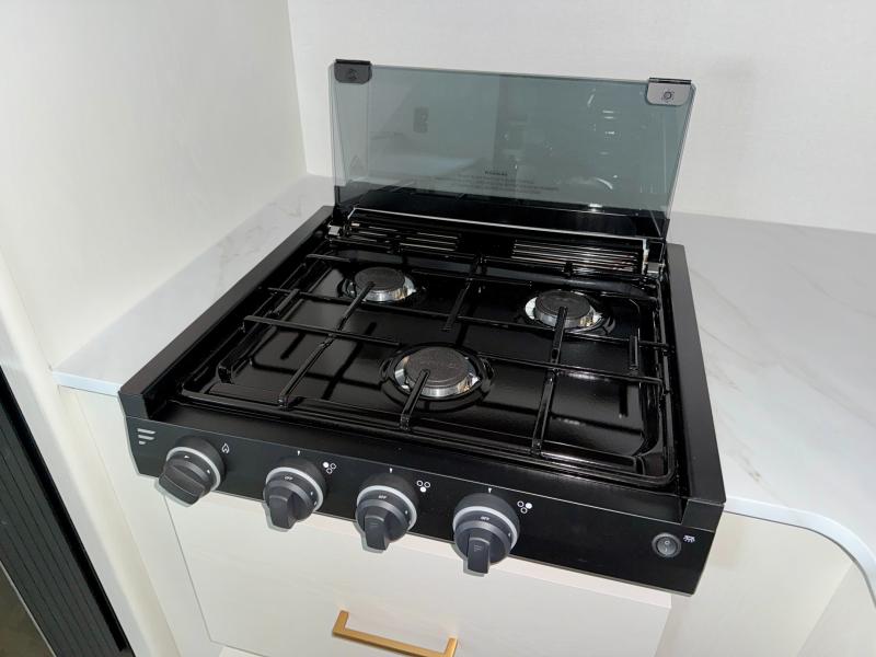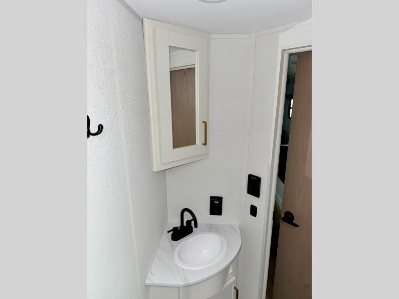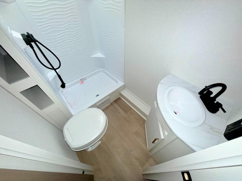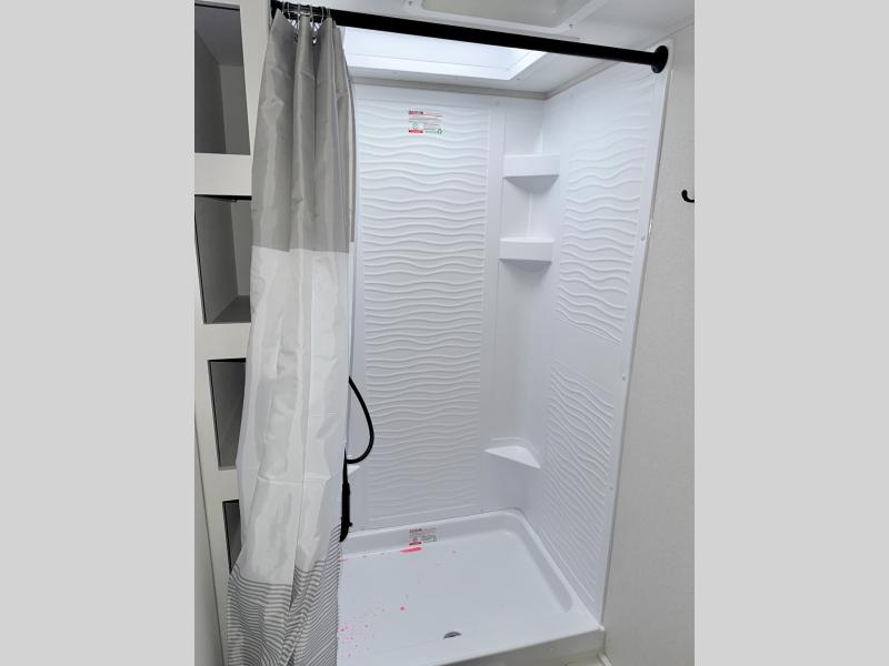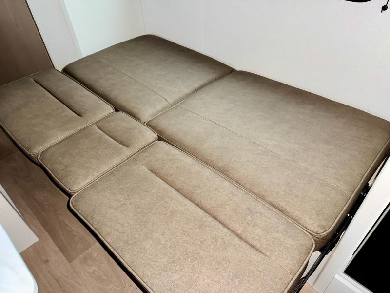 This is the perfect travel trailer if you like to camp with friends and family. Since there are double-size bunks, a queen bed in the front bedroom, plus a booth dinette and sofa, you can sleep eight campers each night! The three burner range and microwave in the kitchen will let you cook meals each day, and the 12V refrigerator will keep your cold items fresh. This model also includes a counter with extra storage underneath, a pull-out trash can storage for convenience, and a full bath to freshen up in each day. And you'll love having your own space in the front bedroom with a privacy curtain, dual wardrobes, and TV prep if you want to add a television!