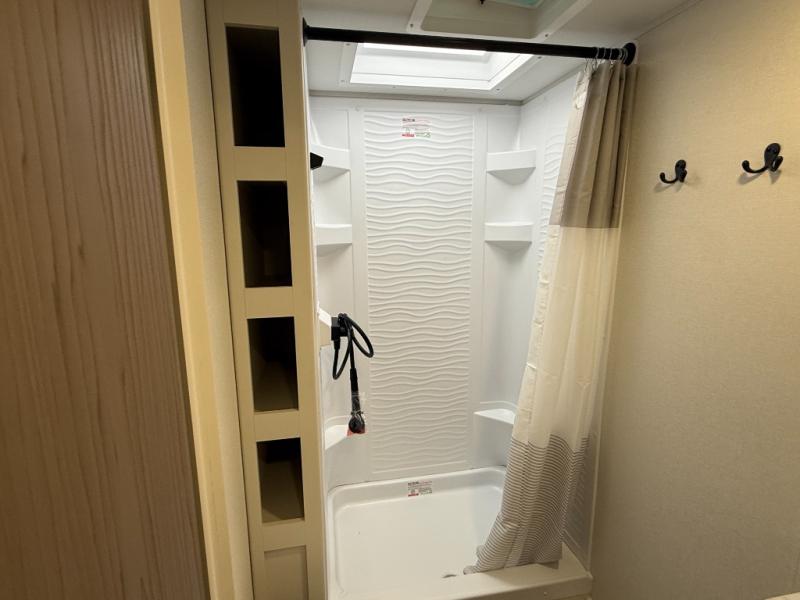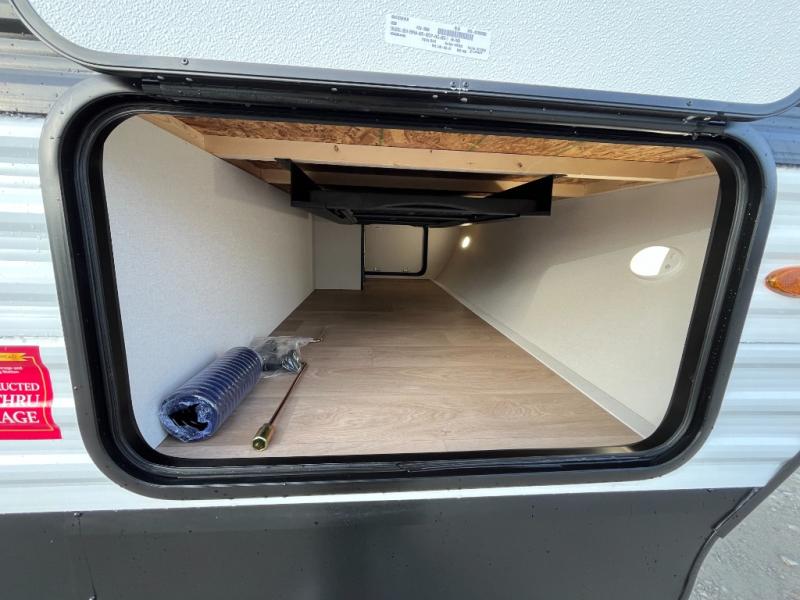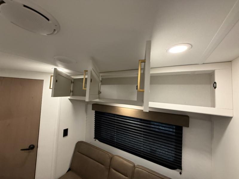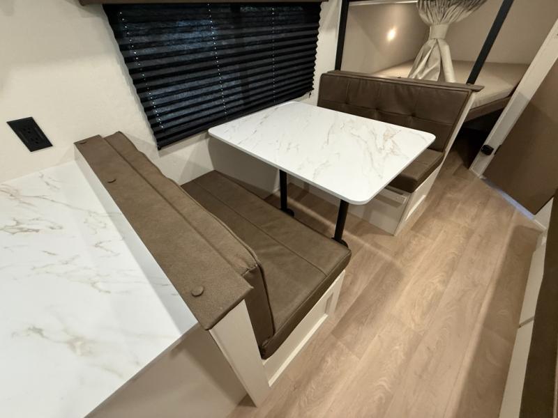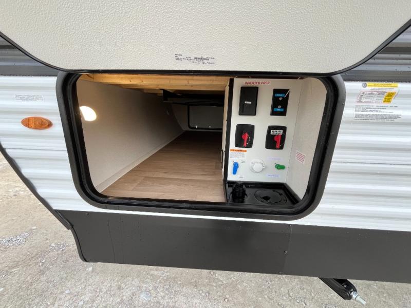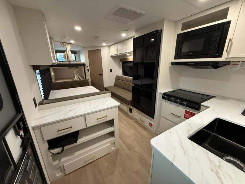 This is the perfect travel trailer if you like to camp with friends and family. Since there are double-size bunks, a queen bed in the front bedroom, plus a booth dinette and sofa, you can sleep eight campers each night! The three burner range and microwave in the kitchen will let you cook meals each day, and the 12V refrigerator will keep your cold items fresh. This model also includes a counter with extra storage underneath, a pull-out trash can storage for convenience, and a full bath to freshen up in each day. And you'll love having your own space in the front bedroom with a privacy curtain, dual wardrobes, and TV prep if you want to add a television!