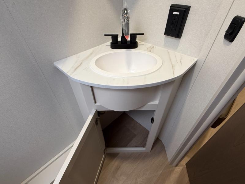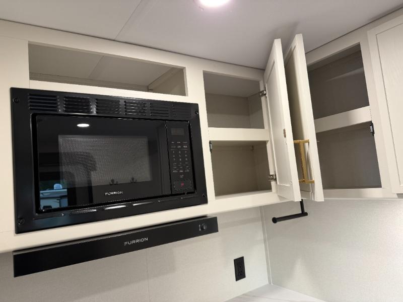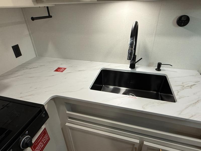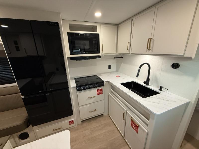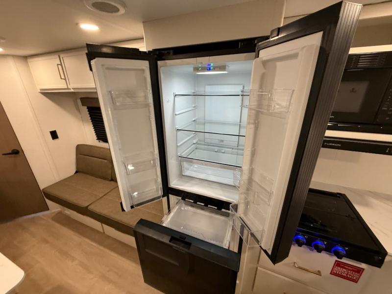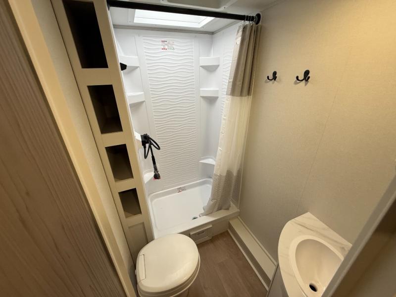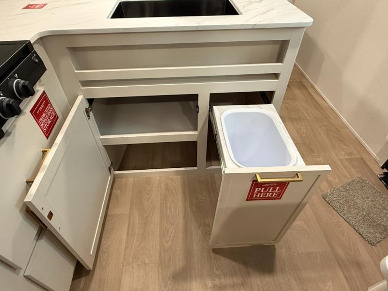 This is the perfect travel trailer if you like to camp with friends and family. Since there are double-size bunks, a queen bed in the front bedroom, plus a booth dinette and sofa, you can sleep eight campers each night! The three burner range and microwave in the kitchen will let you cook meals each day, and the 12V refrigerator will keep your cold items fresh. This model also includes a counter with extra storage underneath, a pull-out trash can storage for convenience, and a full bath to freshen up in each day. And you'll love having your own space in the front bedroom with a privacy curtain, dual wardrobes, and TV prep if you want to add a television!
