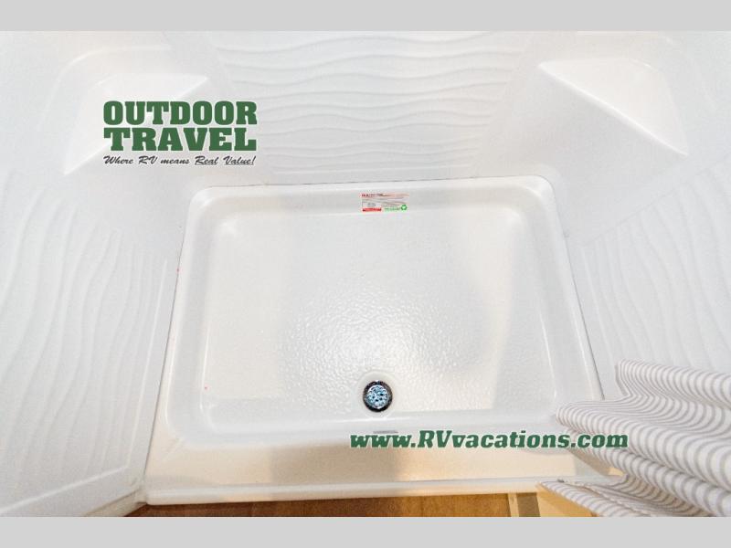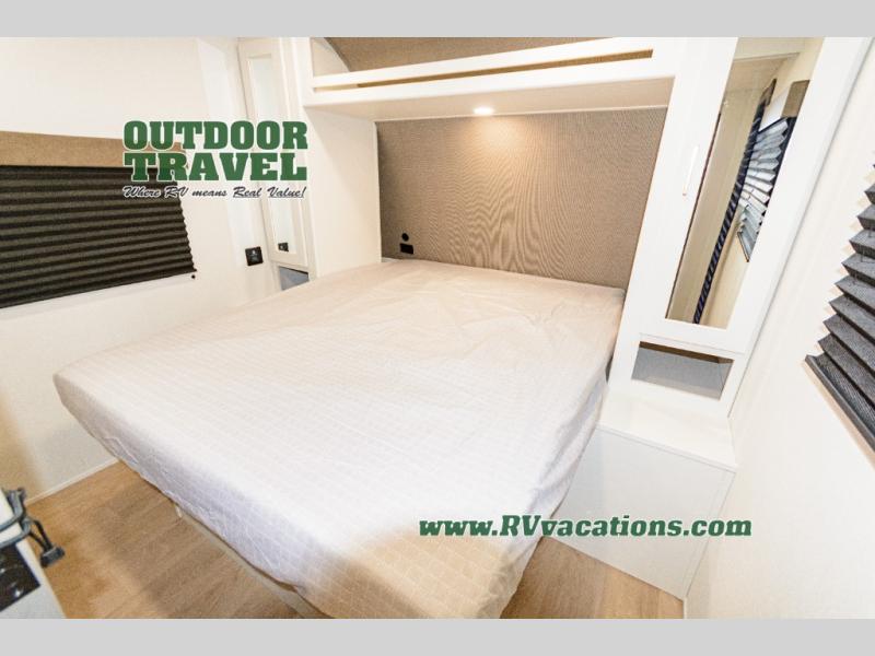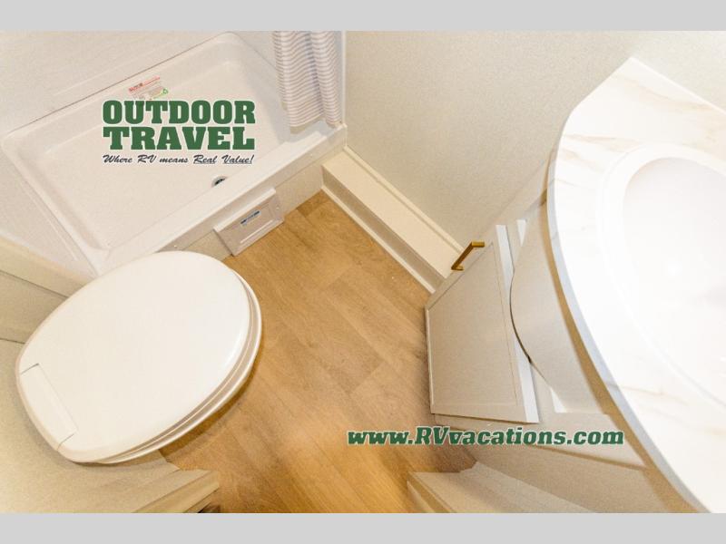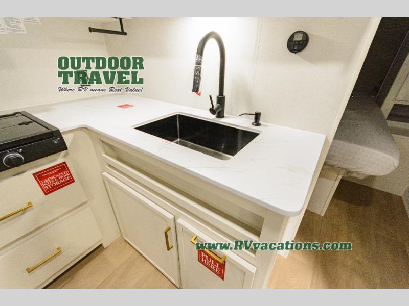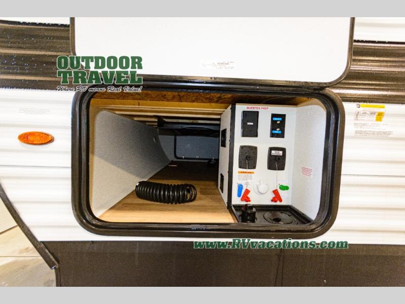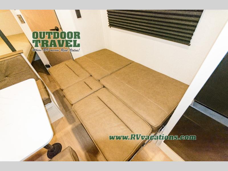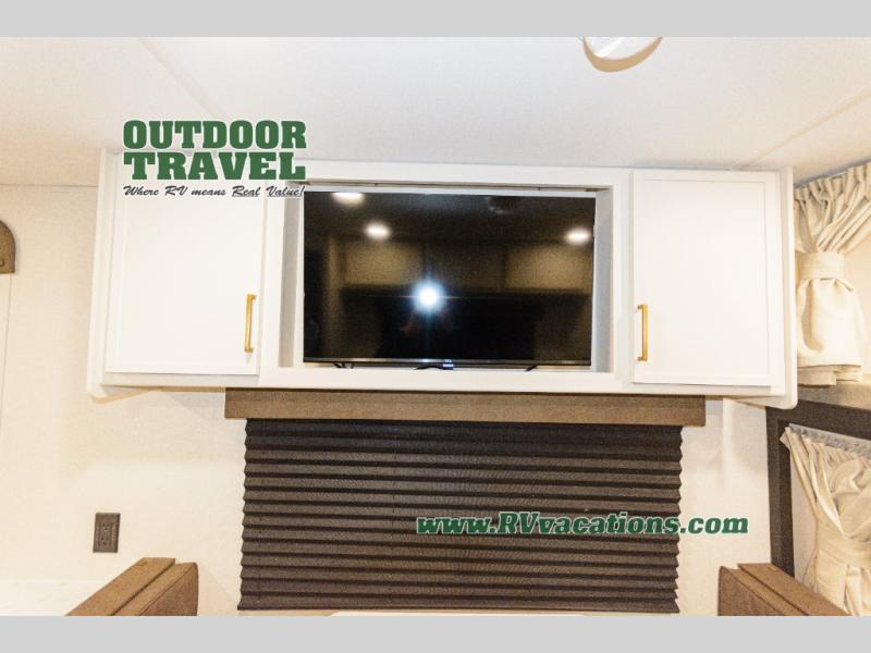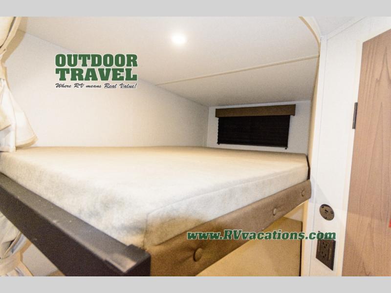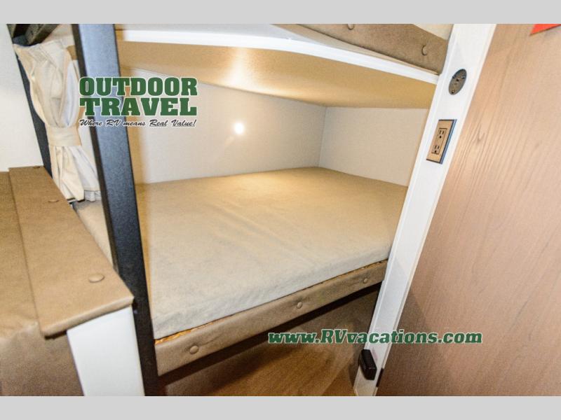 This is the perfect travel trailer if you like to camp with friends and family. Since there are double-size bunks, a queen bed in the front bedroom, plus a booth dinette and sofa, you can sleep eight campers each night! The three burner range and microwave in the kitchen will let you cook meals each day, and the 12V refrigerator will keep your cold items fresh. This model also includes a counter with extra storage underneath, a pull-out trash can storage for convenience, and a full bath to freshen up in each day. And you'll love having your own space in the front bedroom with a privacy curtain, dual wardrobes, and TV prep if you want to add a television!
