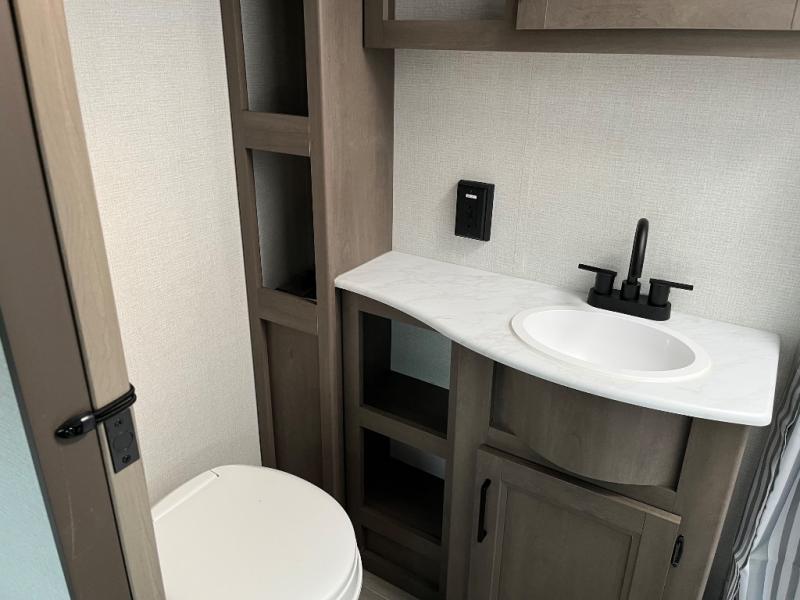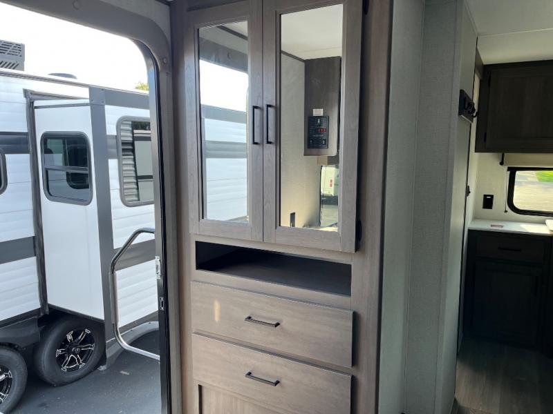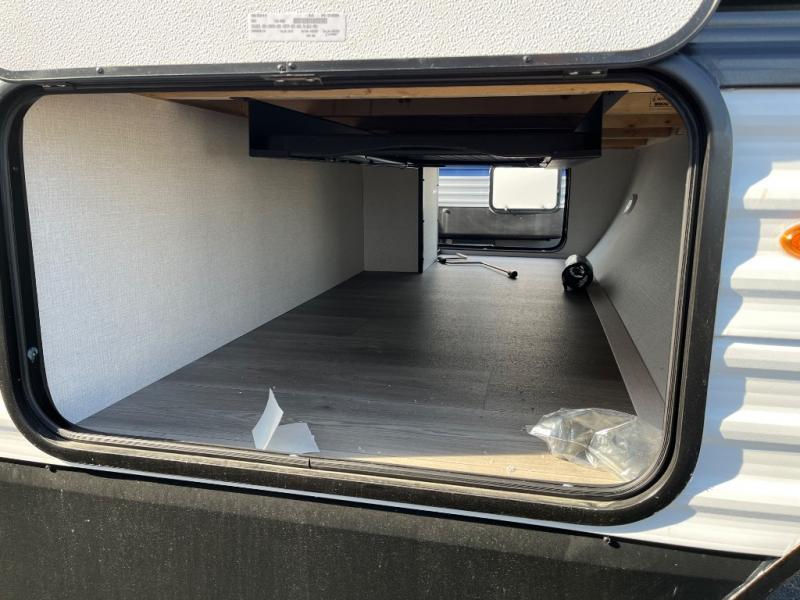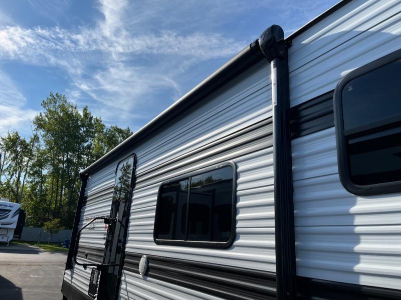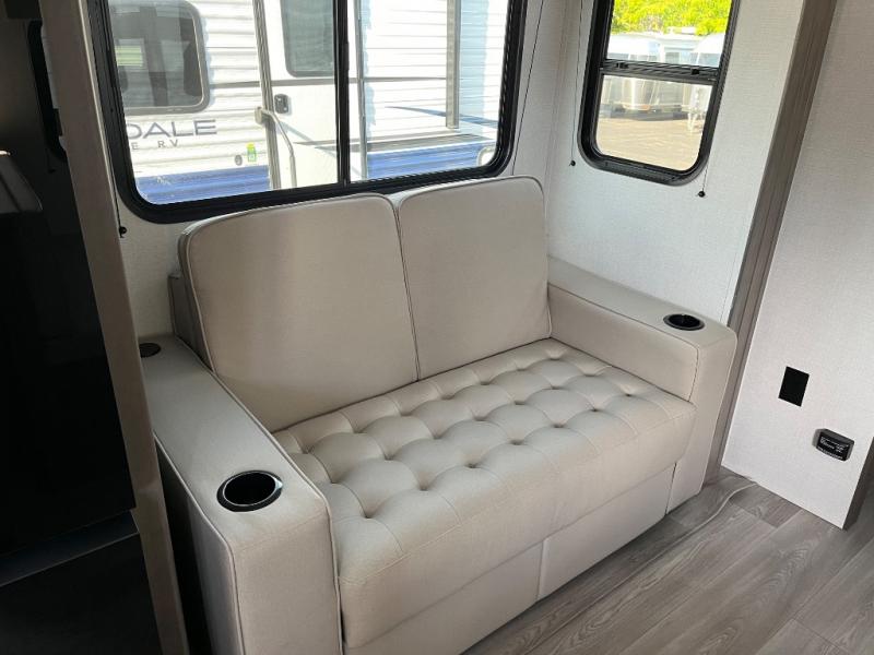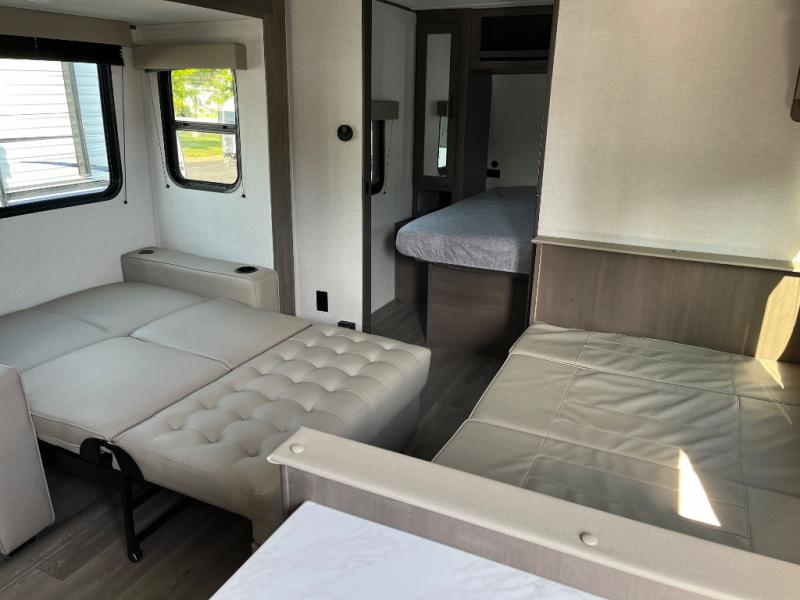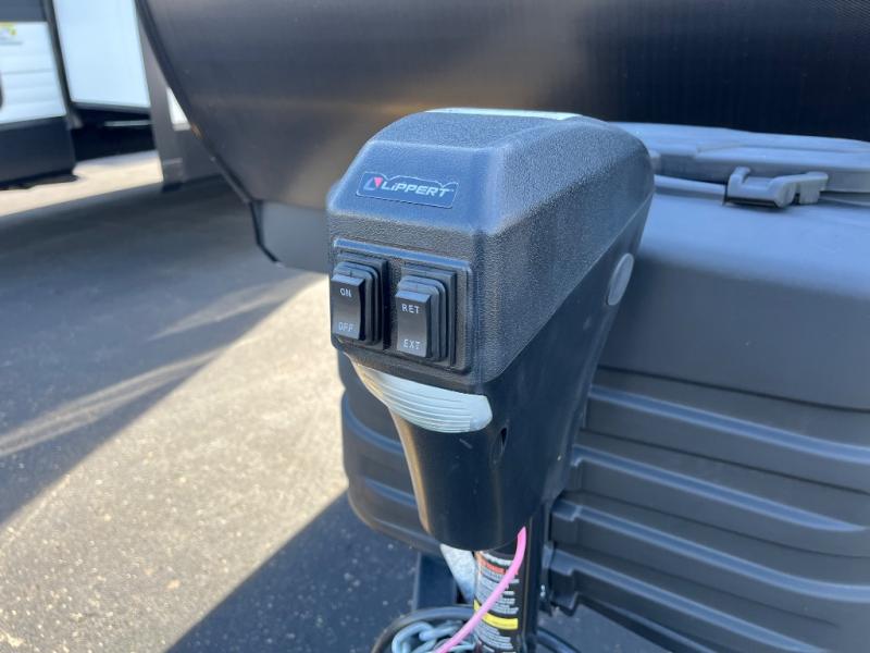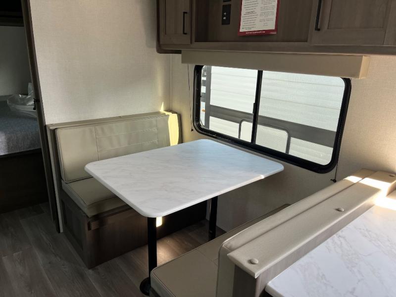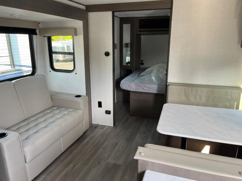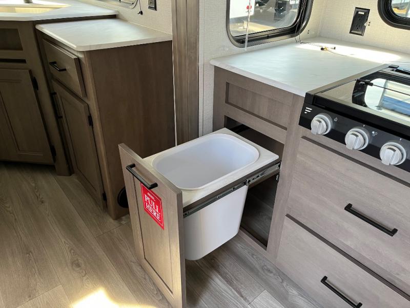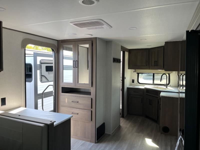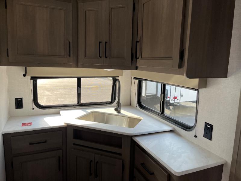 It will be so easy to enjoy camping trips in this travel trailer for five to six! The main living area is made spacious by the large slide out, and here you'll find the 60" sleeper sofa and the kitchen appliances. A booth dinette across the room provides a place to dine and play board games, or you can head outdoors to sit under the 17' power awning with LED lights. The queen bed in the front private bedroom will have you feeling right at home, and the TV prep here gives you the option to watch movies in bed. This model also includes a rear corner kitchen with ample counter space and a large sink, and you'll find the full bath in the other rear corner!