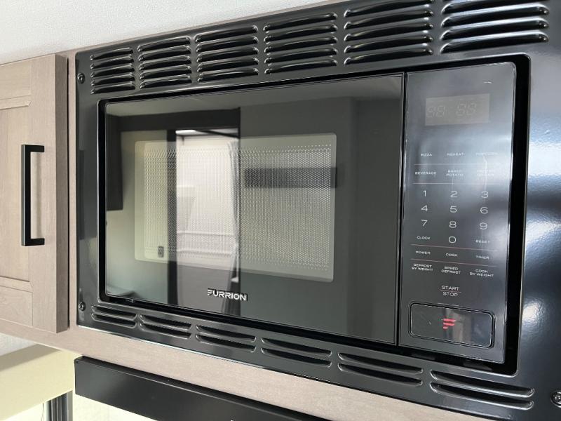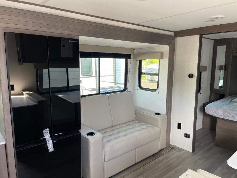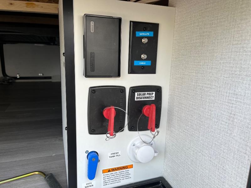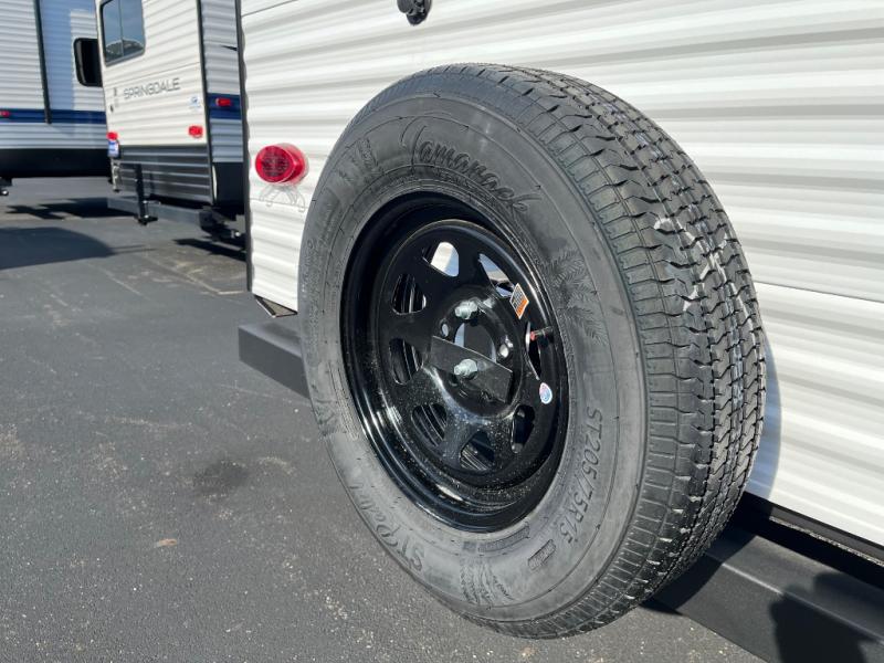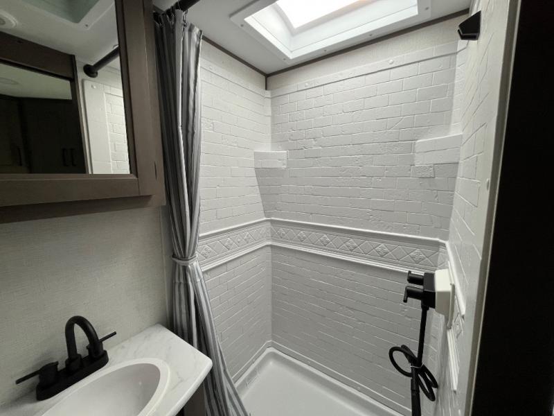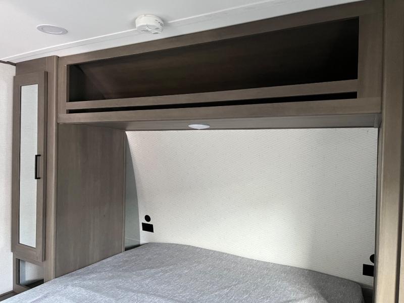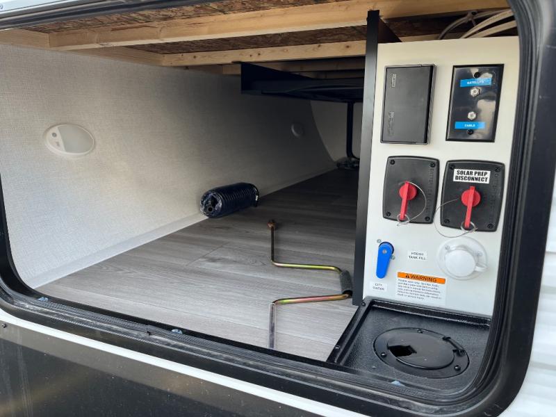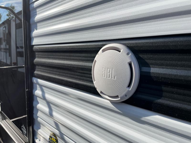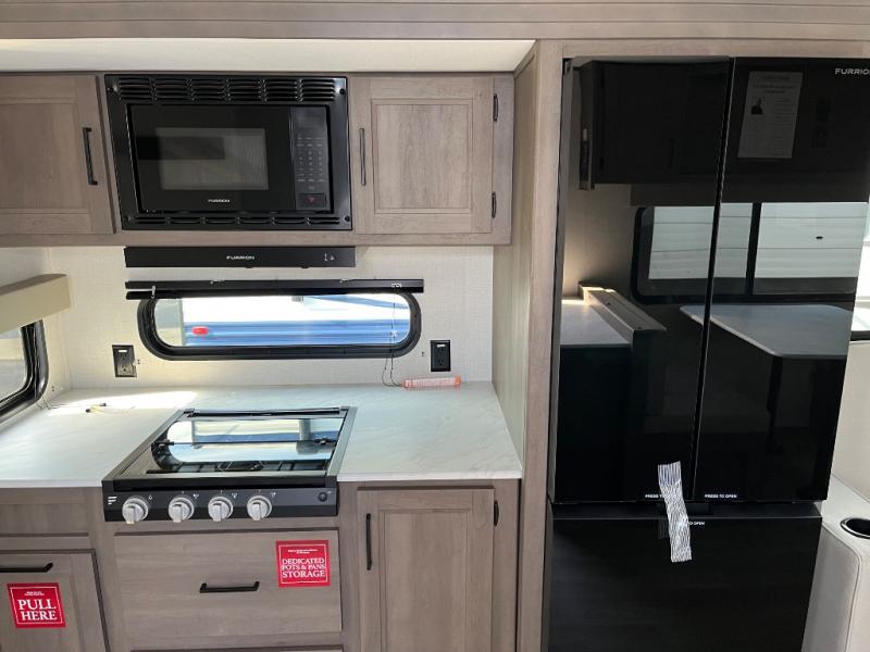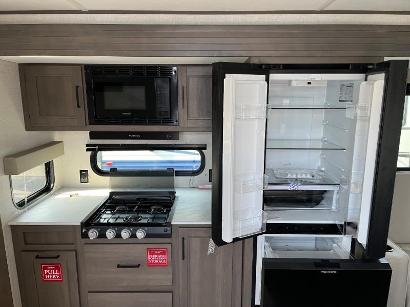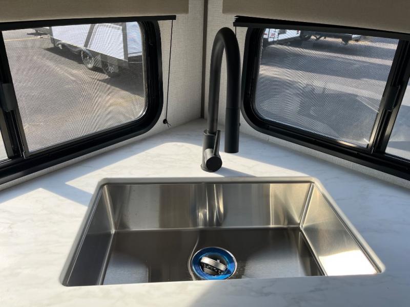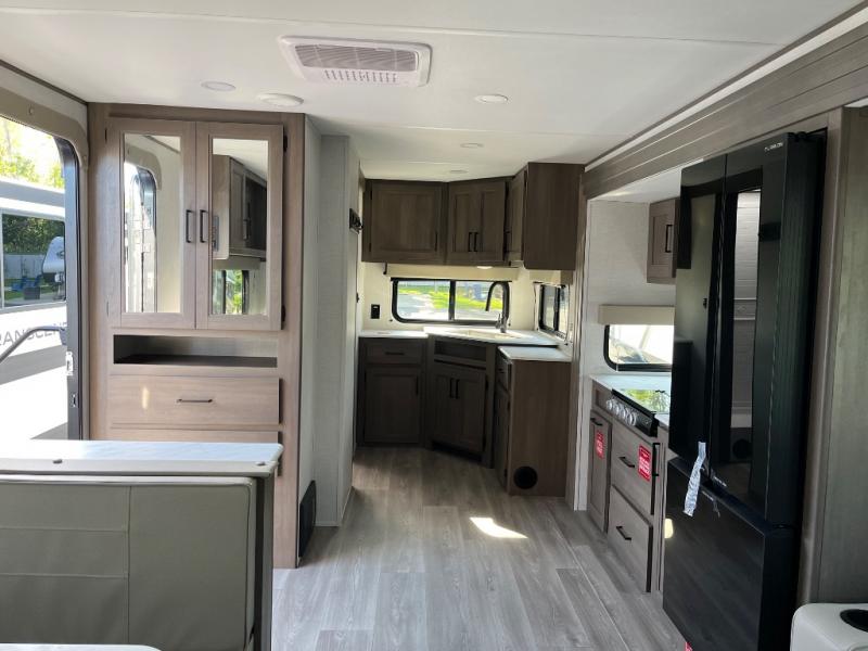 It will be so easy to enjoy camping trips in this travel trailer for five to six! The main living area is made spacious by the large slide out, and here you'll find the 60" sleeper sofa and the kitchen appliances. A booth dinette across the room provides a place to dine and play board games, or you can head outdoors to sit under the 17' power awning with LED lights. The queen bed in the front private bedroom will have you feeling right at home, and the TV prep here gives you the option to watch movies in bed. This model also includes a rear corner kitchen with ample counter space and a large sink, and you'll find the full bath in the other rear corner!
