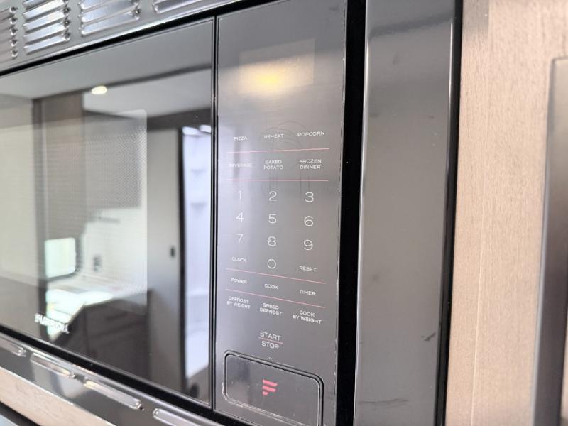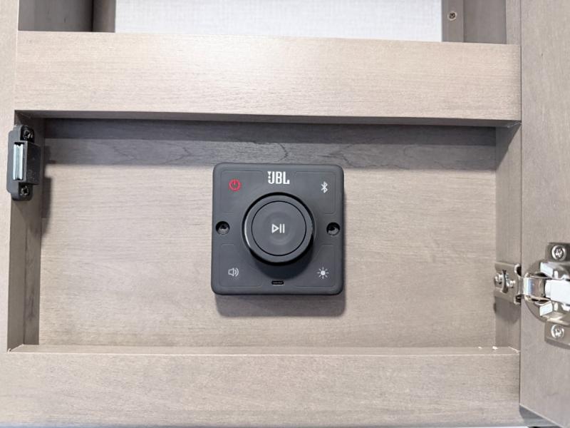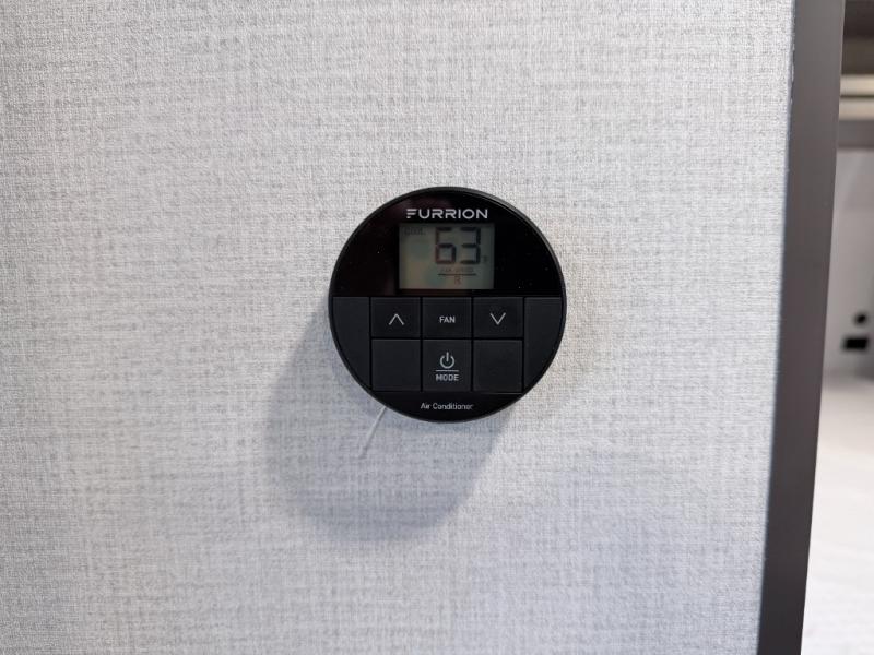 - Front private bedroom with a queen bed, overhead cabinets, and TV prep
