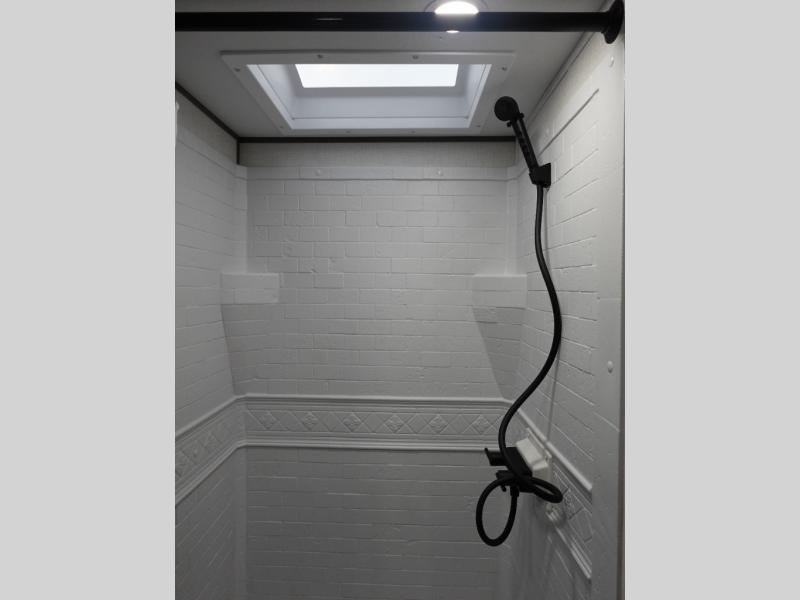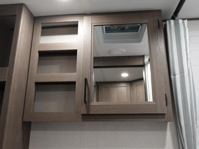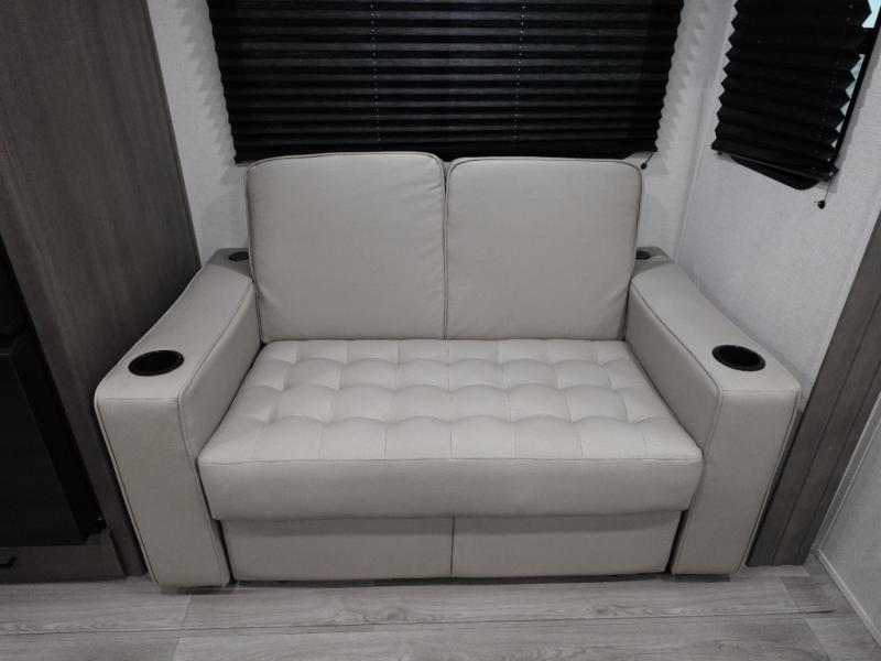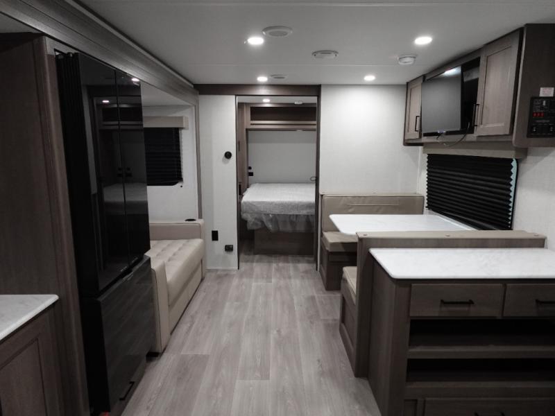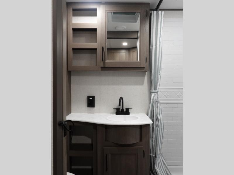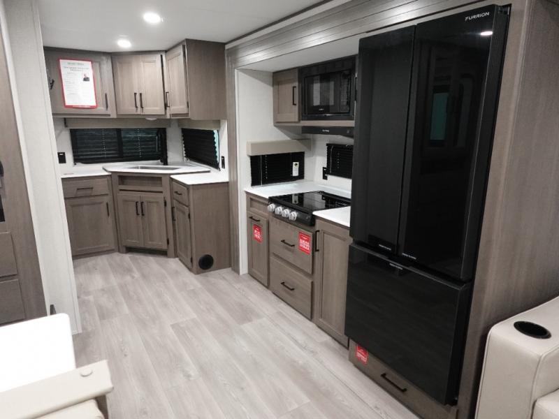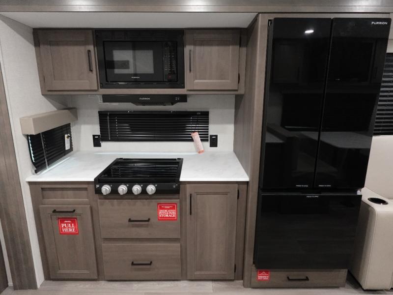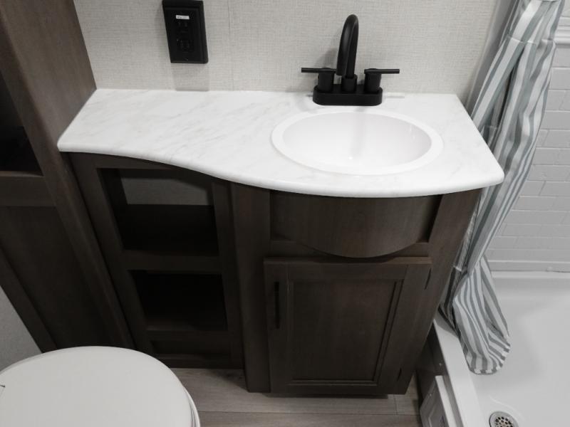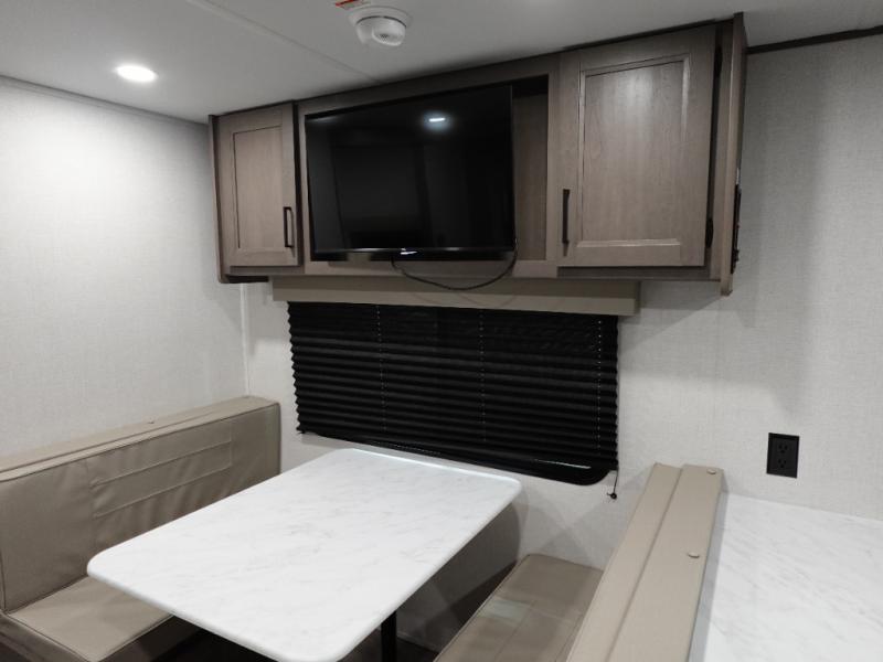 It will be so easy to enjoy camping trips in this travel trailer for five to six! The main living area is made spacious by the large slide out, and here you'll find the 60" sleeper sofa and the kitchen appliances. A booth dinette across the room provides a place to dine and play board games, or you can head outdoors to sit under the 17' power awning with LED lights. The queen bed in the front private bedroom will have you feeling right at home, and the TV prep here gives you the option to watch movies in bed. This model also includes a rear corner kitchen with ample counter space and a large sink, and you'll find the full bath in the other rear corner!