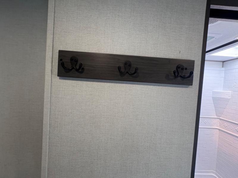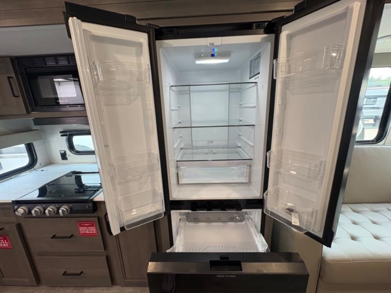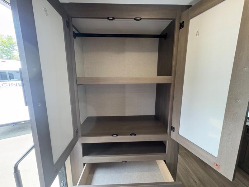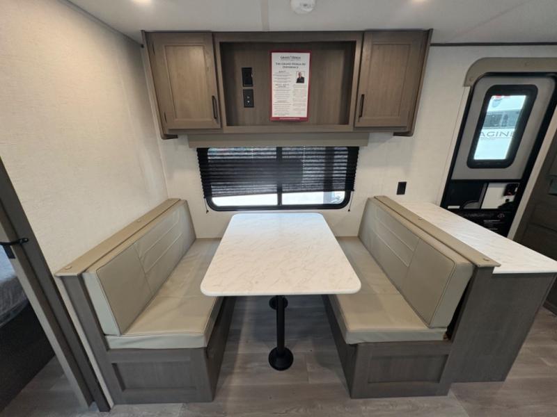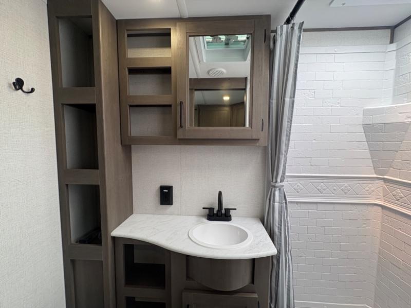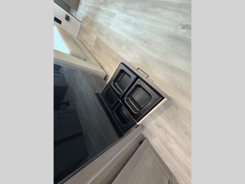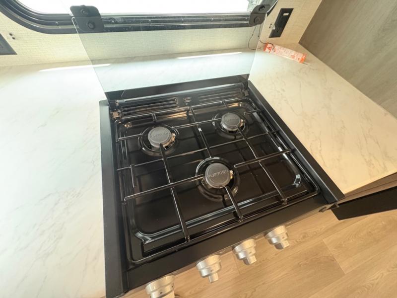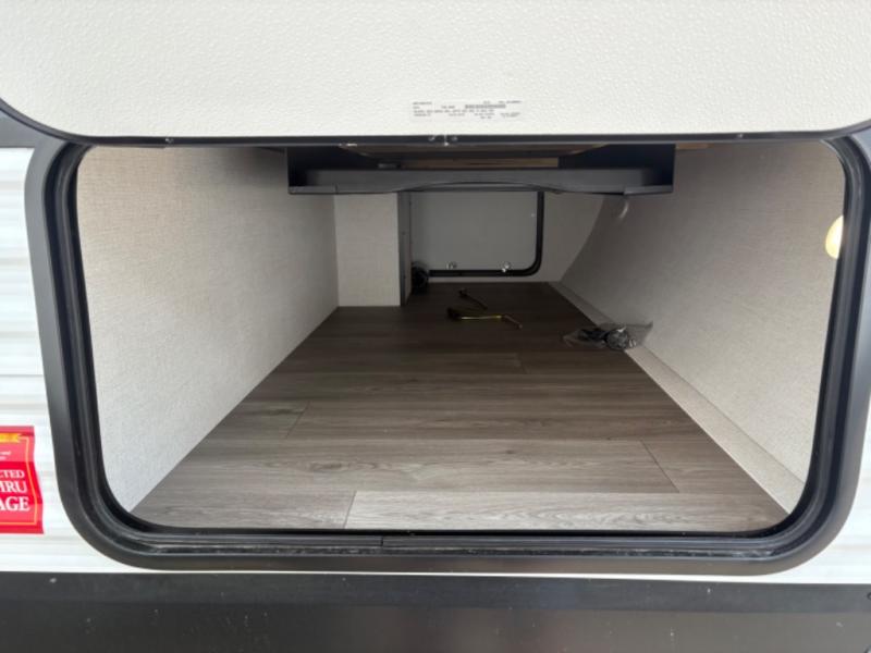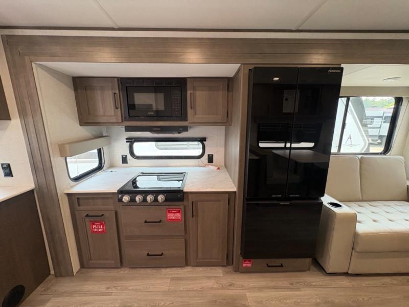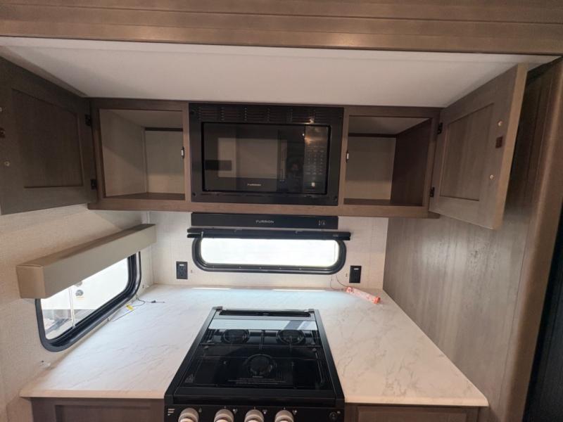 It will be so easy to enjoy camping trips in this travel trailer for five to six! The main living area is made spacious by the large slide out, and here you'll find the 60" sleeper sofa and the kitchen appliances. A booth dinette across the room provides a place to dine and play board games, or you can head outdoors to sit under the 17' power awning with LED lights. The queen bed in the front private bedroom will have you feeling right at home, and the TV prep here gives you the option to watch movies in bed. This model also includes a rear corner kitchen with ample counter space and a large sink, and you'll find the full bath in the other rear corner!