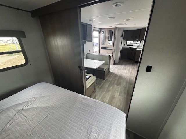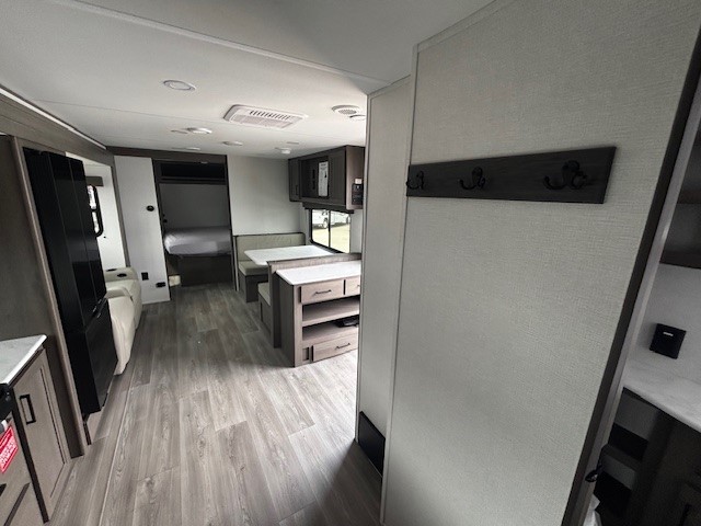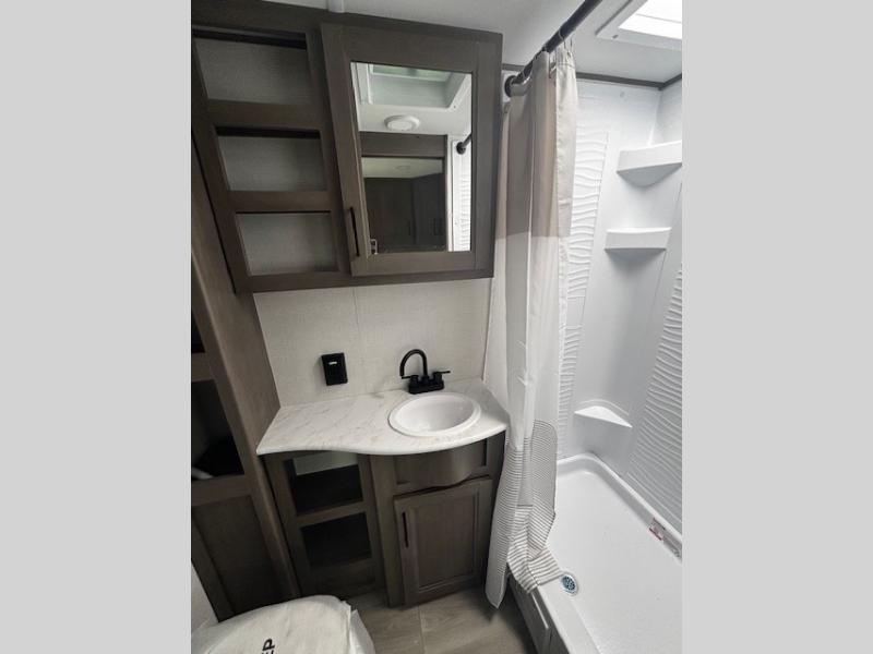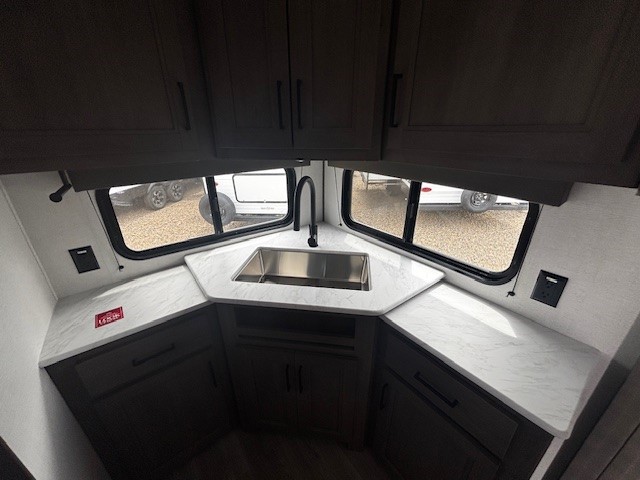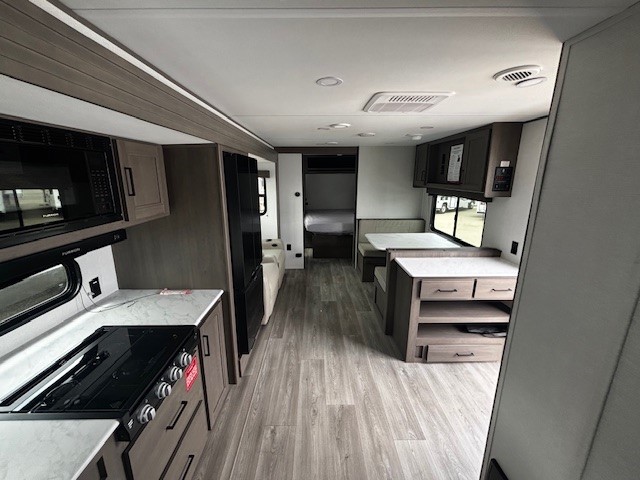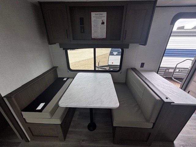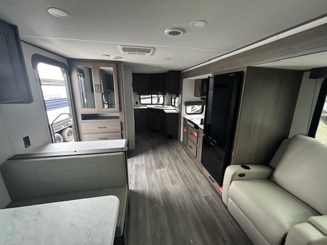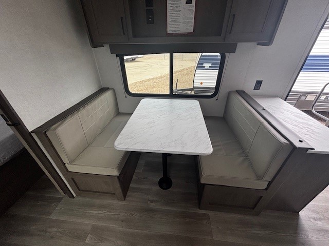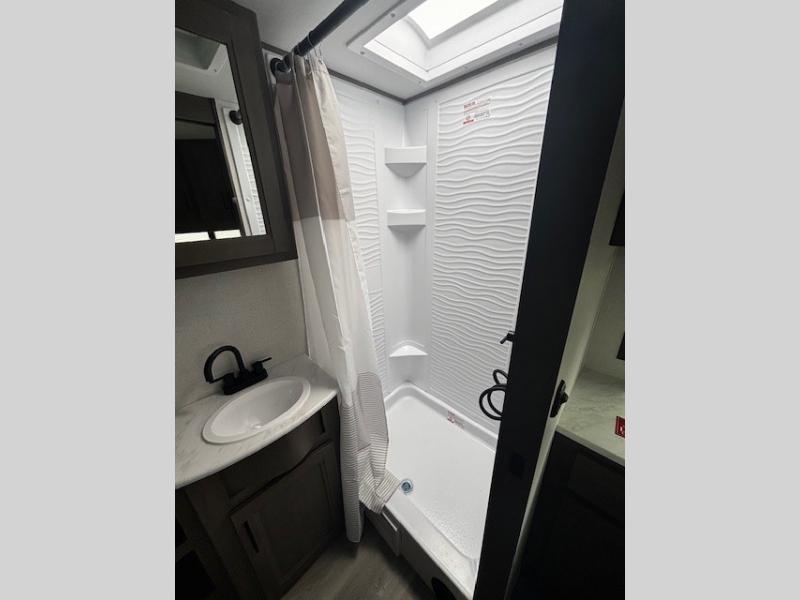 It will be so easy to enjoy camping trips in this travel trailer for five to six! The main living area is made spacious by the large slide out, and here you'll find the 60" sleeper sofa and the kitchen appliances. A booth dinette across the room provides a place to dine and play board games, or you can head outdoors to sit under the 17' power awning with LED lights. The queen bed in the front private bedroom will have you feeling right at home, and the TV prep here gives you the option to watch movies in bed. This model also includes a rear corner kitchen with ample counter space and a large sink, and you'll find the full bath in the other rear corner!