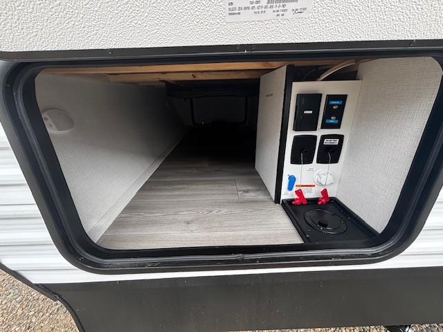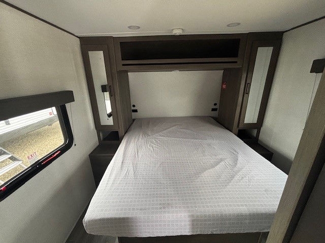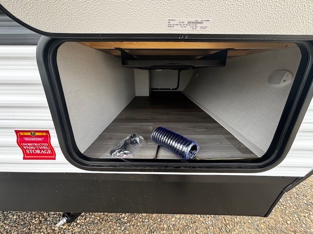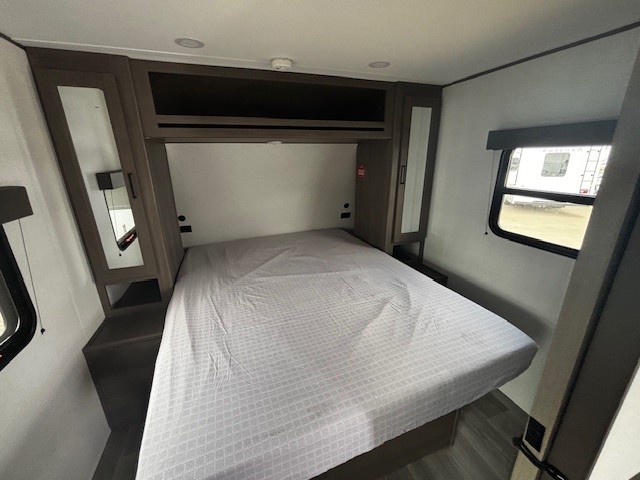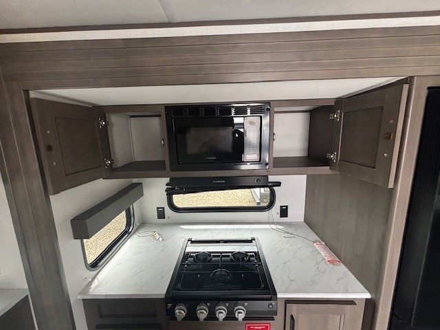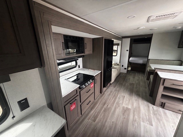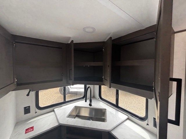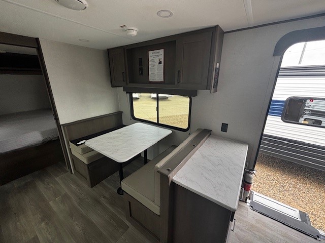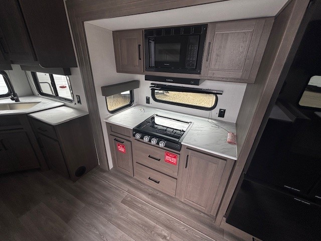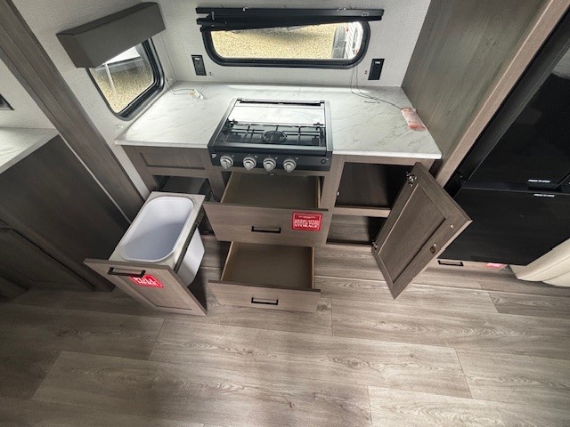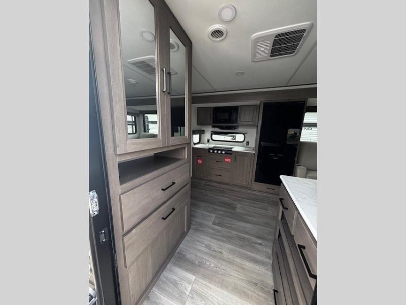 It will be so easy to enjoy camping trips in this travel trailer for five to six! The main living area is made spacious by the large slide out, and here you'll find the 60" sleeper sofa and the kitchen appliances. A booth dinette across the room provides a place to dine and play board games, or you can head outdoors to sit under the 17' power awning with LED lights. The queen bed in the front private bedroom will have you feeling right at home, and the TV prep here gives you the option to watch movies in bed. This model also includes a rear corner kitchen with ample counter space and a large sink, and you'll find the full bath in the other rear corner!