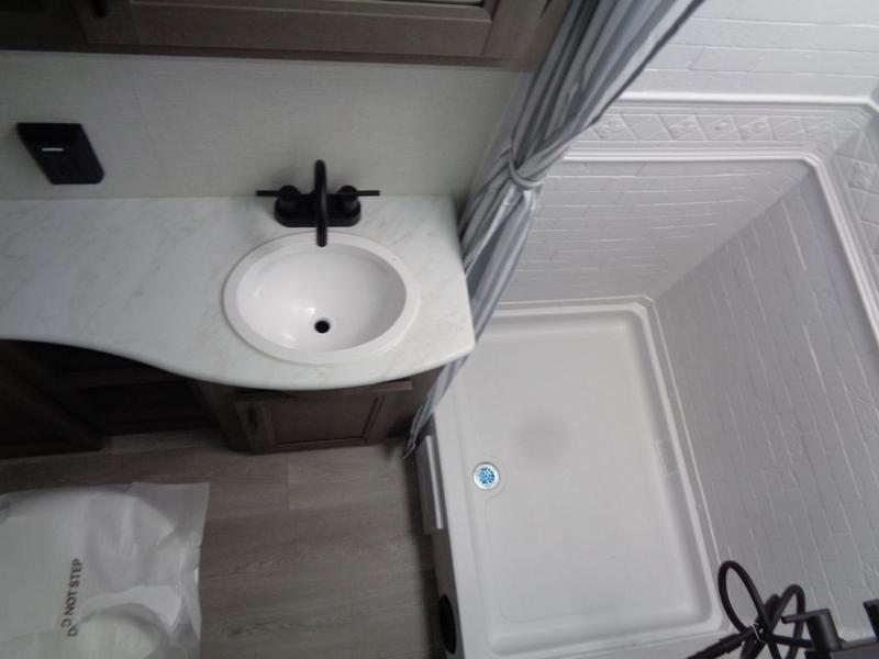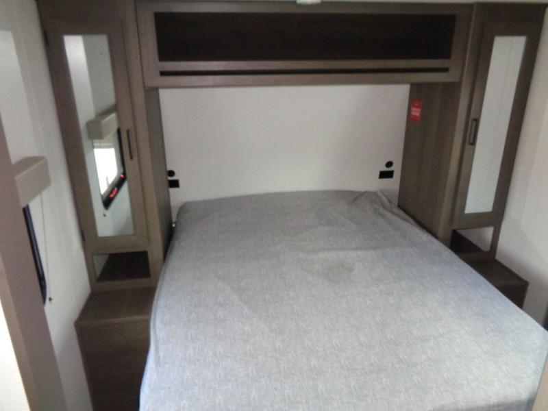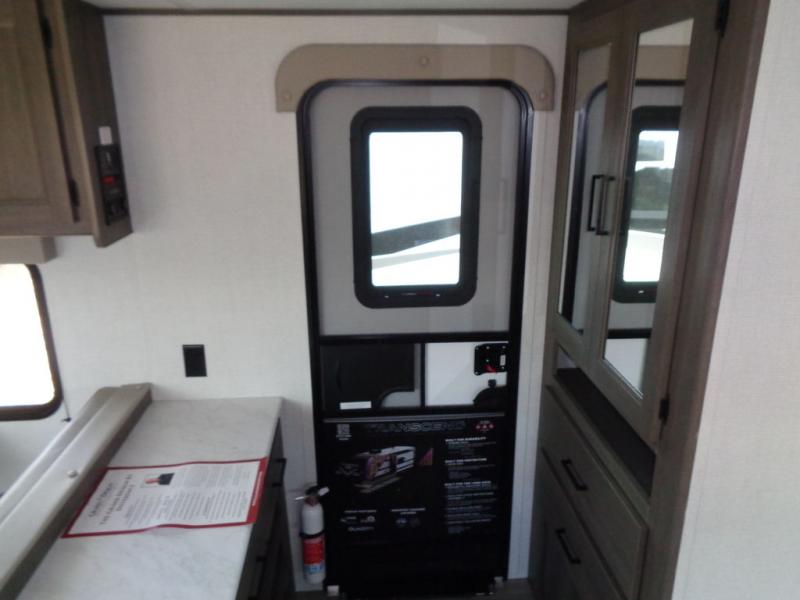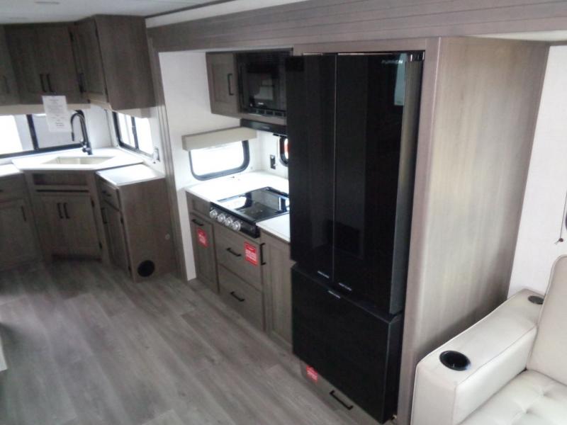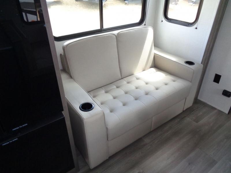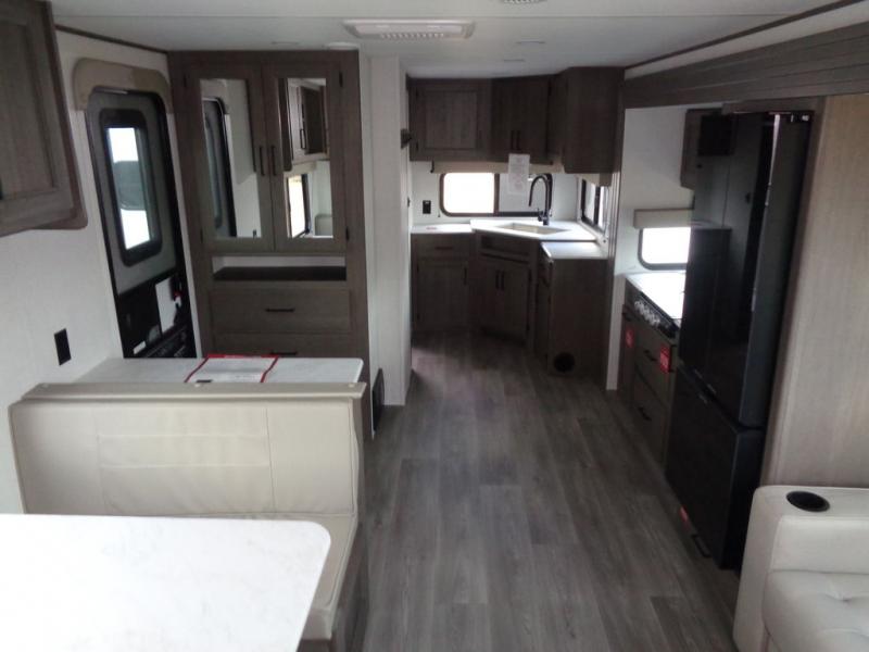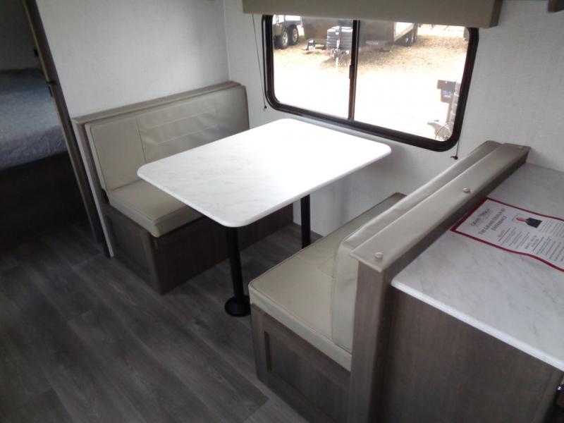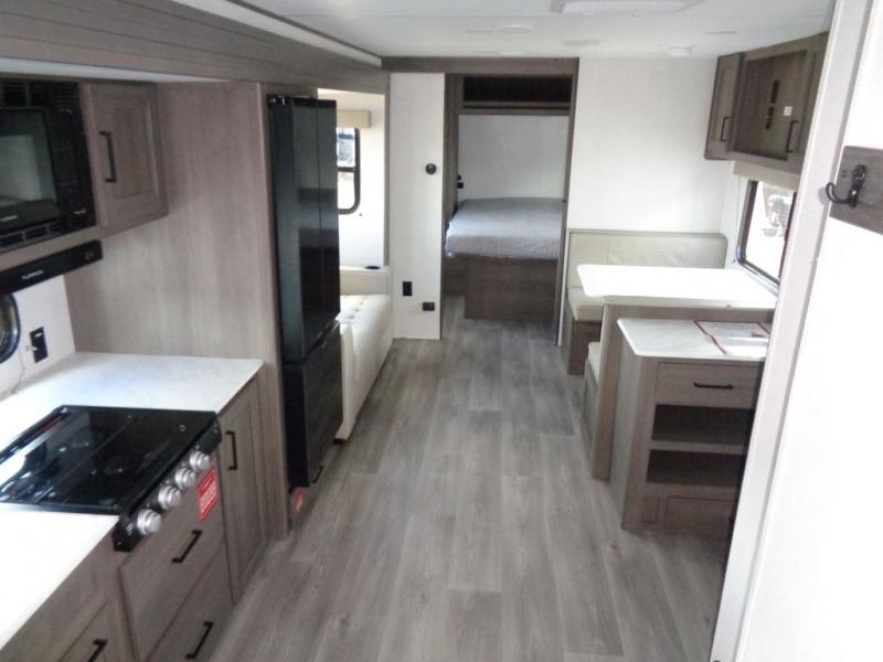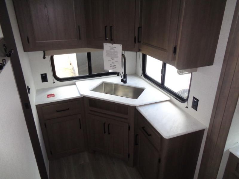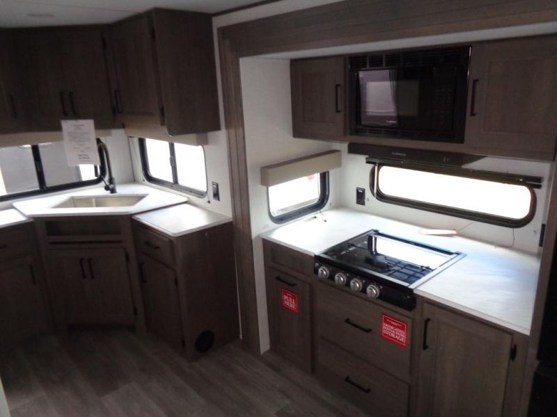 It will be so easy to enjoy camping trips in this travel trailer for five to six! The main living area is made spacious by the large slide out, and here you'll find the 60" sleeper sofa and the kitchen appliances. A booth dinette across the room provides a place to dine and play board games, or you can head outdoors to sit under the 17' power awning with LED lights. The queen bed in the front private bedroom will have you feeling right at home, and the TV prep here gives you the option to watch movies in bed. This model also includes a rear corner kitchen with ample counter space and a large sink, and you'll find the full bath in the other rear corner!
