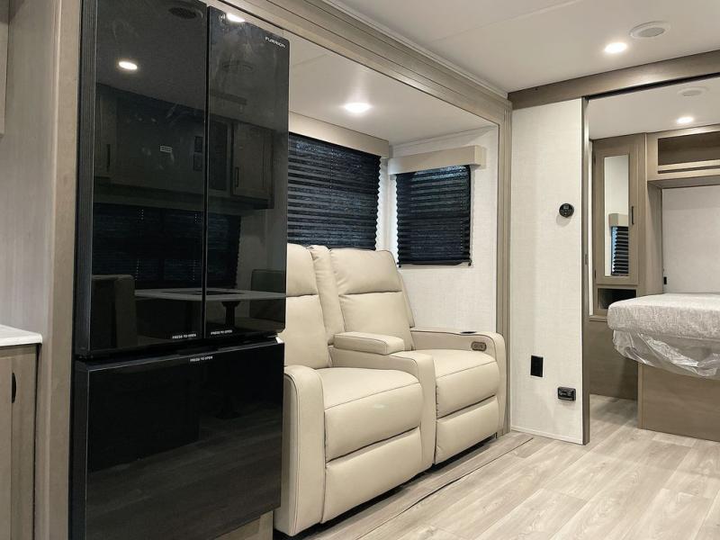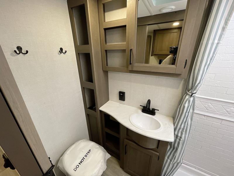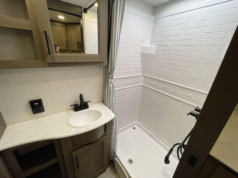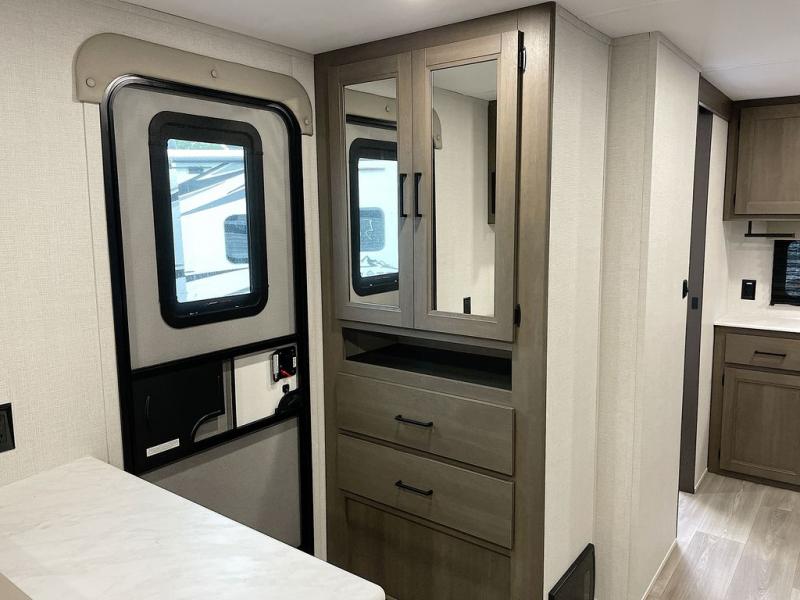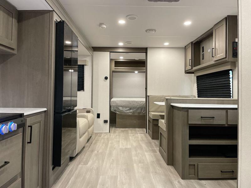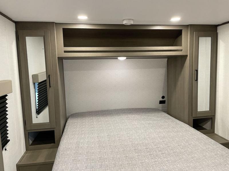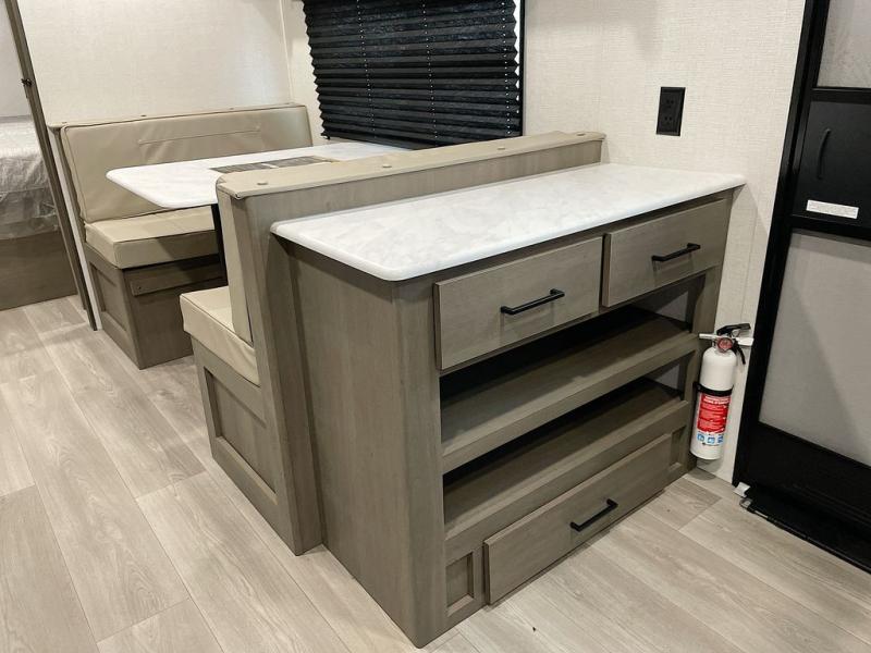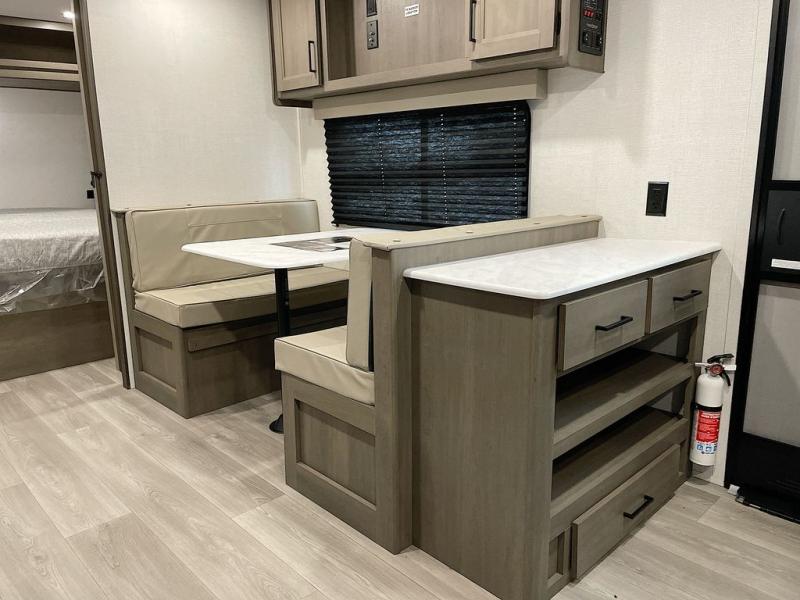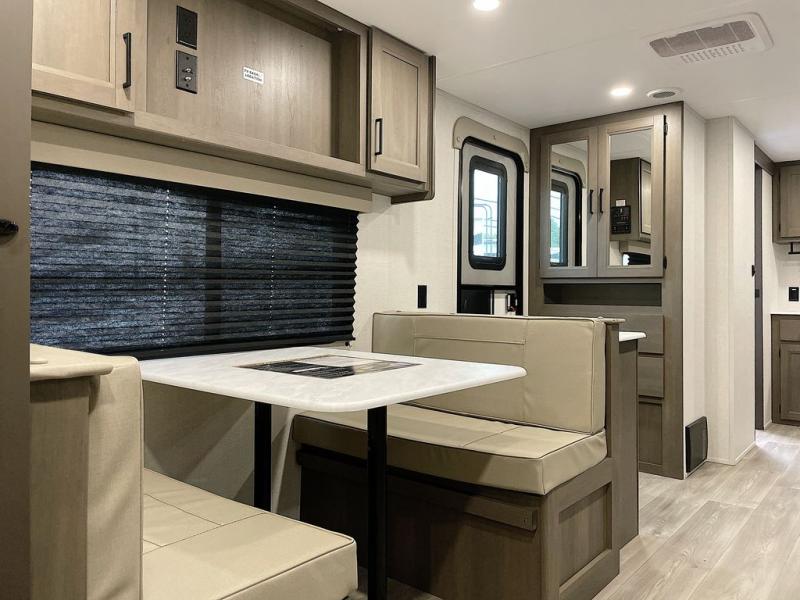It will be so easy to enjoy camping trips in this travel trailer for five to six! The main living area is made spacious by the large slide out, and here you'll find the 60" sleeper sofa and the kitchen appliances. A booth dinette across the room provides a place to dine and play board games, or you can head outdoors to sit under the 17' power awning with LED lights. The queen bed in the front private bedroom will have you feeling right at home, and the TV prep here gives you the option to watch movies in bed. This model also includes a rear corner kitchen with ample counter space and a large sink, and you'll find the full bath in the other rear corner!