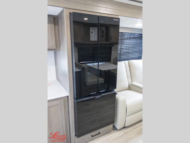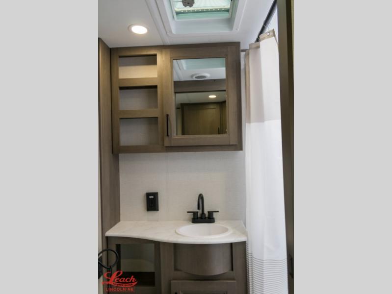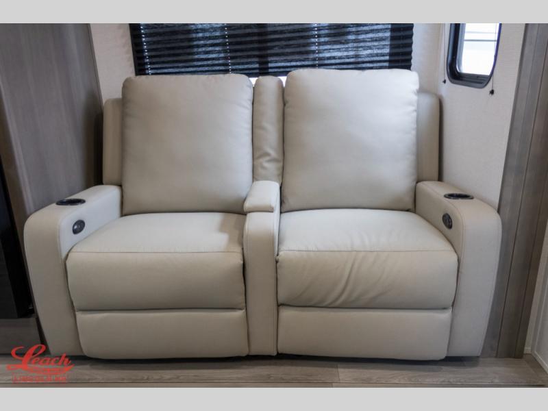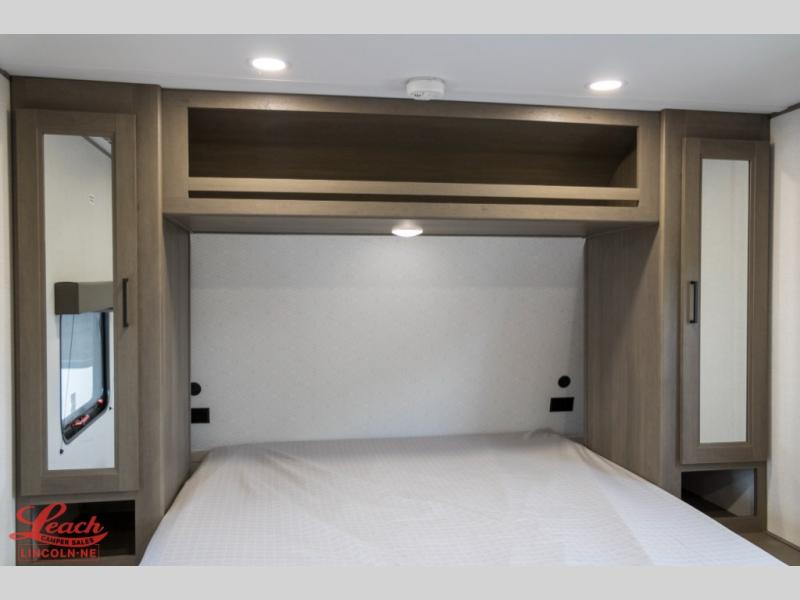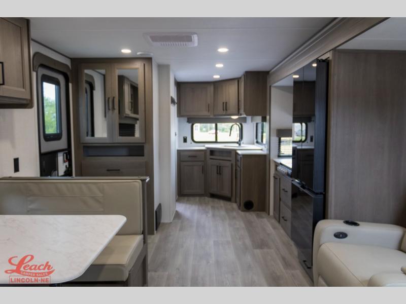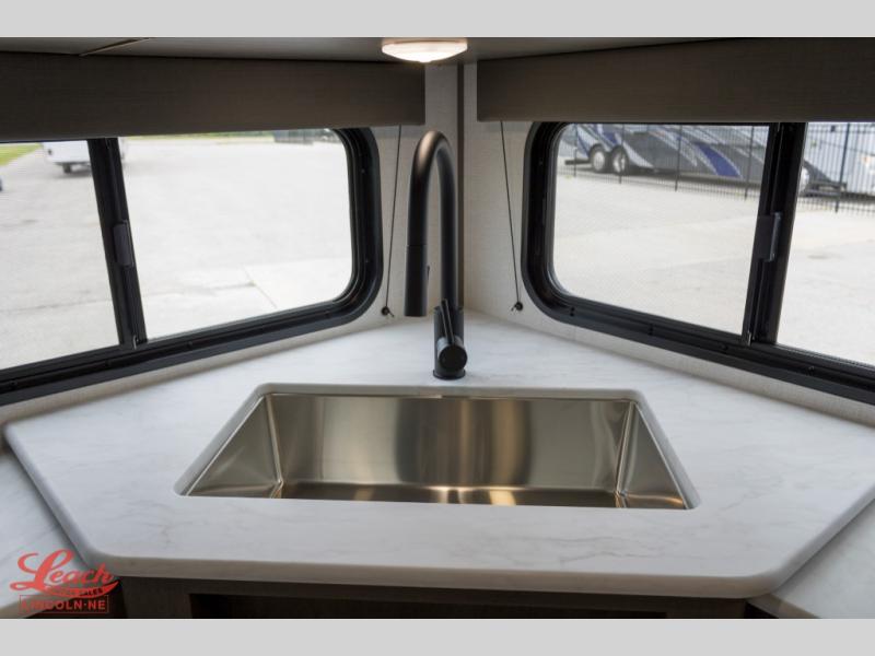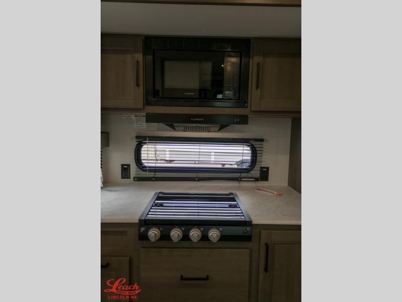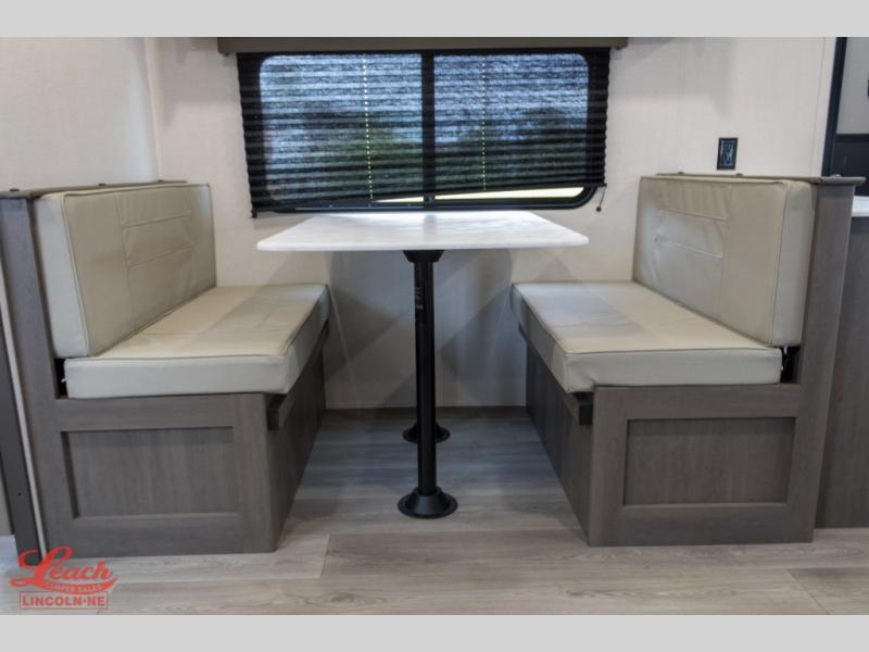 It will be so easy to enjoy camping trips in this travel trailer for five to six! The main living area is made spacious by the large slide out, and here you'll find the 60" sleeper sofa and the kitchen appliances. A booth dinette across the room provides a place to dine and play board games, or you can head outdoors to sit under the 17' power awning with LED lights. The queen bed in the front private bedroom will have you feeling right at home, and the TV prep here gives you the option to watch movies in bed. This model also includes a rear corner kitchen with ample counter space and a large sink, and you'll find the full bath in the other rear corner!