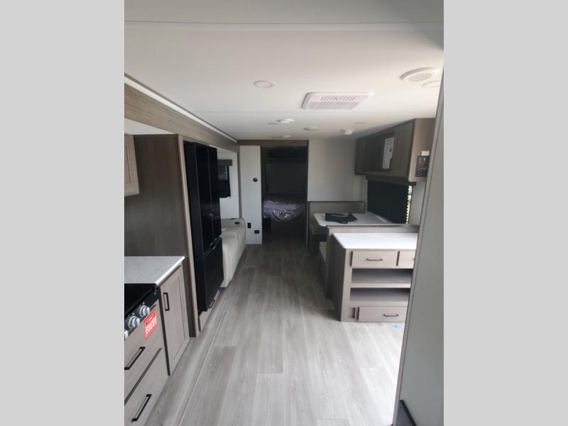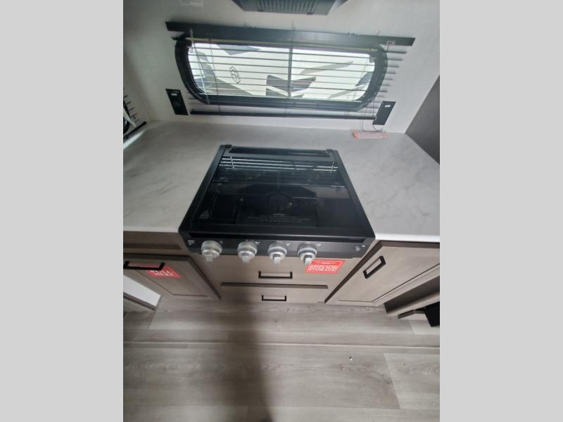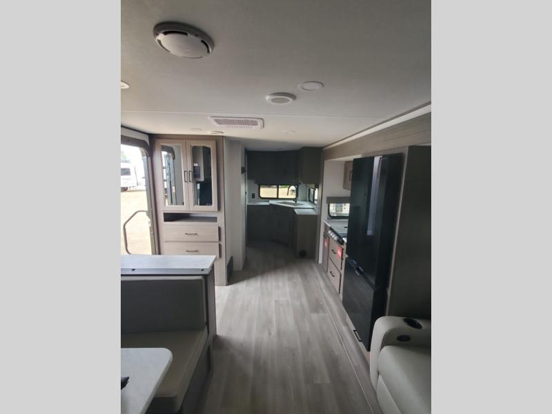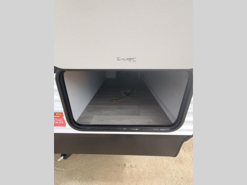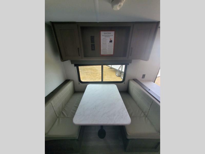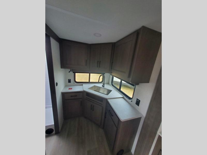 It will be so easy to enjoy camping trips in this travel trailer for five to six! The main living area is made spacious by the large slide out, and here you'll find the 60" sleeper sofa and the kitchen appliances. A booth dinette across the room provides a place to dine and play board games, or you can head outdoors to sit under the 17' power awning with LED lights. The queen bed in the front private bedroom will have you feeling right at home, and the TV prep here gives you the option to watch movies in bed. This model also includes a rear corner kitchen with ample counter space and a large sink, and you'll find the full bath in the other rear corner!
