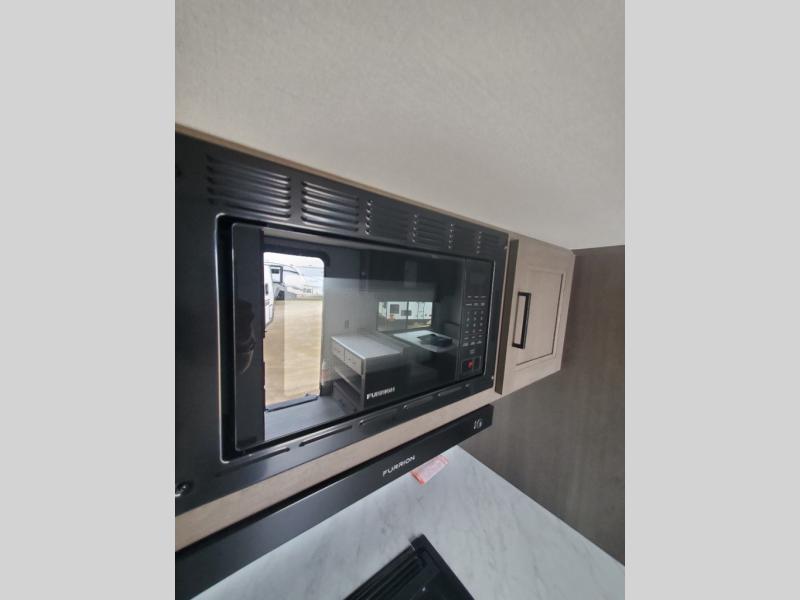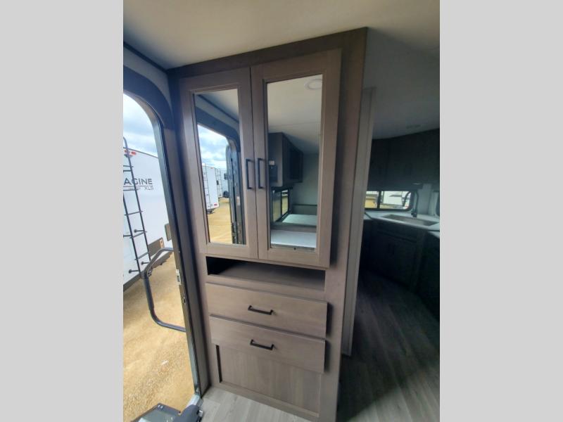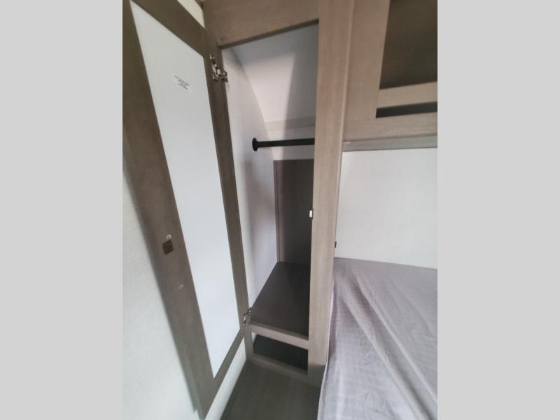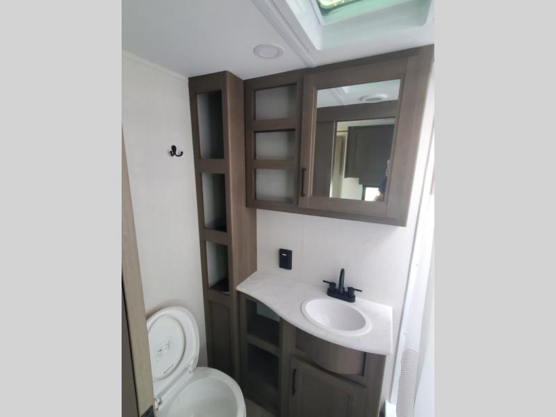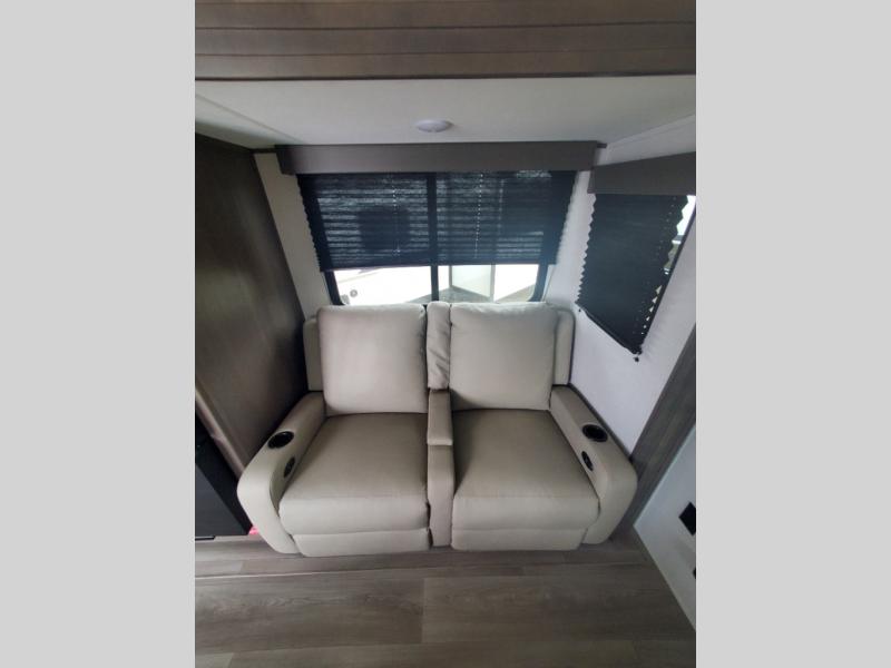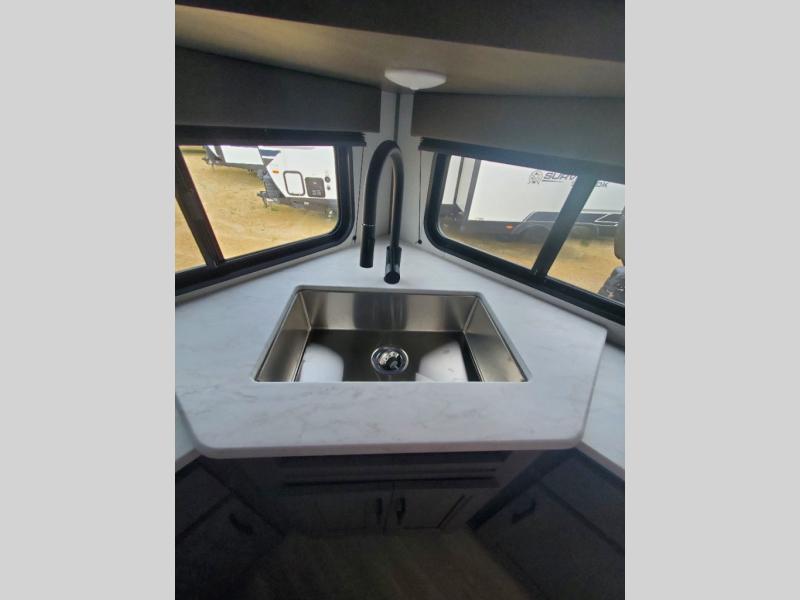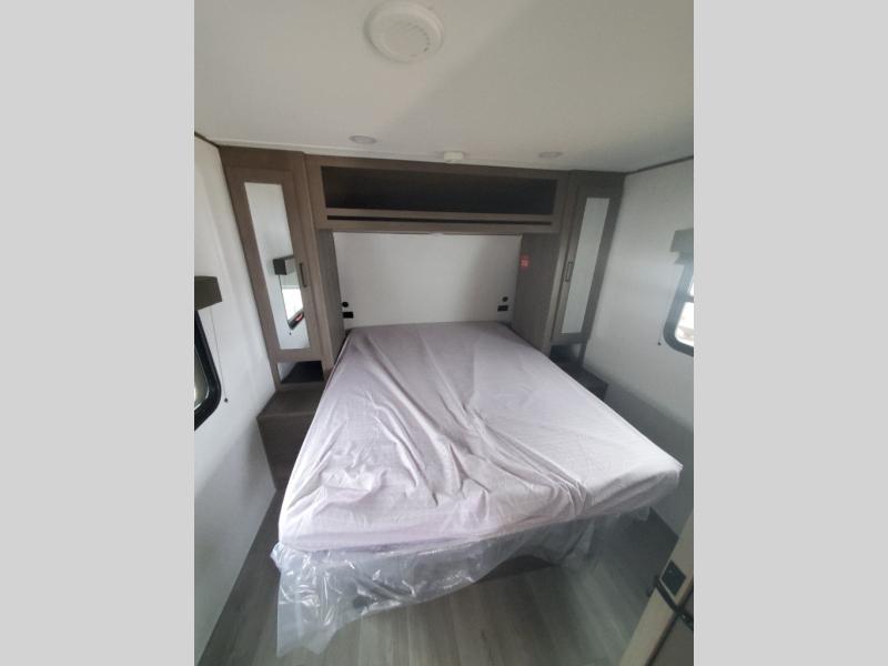 It will be so easy to enjoy camping trips in this travel trailer for five to six! The main living area is made spacious by the large slide out, and here you'll find the 60" sleeper sofa and the kitchen appliances. A booth dinette across the room provides a place to dine and play board games, or you can head outdoors to sit under the 17' power awning with LED lights. The queen bed in the front private bedroom will have you feeling right at home, and the TV prep here gives you the option to watch movies in bed. This model also includes a rear corner kitchen with ample counter space and a large sink, and you'll find the full bath in the other rear corner!