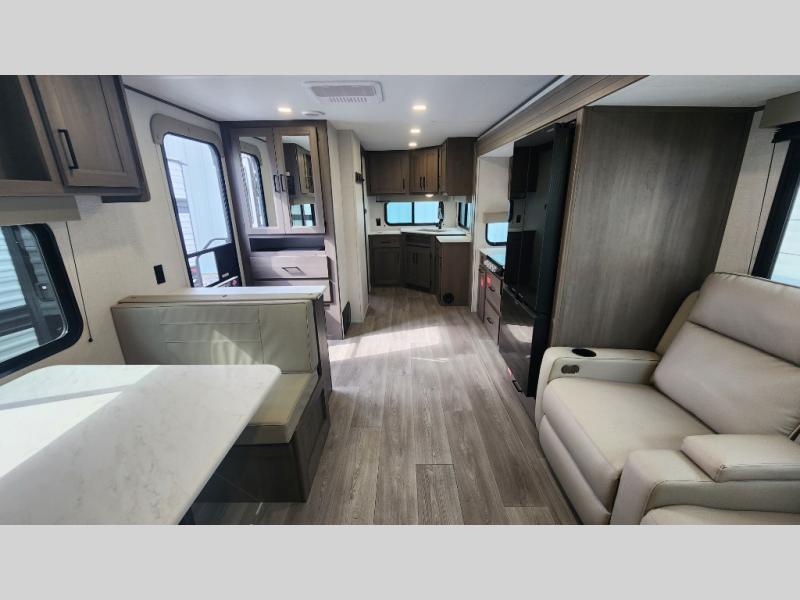 Open floorplan with theater seating or tri-fold sofa and booth dinette—great for lounging, dining, or entertaining. -