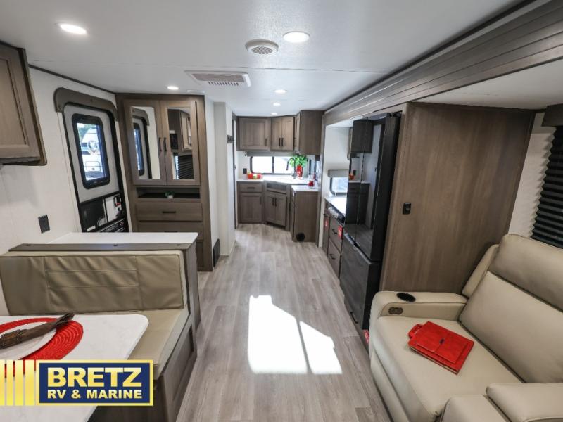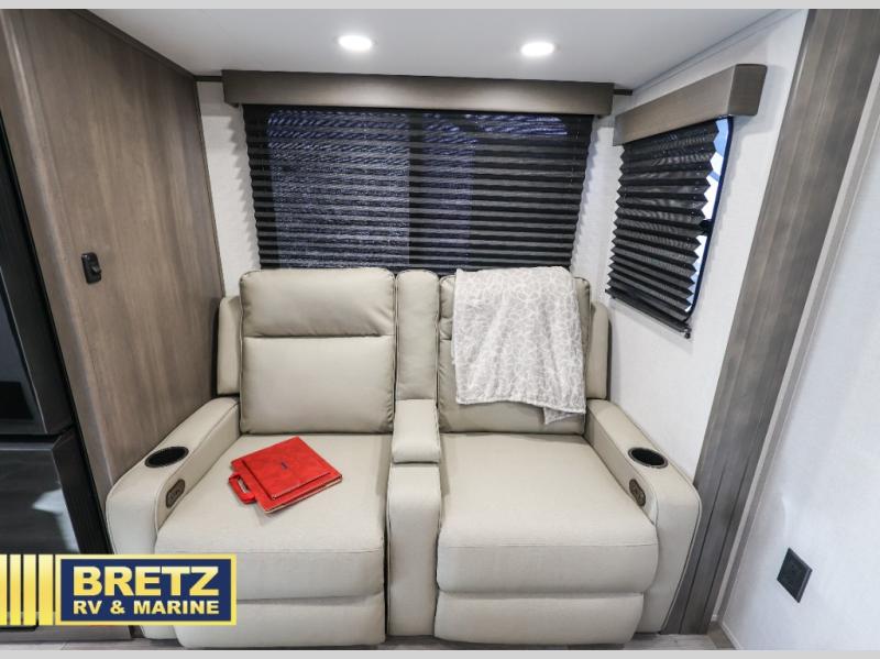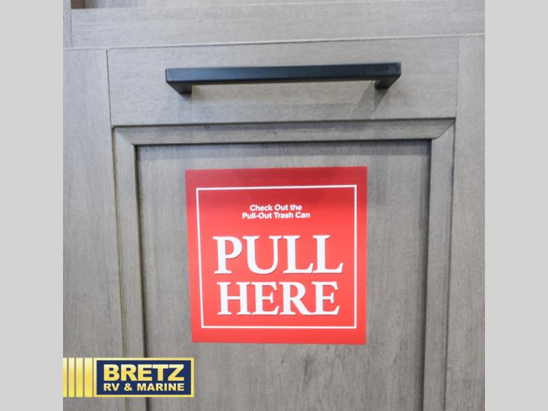 It will be so easy to enjoy camping trips in this travel trailer for five to six! The main living area is made spacious by the large slide out, and here you'll find the 60" sleeper sofa and the kitchen appliances. A booth dinette across the room provides a place to dine and play board games, or you can head outdoors to sit under the 17' power awning with LED lights. The queen bed in the front private bedroom will have you feeling right at home, and the TV prep here gives you the option to watch movies in bed. This model also includes a rear corner kitchen with ample counter space and a large sink, and you'll find the full bath in the other rear corner!