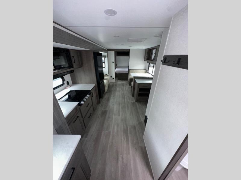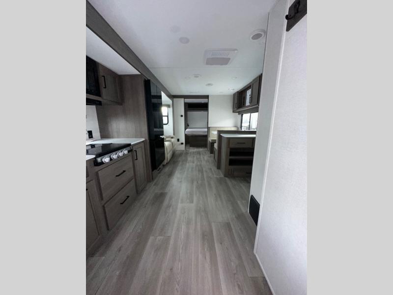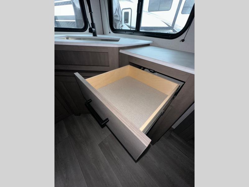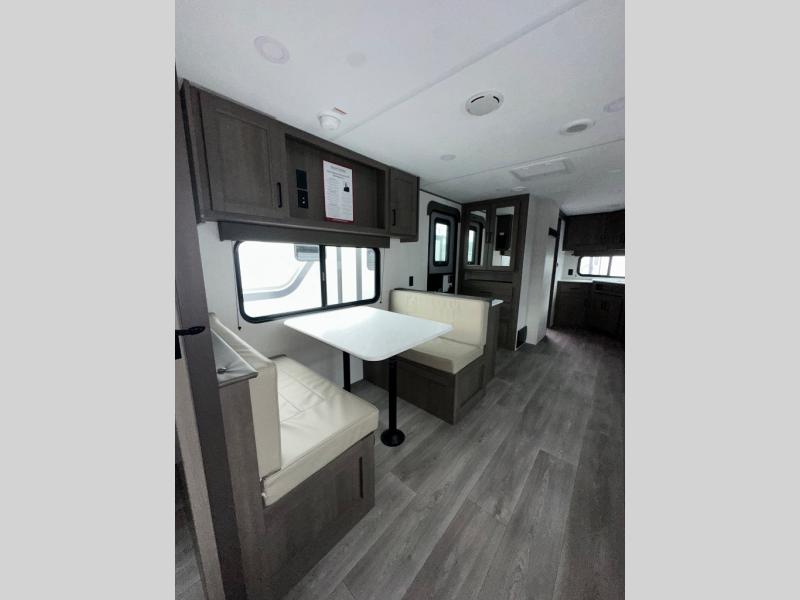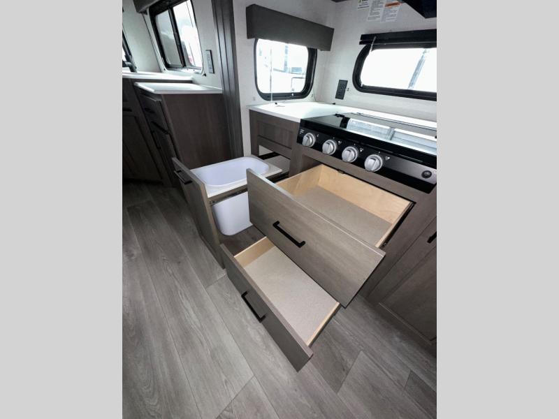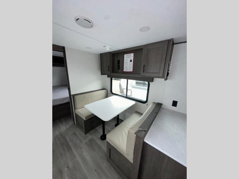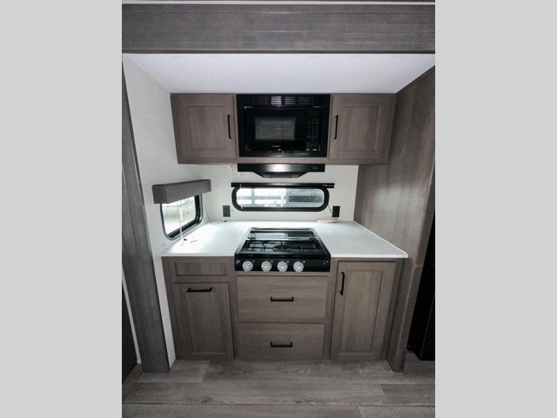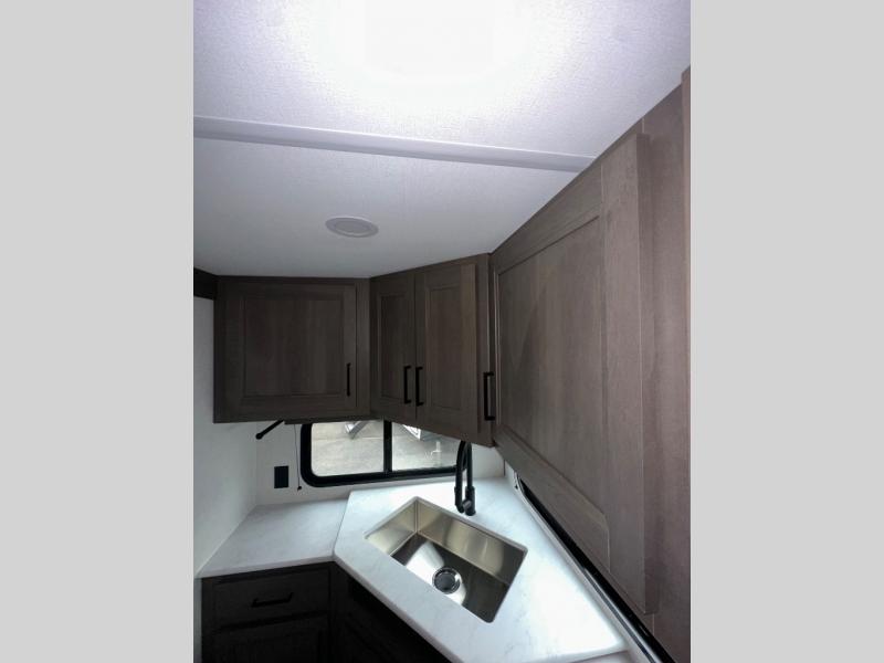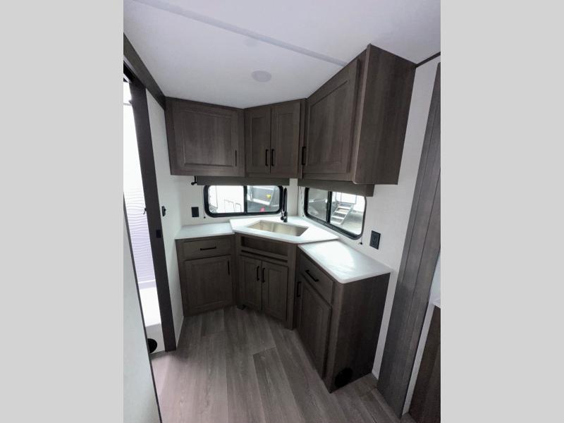 It will be so easy to enjoy camping trips in this travel trailer for five to six! The main living area is made spacious by the large slide out, and here you'll find the 60" sleeper sofa and the kitchen appliances. A booth dinette across the room provides a place to dine and play board games, or you can head outdoors to sit under the 17' power awning with LED lights. The queen bed in the front private bedroom will have you feeling right at home, and the TV prep here gives you the option to watch movies in bed. This model also includes a rear corner kitchen with ample counter space and a large sink, and you'll find the full bath in the other rear corner!