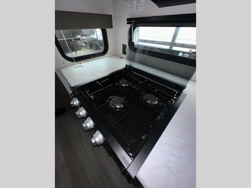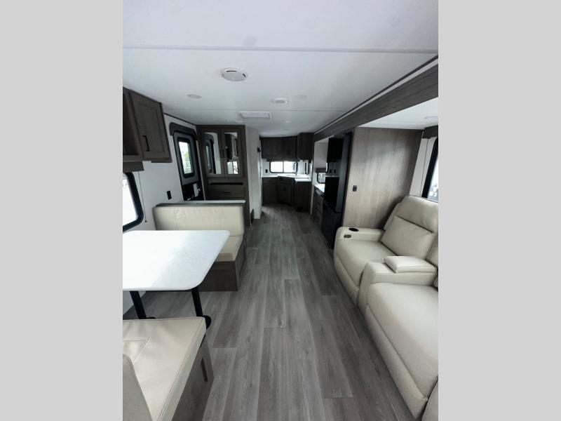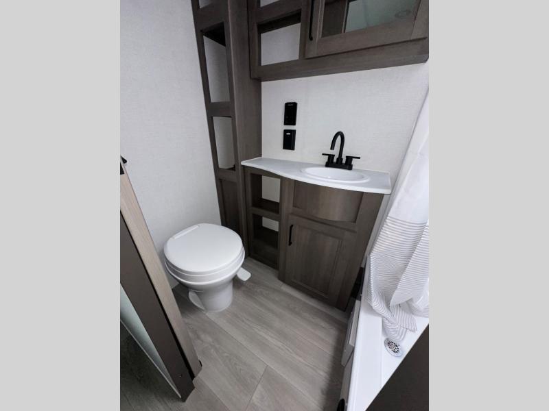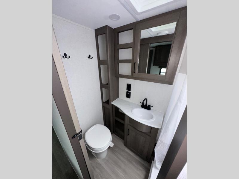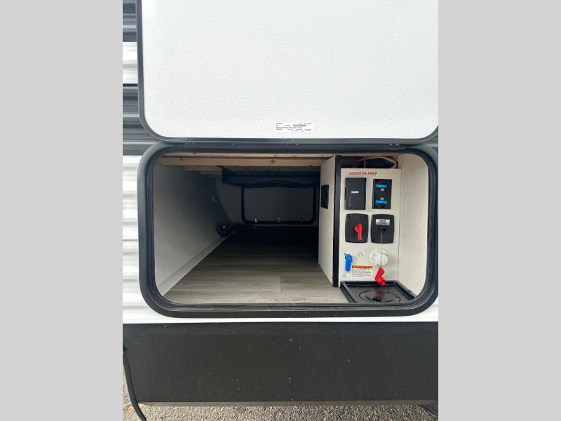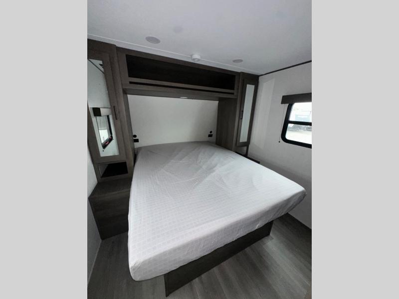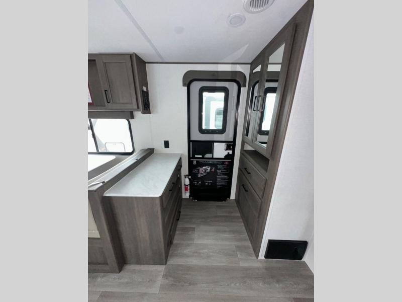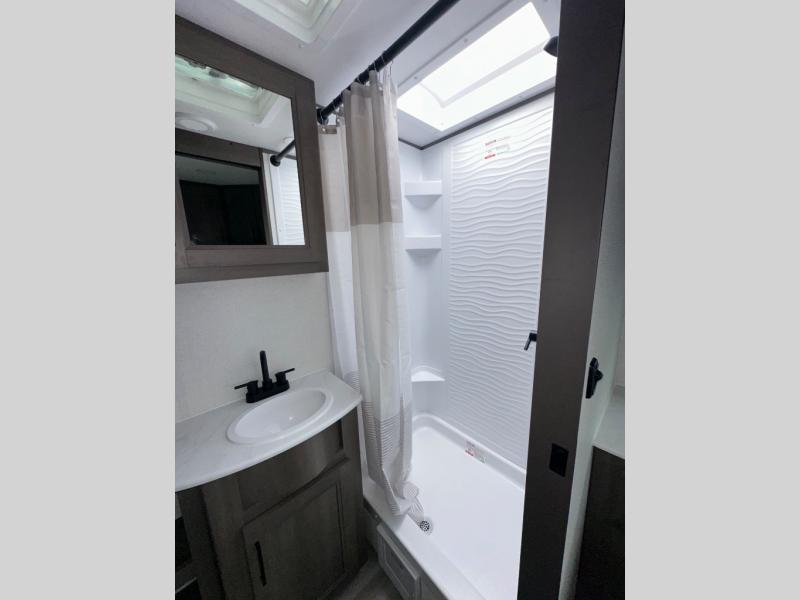 It will be so easy to enjoy camping trips in this travel trailer for five to six! The main living area is made spacious by the large slide out, and here you'll find the 60" sleeper sofa and the kitchen appliances. A booth dinette across the room provides a place to dine and play board games, or you can head outdoors to sit under the 17' power awning with LED lights. The queen bed in the front private bedroom will have you feeling right at home, and the TV prep here gives you the option to watch movies in bed. This model also includes a rear corner kitchen with ample counter space and a large sink, and you'll find the full bath in the other rear corner!