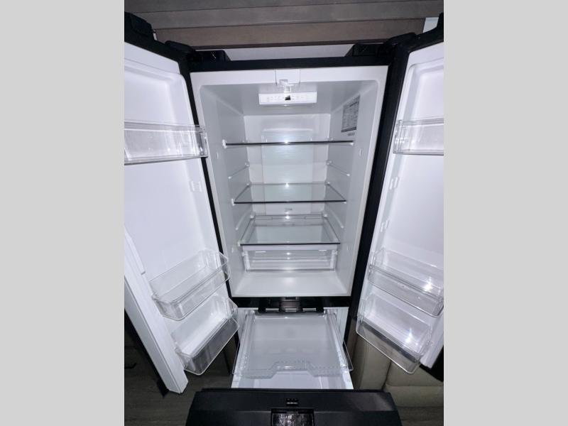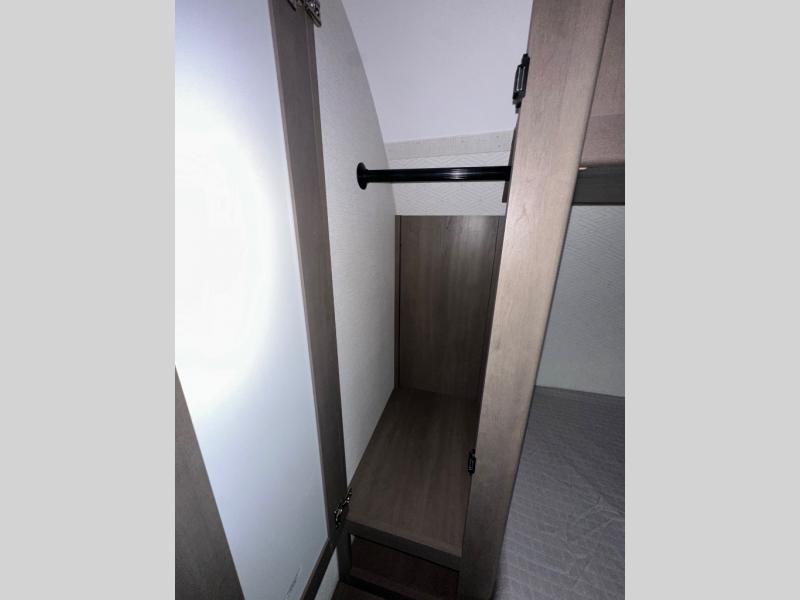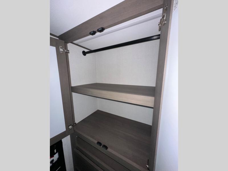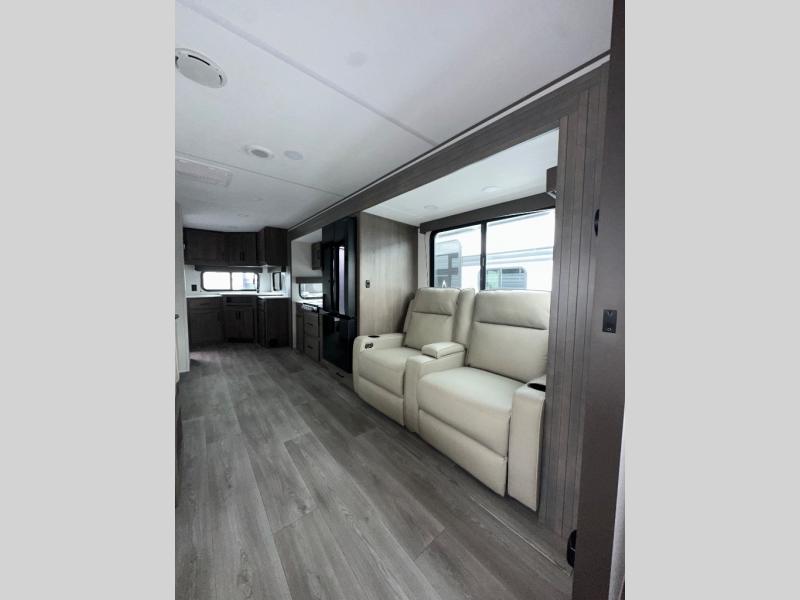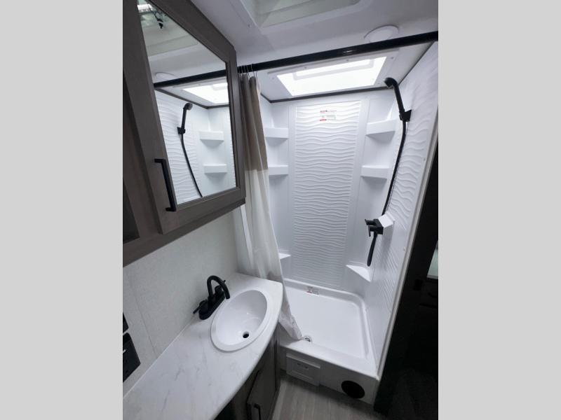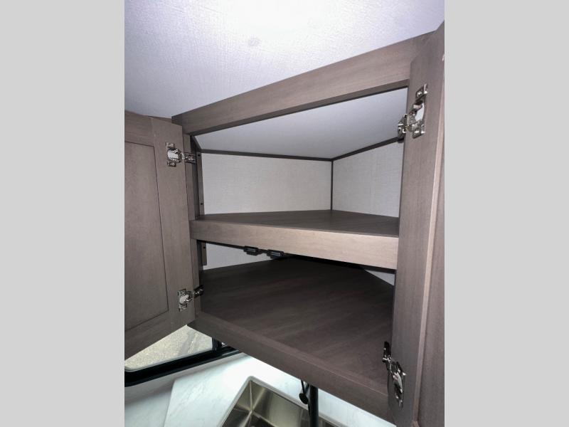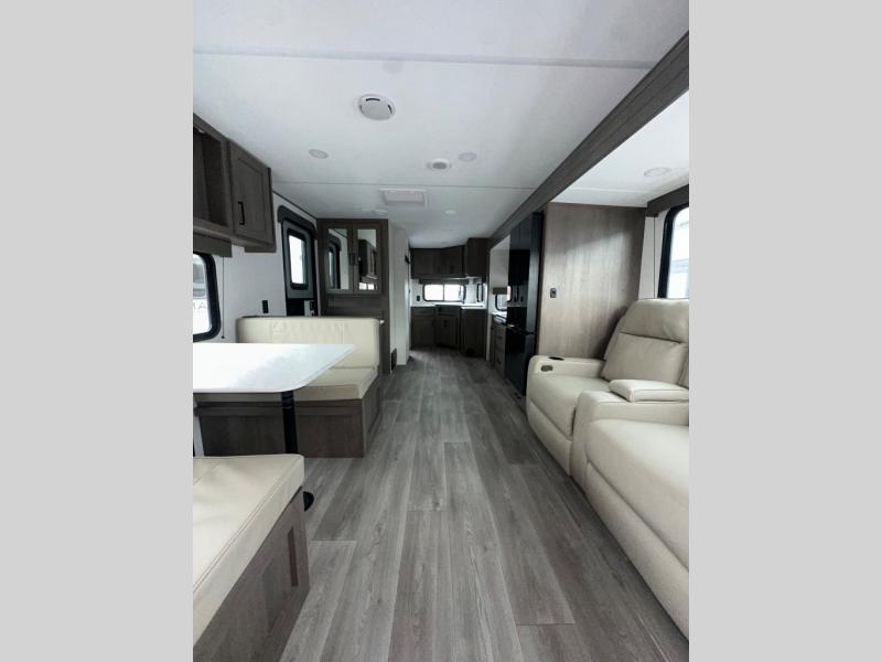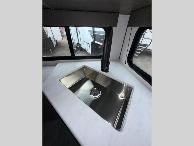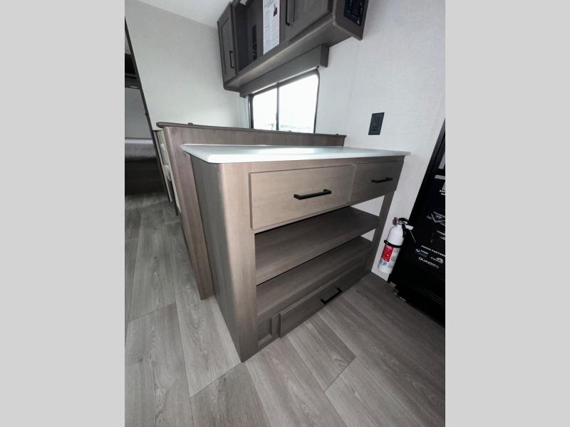 It will be so easy to enjoy camping trips in this travel trailer for five to six! The main living area is made spacious by the large slide out, and here you'll find the 60" sleeper sofa and the kitchen appliances. A booth dinette across the room provides a place to dine and play board games, or you can head outdoors to sit under the 17' power awning with LED lights. The queen bed in the front private bedroom will have you feeling right at home, and the TV prep here gives you the option to watch movies in bed. This model also includes a rear corner kitchen with ample counter space and a large sink, and you'll find the full bath in the other rear corner!