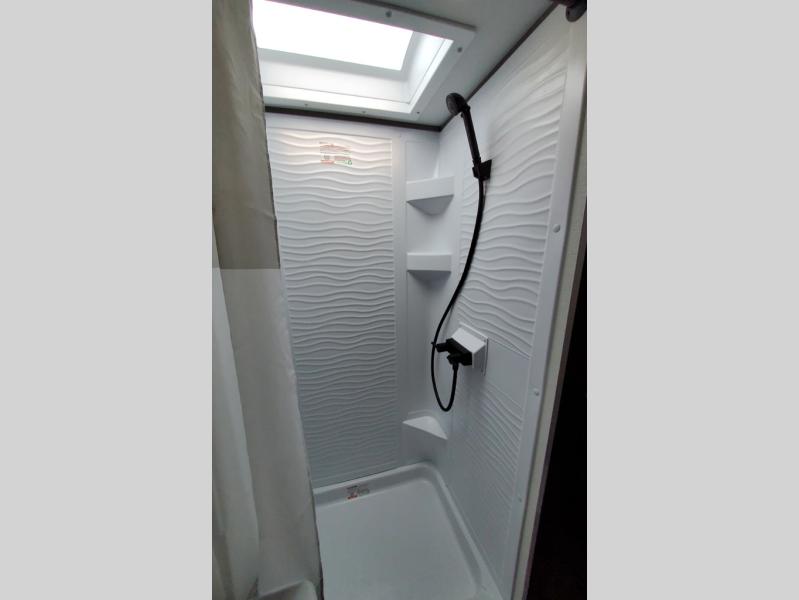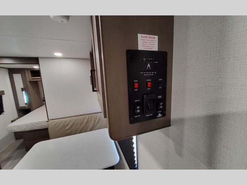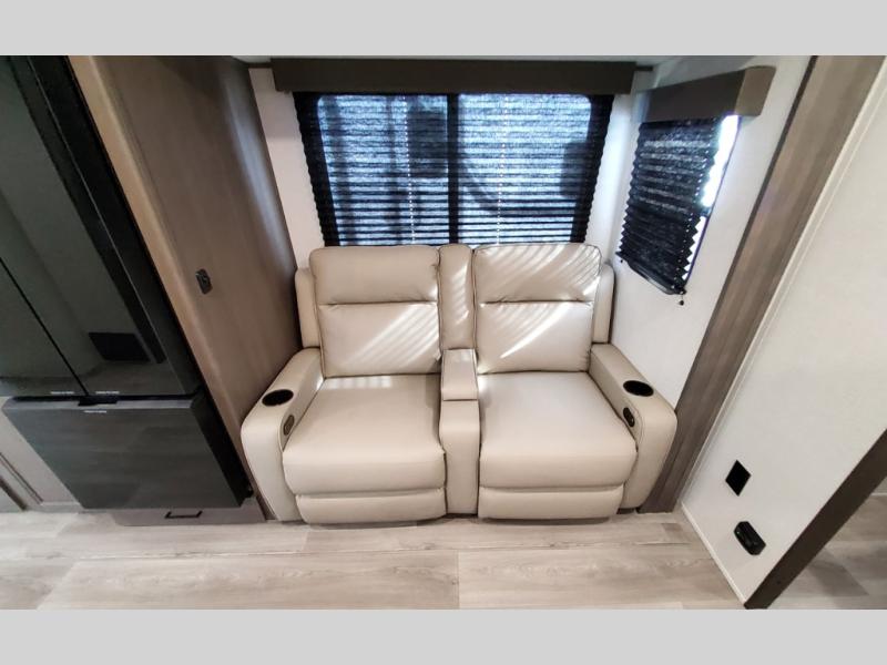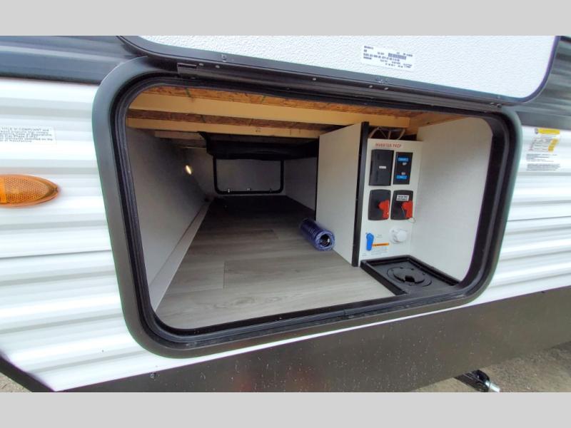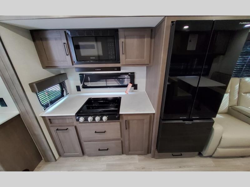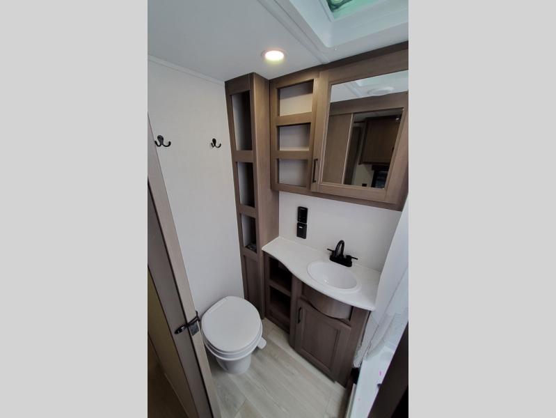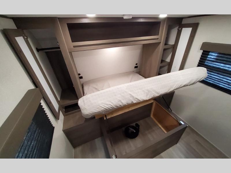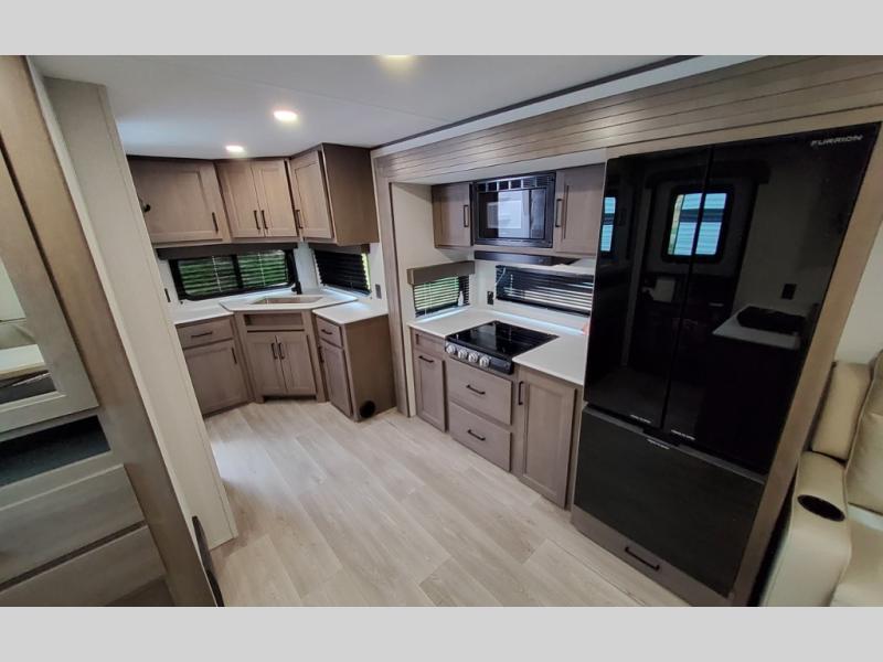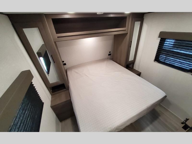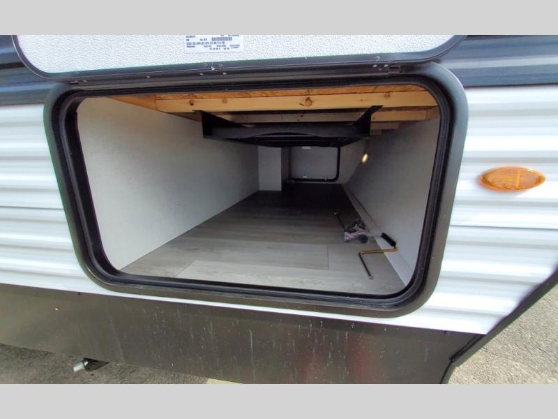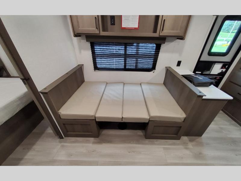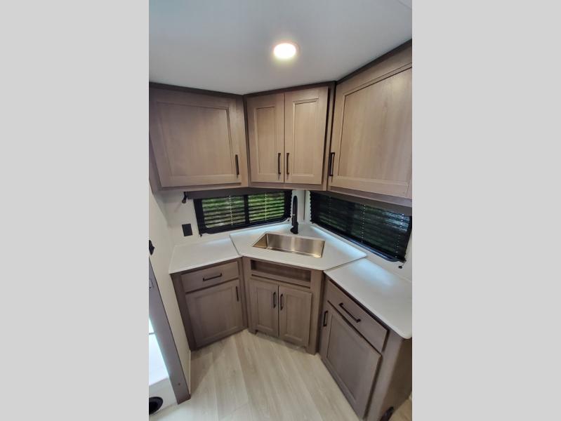 It will be so easy to enjoy camping trips in this travel trailer for five to six! The main living area is made spacious by the large slide out, and here you'll find the 60" sleeper sofa and the kitchen appliances. A booth dinette across the room provides a place to dine and play board games, or you can head outdoors to sit under the 17' power awning with LED lights. The queen bed in the front private bedroom will have you feeling right at home, and the TV prep here gives you the option to watch movies in bed. This model also includes a rear corner kitchen with ample counter space and a large sink, and you'll find the full bath in the other rear corner!