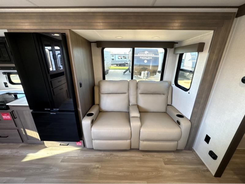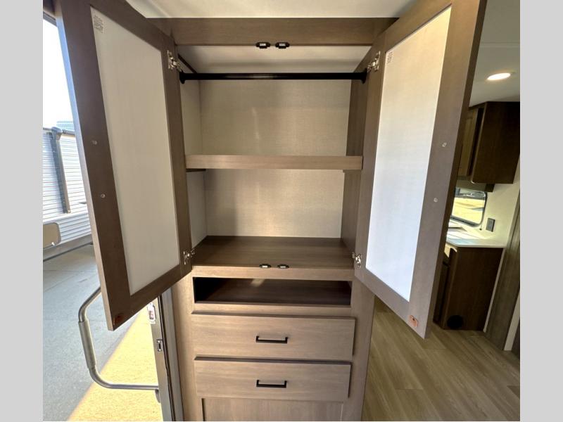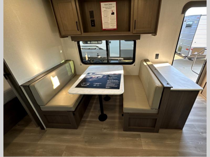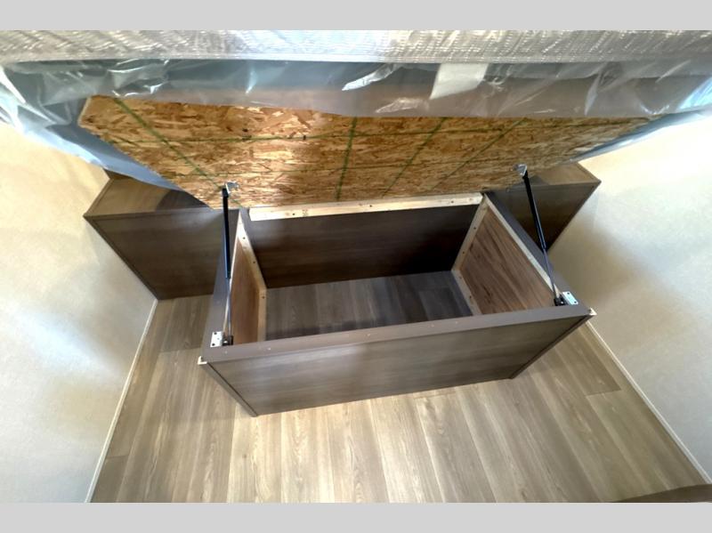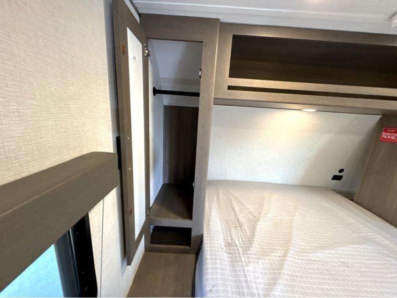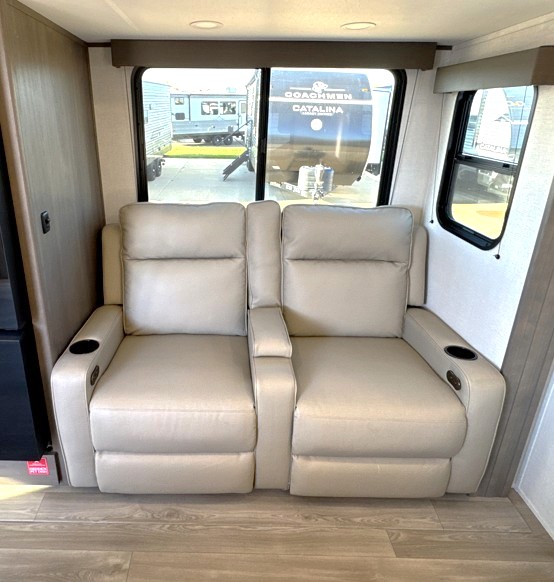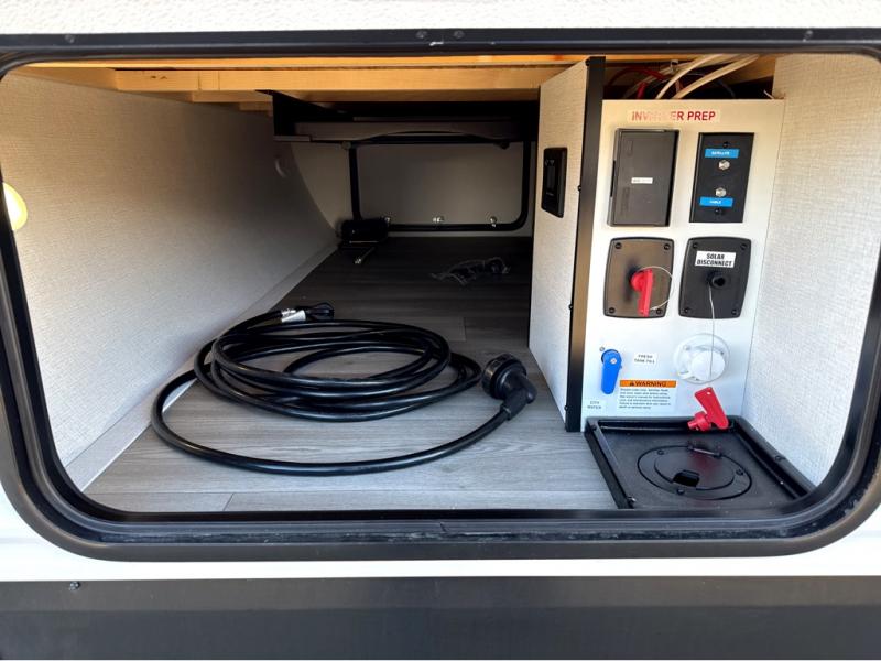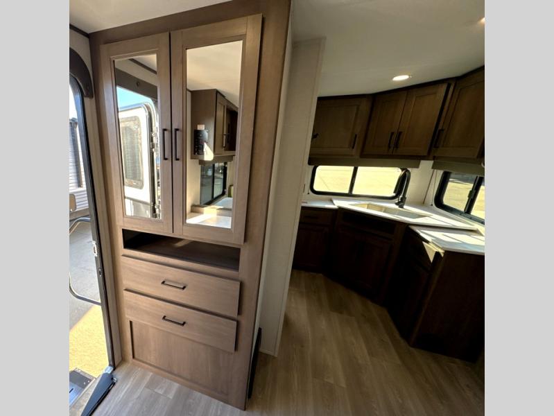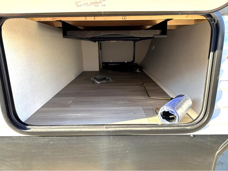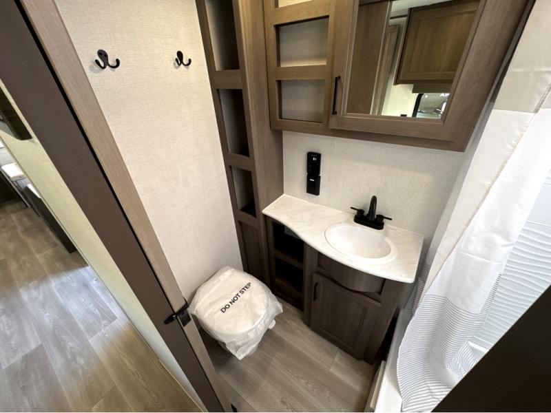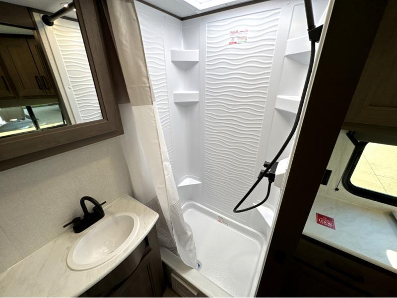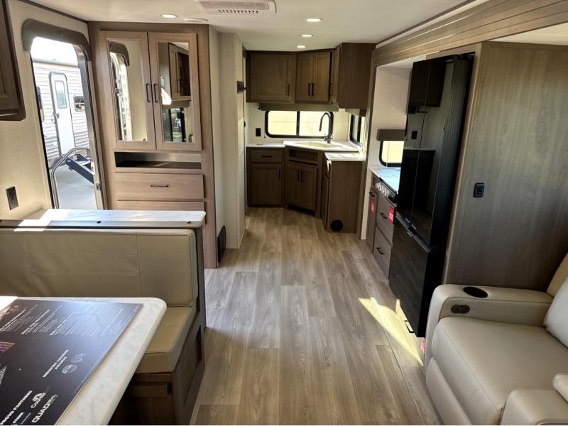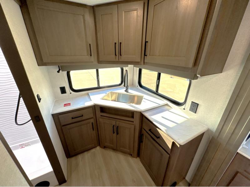 It will be so easy to enjoy camping trips in this travel trailer for five to six! The main living area is made spacious by the large slide out, and here you'll find the 60" sleeper sofa and the kitchen appliances. A booth dinette across the room provides a place to dine and play board games, or you can head outdoors to sit under the 17' power awning with LED lights. The queen bed in the front private bedroom will have you feeling right at home, and the TV prep here gives you the option to watch movies in bed. This model also includes a rear corner kitchen with ample counter space and a large sink, and you'll find the full bath in the other rear corner!