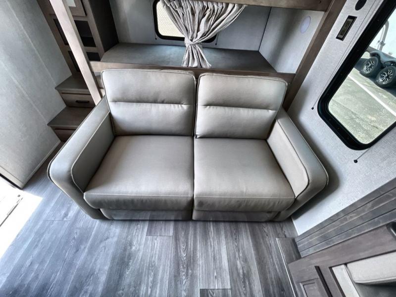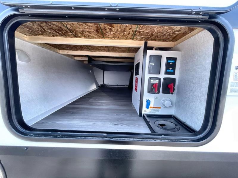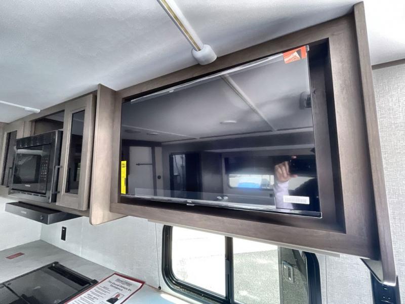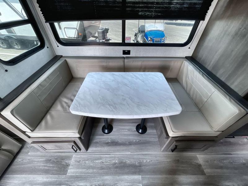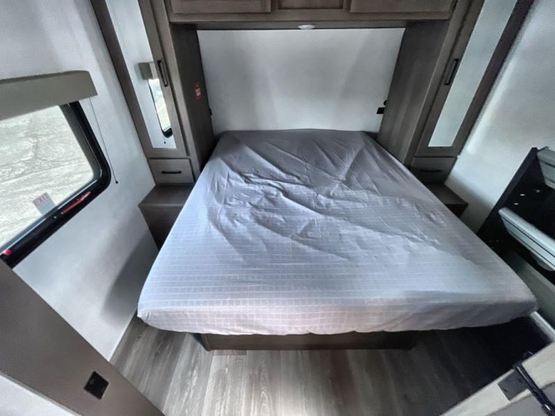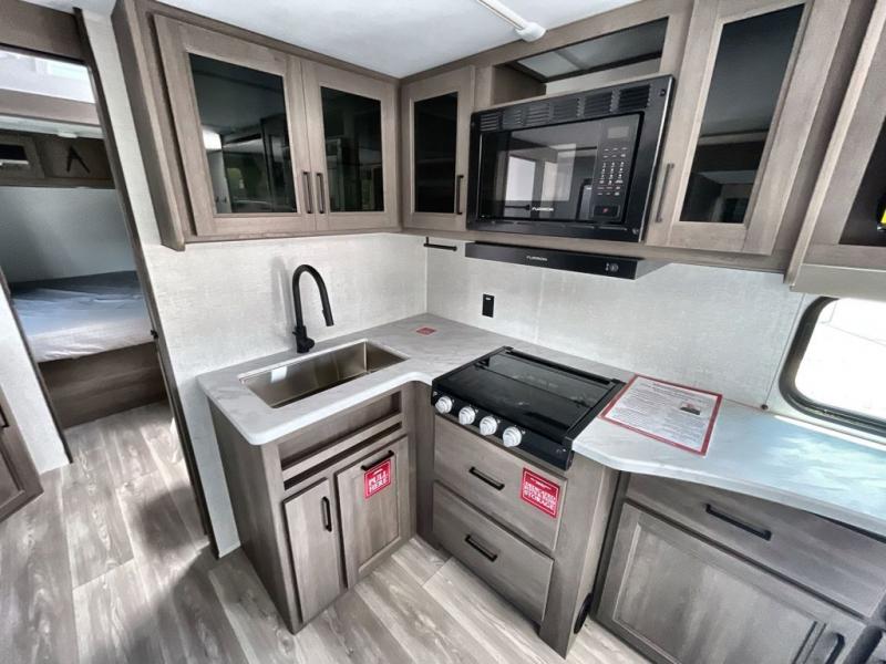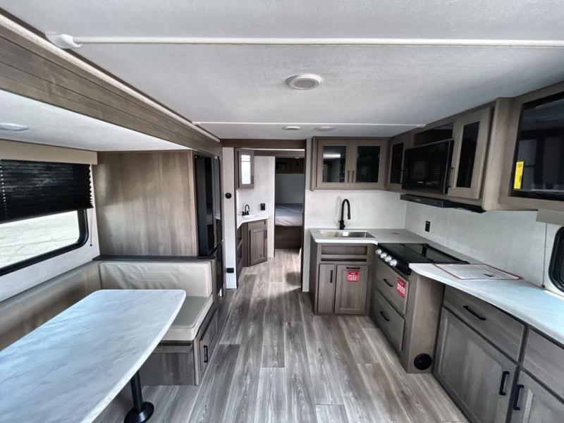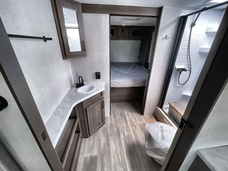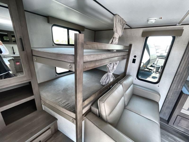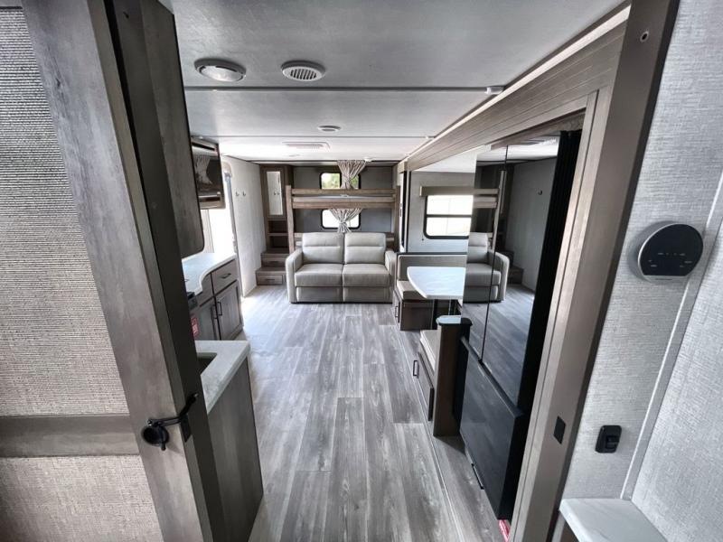 Your crew of eight will love camping in this spacious travel trailer! There are double-size bunks in the back with step storage and an added wardrobe for your guests' things plus exterior storage for camp gear galore. A walk-thru bath will create a front master bedroom you are sure to love, especially with its queen bed, wardrobe storage, and private exterior entry door! The main living area will be a favorite place to hang out with its U-shaped dinette, theater seating and 32" TV. If the weather is nice, you may just find yourselves outdoors since there is a rear exterior griddle and 1.7 cu. ft. refrigerator!