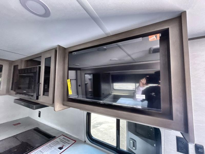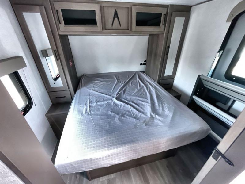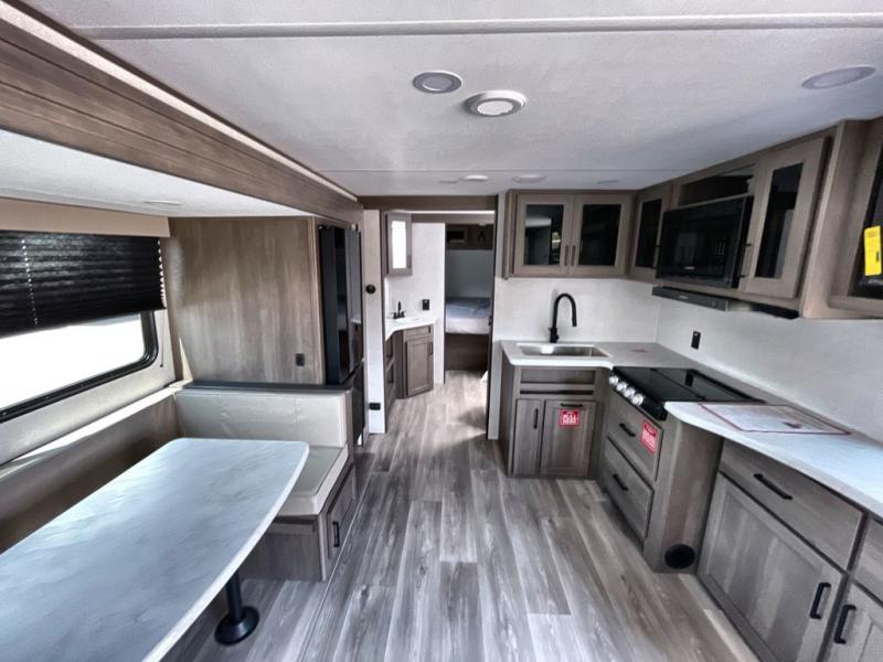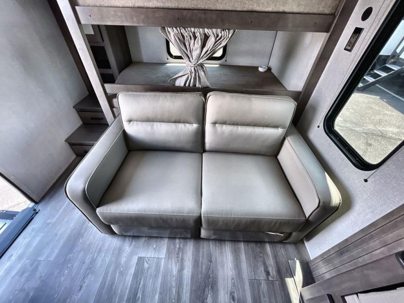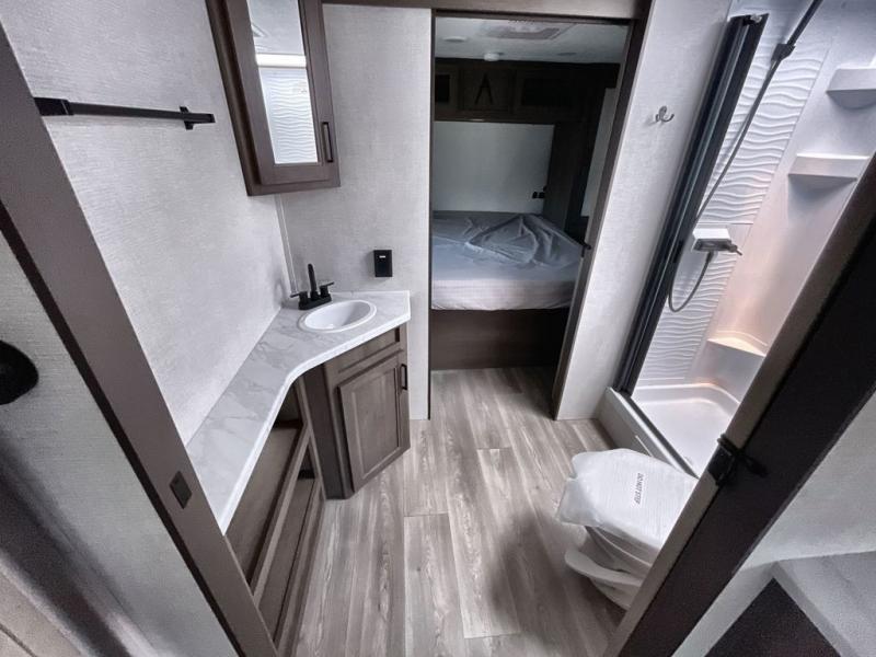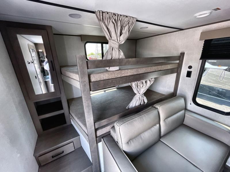 Your crew of eight will love camping in this spacious travel trailer! There are double-size bunks in the back with step storage and an added wardrobe for your guests' things plus exterior storage for camp gear galore. A walk-thru bath will create a front master bedroom you are sure to love, especially with its queen bed, wardrobe storage, and private exterior entry door! The main living area will be a favorite place to hang out with its U-shaped dinette, theater seating and 32" TV. If the weather is nice, you may just find yourselves outdoors since there is a rear exterior griddle and 1.7 cu. ft. refrigerator!