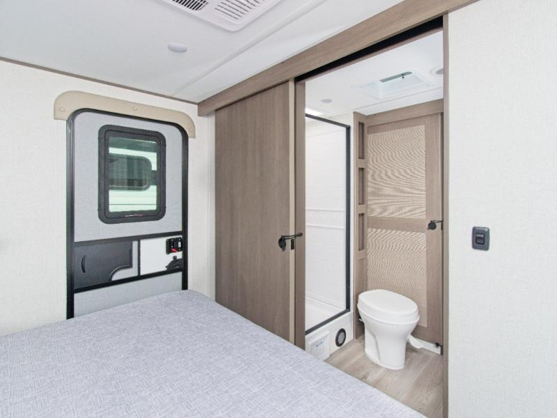 The private front bedroom includes a walk-around queen bed, dual wardrobes, and a separate exterior entry, offering a quiet retreat after a day of exploring. A walk-through bathroom connects the bedroom to the main living area, providing privacy and easy access.