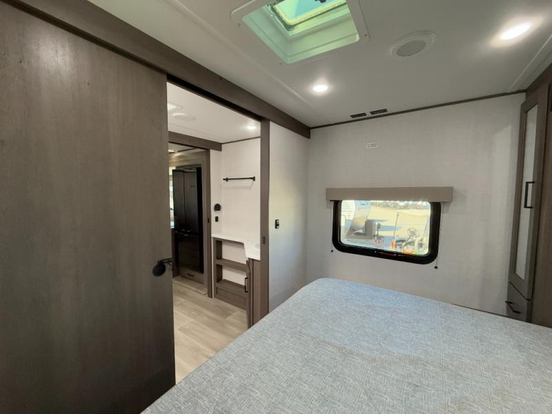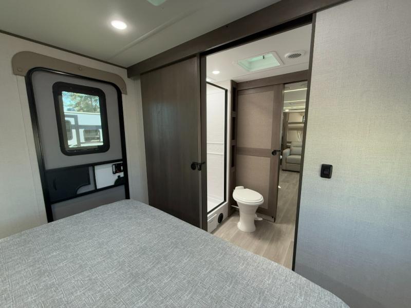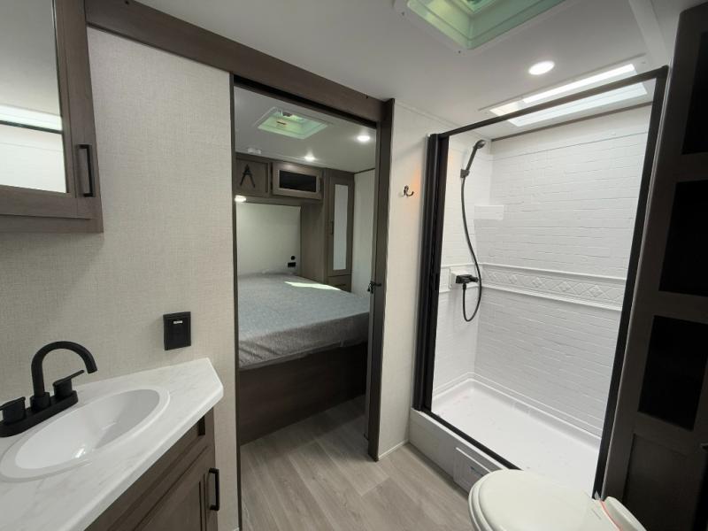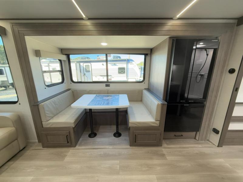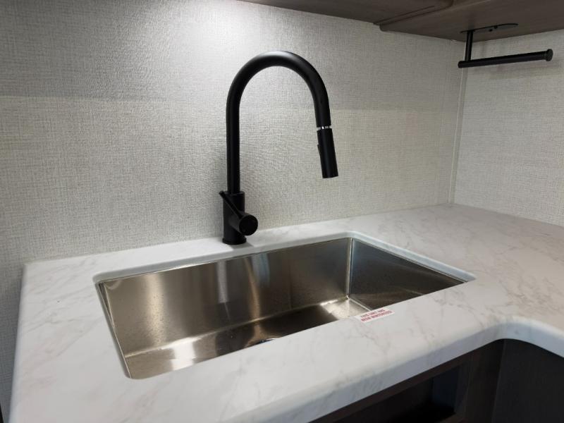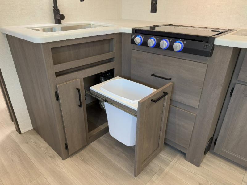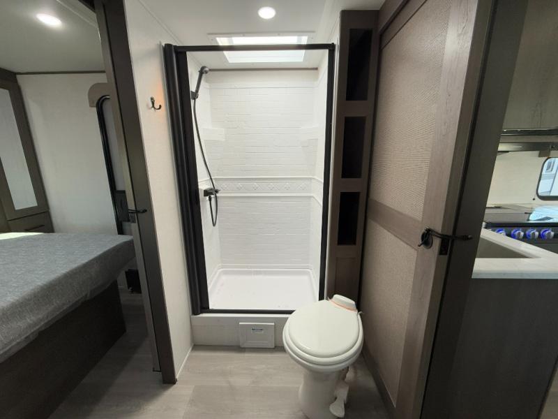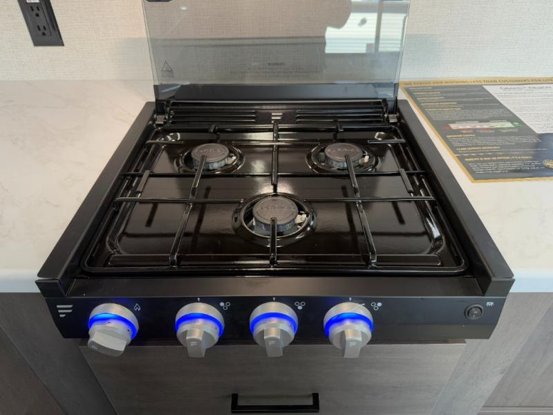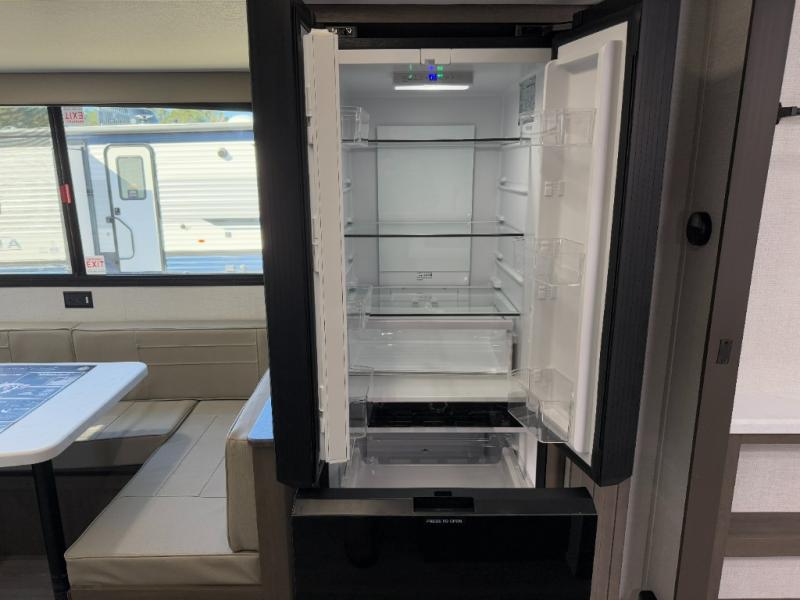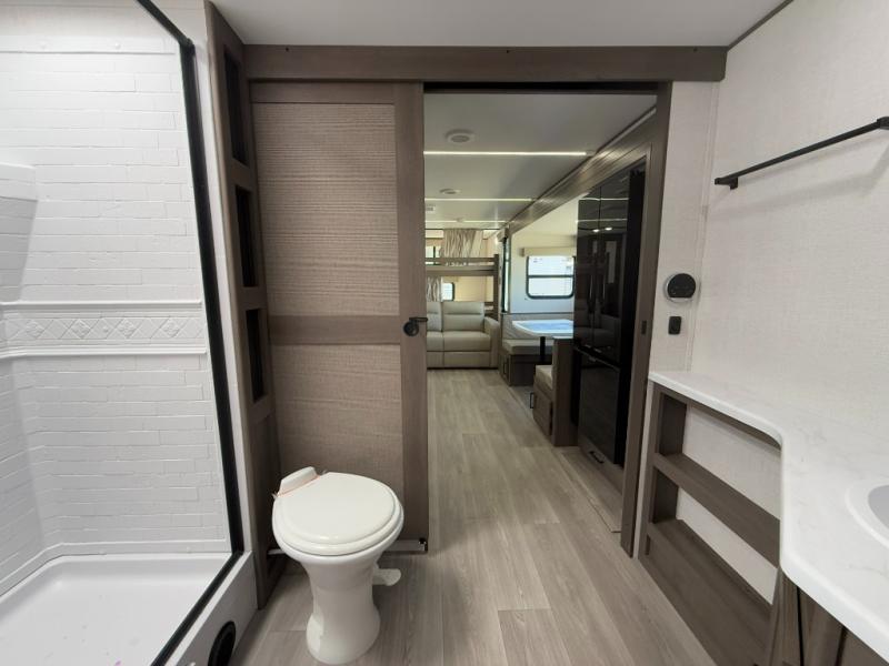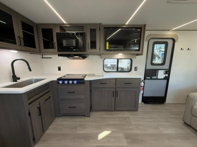 Premium Interior Features – Step inside, and you’ll be greeted by stylish interiors and high-end finishes. The modern kitchen is equipped with a full-size refrigerator, three-burner stove, microwave, and ample counter space, making meal prep a breeze while you’re on the road. The residential-style bathroom offers a spacious shower and plenty of storage, so you can feel right at home, no matter where you go.