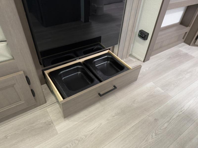 Options Featured in This Unit Include Theater Seating; Dual Entry Doors; Double-Size Bunks; Pull-Out Trash Can; Pet Dish!