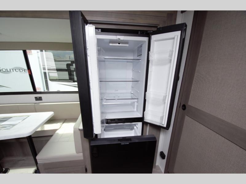 Cook inside with ease using the three burner range, large fridge, and microwave. Outside, enjoy a rear griddle and mini fridge under the awning for quick meals or snacks outdoors.