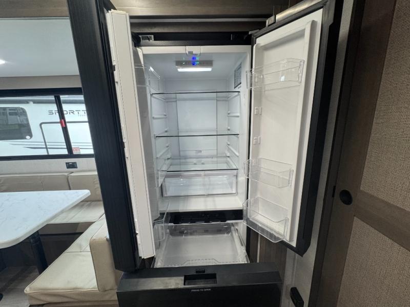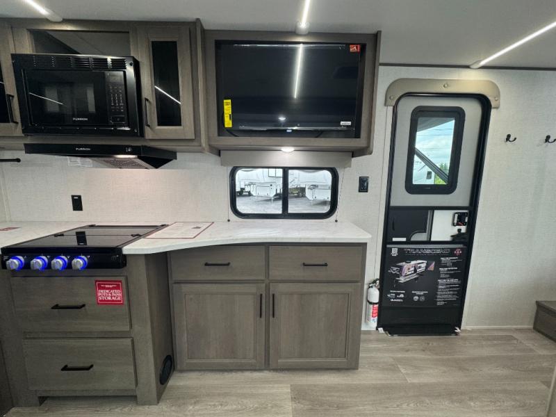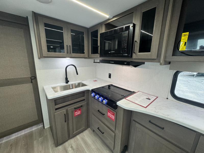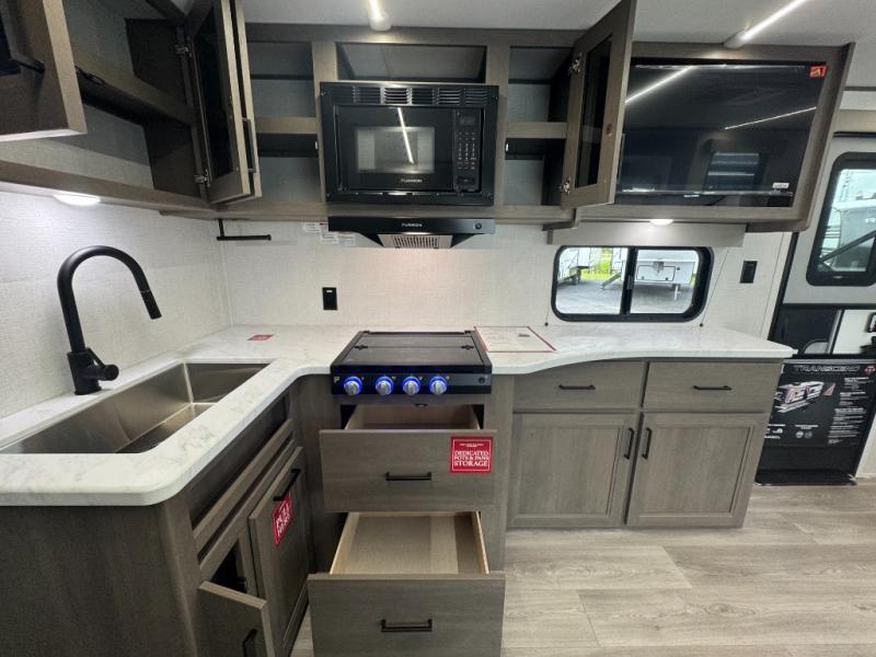 Fully Equipped Kitchen: Whip up meals with the three-burner stove, oven, microwave, and spacious 12V refrigerator. Plus, enjoy plenty of counter space and cabinetry for all your cooking essentials.