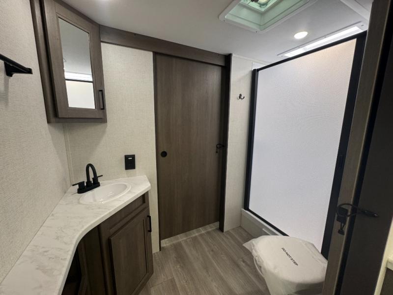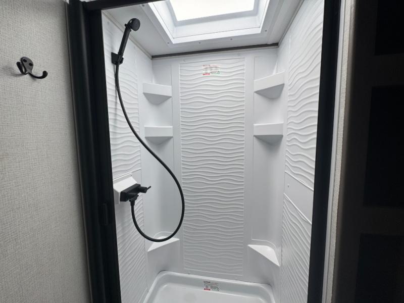 Rear Corner Bathroom: The full bath is conveniently located next to the bunk area and includes a walk-in shower with skylight, foot-flush toilet, and mirrored vanity.