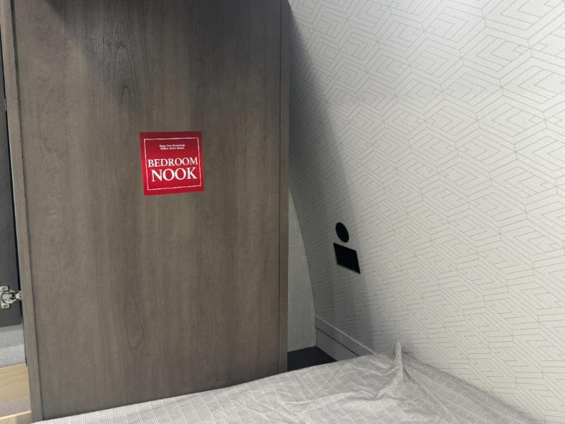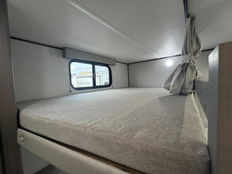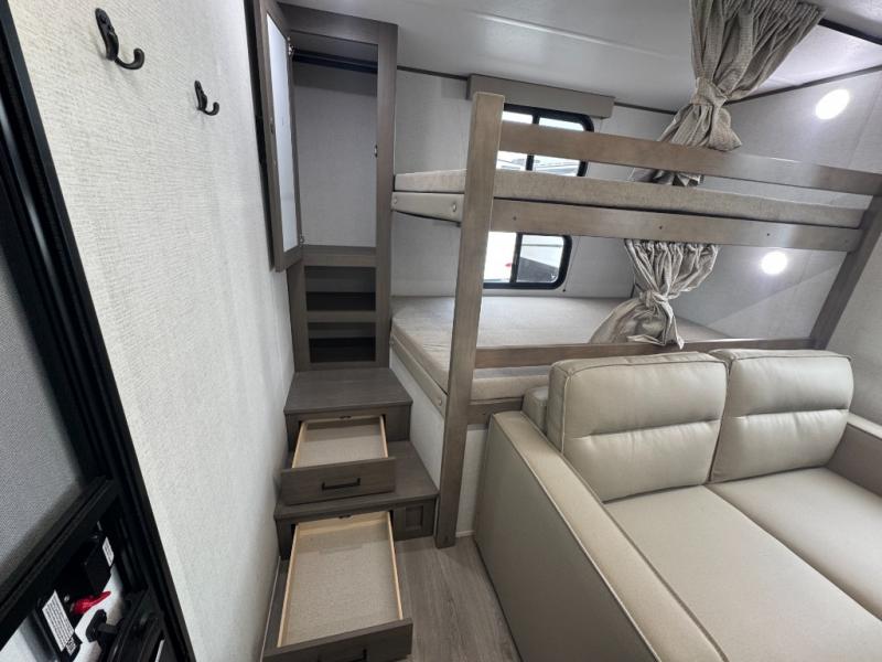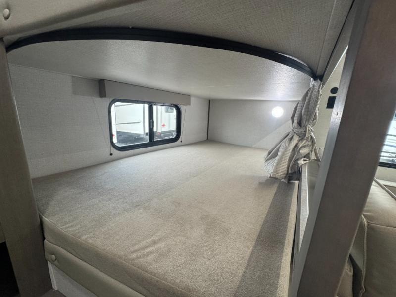 Spacious Bunkhouse Floorplan: This unit features double-over-double rear bunks with built-in ladders and privacy curtains, perfect for kids, guests, or even gear storage.