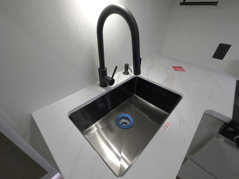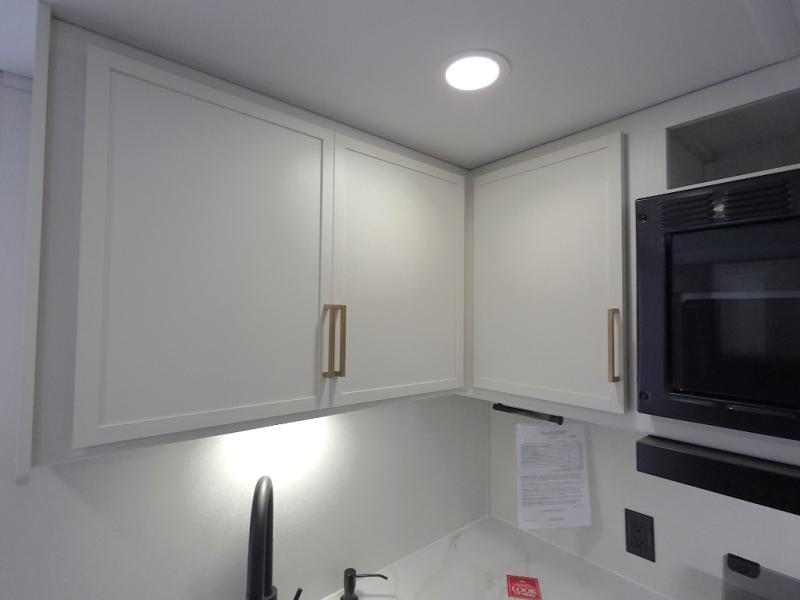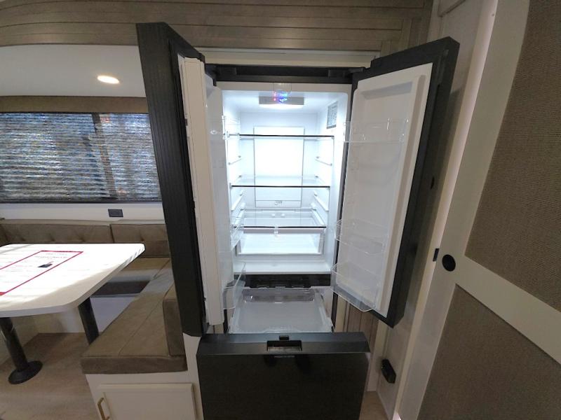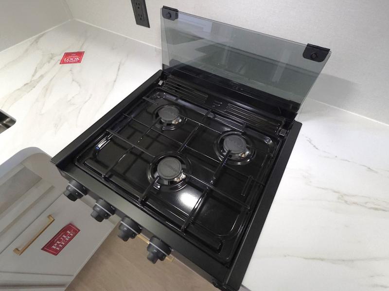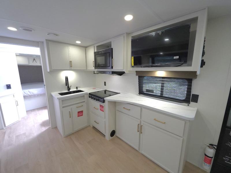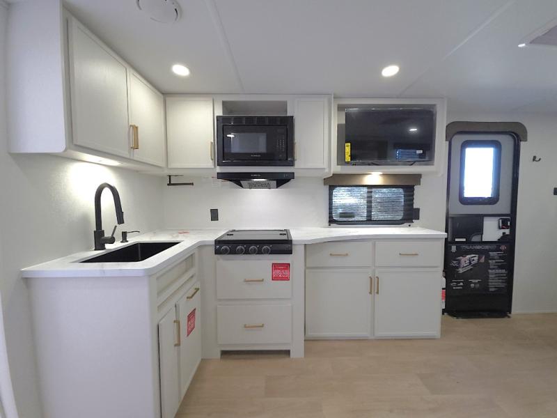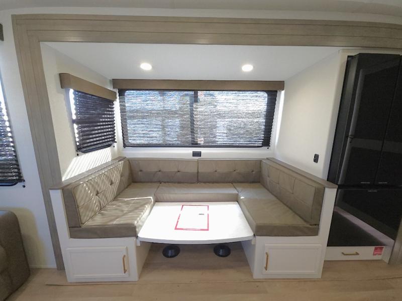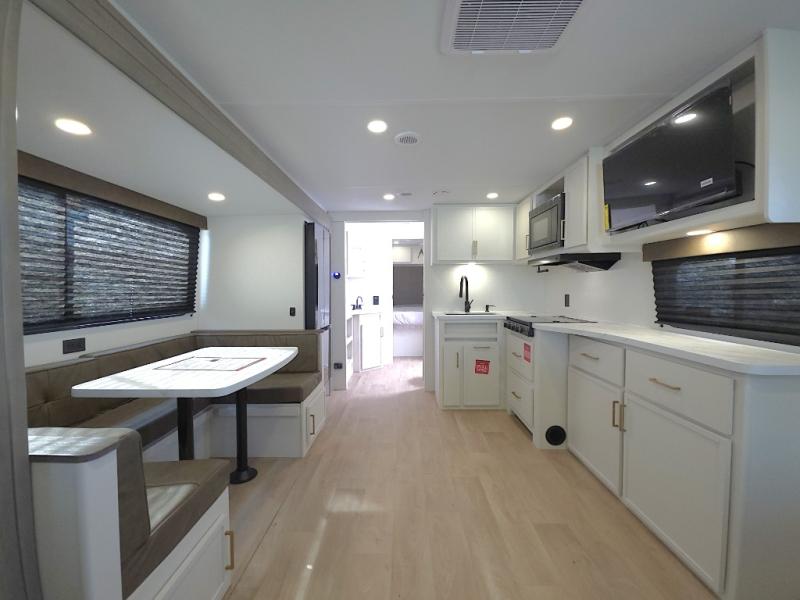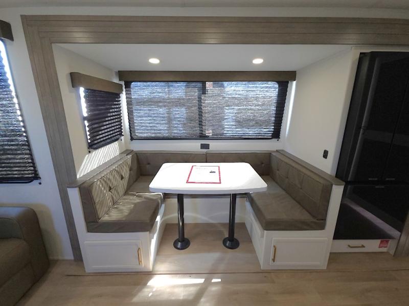 Prepare meals easily with a three-burner range, microwave, refrigerator, deep sink, and ample counter space. Plenty of cabinet and pantry storage keeps everything organized. The convertible dinette and comfortable seating offer flexibility for meals, movie nights, or additional sleeping space.