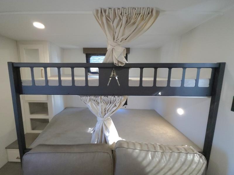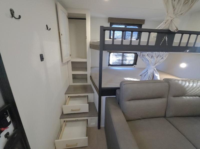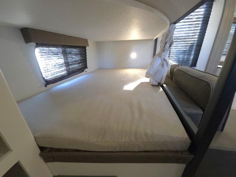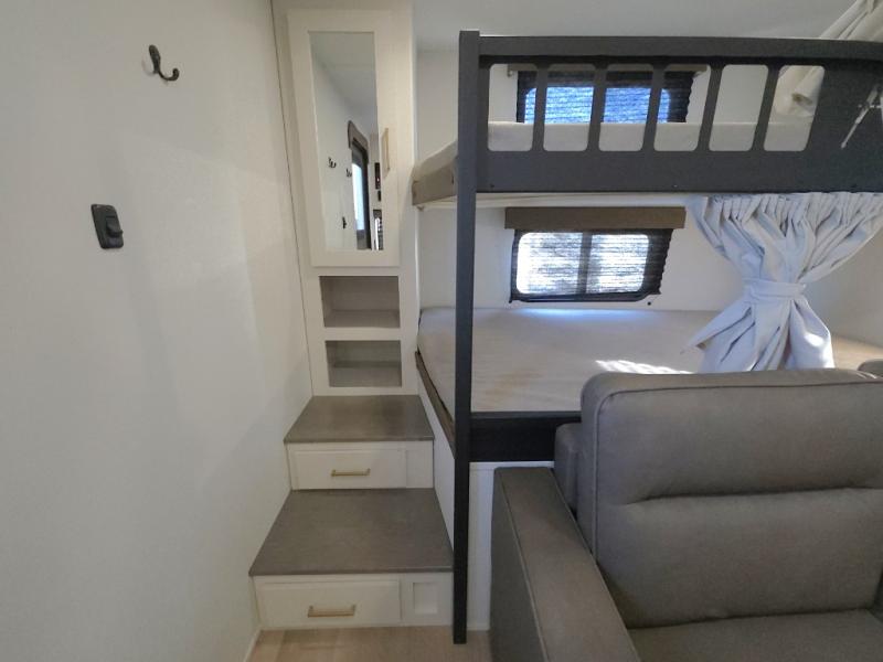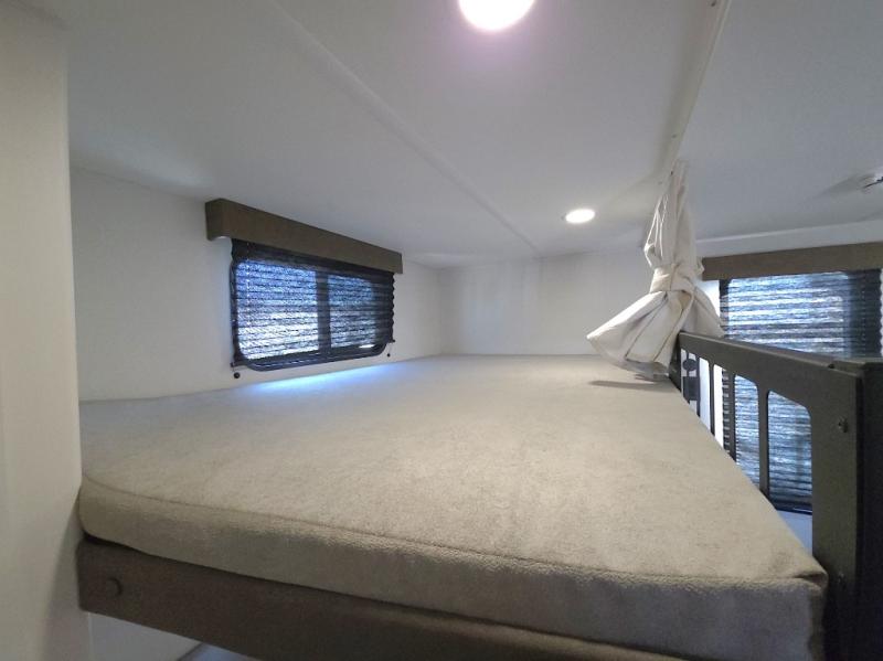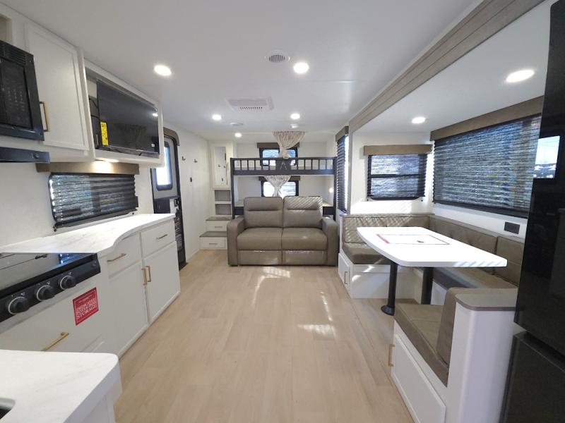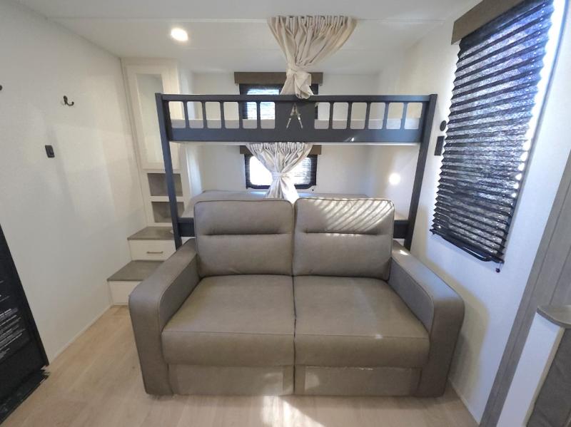 The 265BHT features a spacious rear bunkhouse, giving kids or guests their own dedicated sleeping space. The main living area includes a slide-out that expands your interior room, creating a comfortable environment for relaxing, dining, or entertaining. Large windows bring in natural light and scenic views, enhancing the open feel.