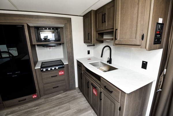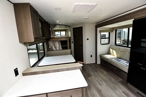 Camping with your larger family or when you want to take along a few extra friends is easy with this trailer. This unit sleeps nine with the double-size bunks in the rear corner, the 60" roll over sofa, and the queen bed in the front semi-private bedroom. The booth dinette can also be used to sleep a guest or two little ones at night once converted. Prepare your meals on the three-burner cooktop indoors, or out on the two-burner cooktop at the outside kitchen! You'll also find a handy exterior spray port and an outdoor refrigerator for cold drinks! It will be so easy to fill the dog's food bowl with the added pet dish under the refrigerator, and the full bath in this model means you don't have to use the camp's facilities. Having a 17' awning outside along with a large unobstructed pass-through compartment allows you extended living outdoors and plenty of space for all of your gear!