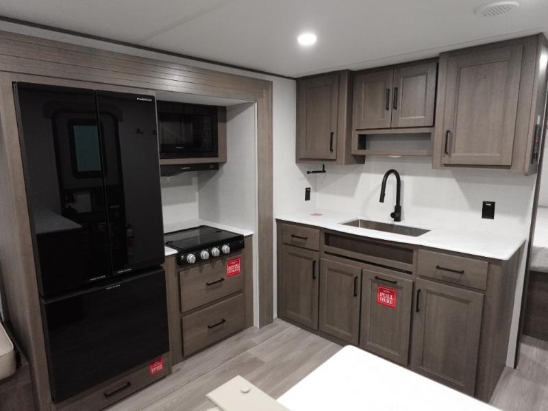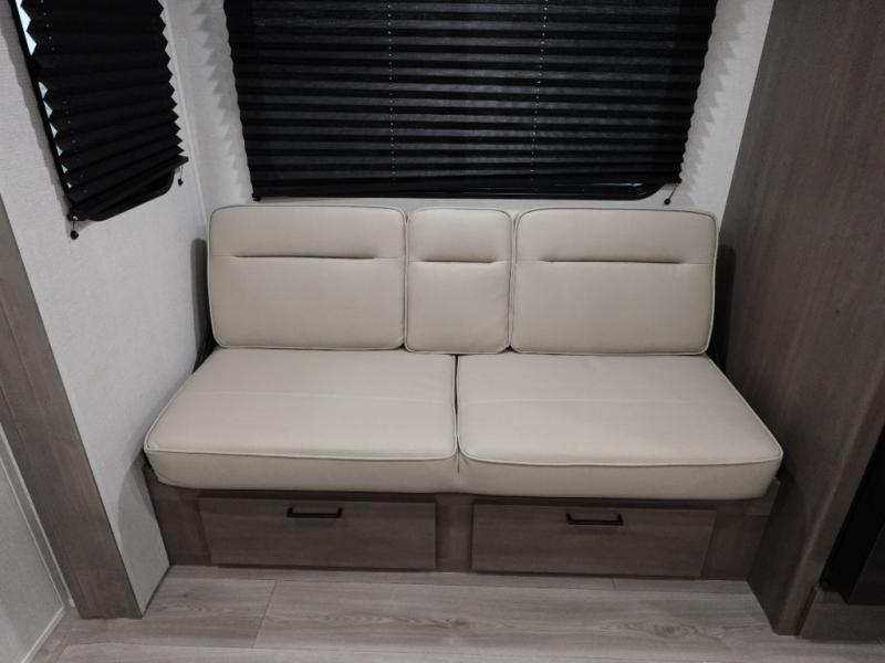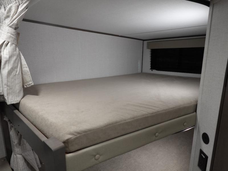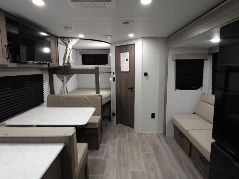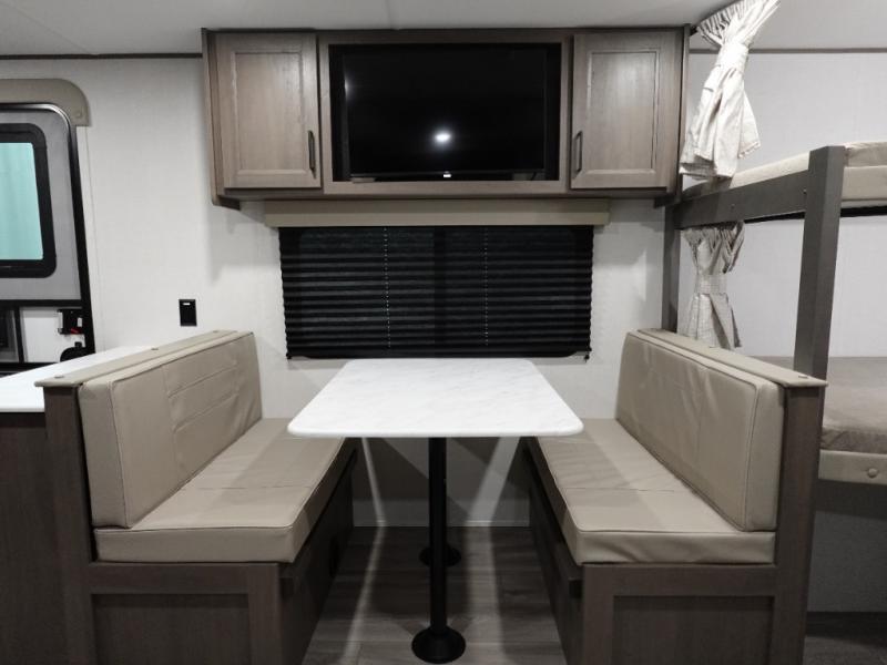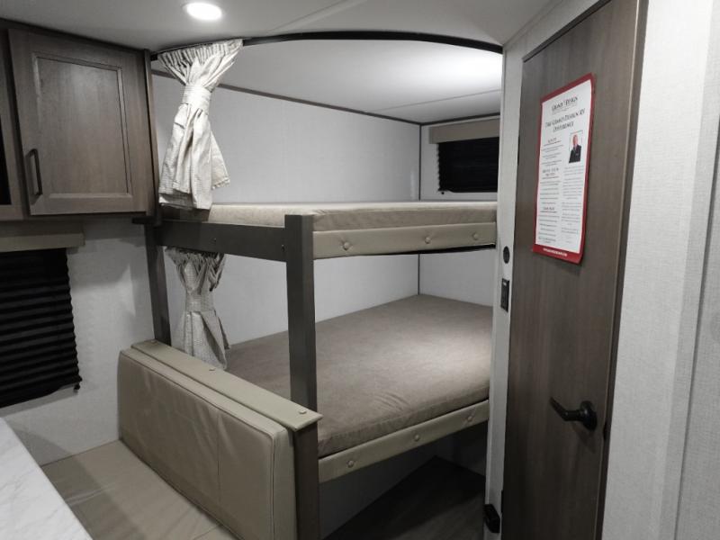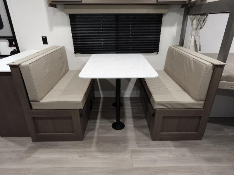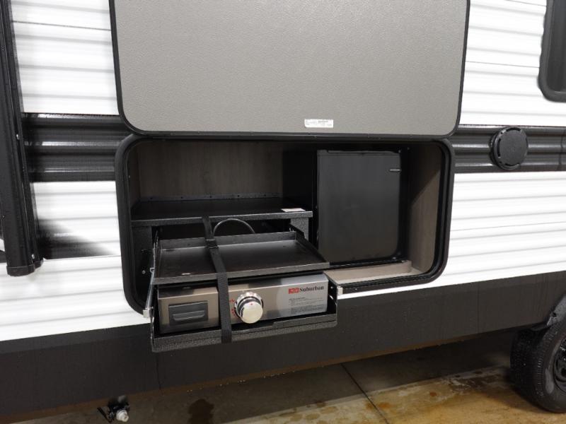 Camping with your larger family or when you want to take along a few extra friends is easy with this trailer. This unit sleeps nine with the double-size bunks in the rear corner, the 60" roll over sofa, and the queen bed in the front semi-private bedroom. The booth dinette can also be used to sleep a guest or two little ones at night once converted. Prepare your meals on the three-burner cooktop indoors, or out on the two-burner cooktop at the outside kitchen! You'll also find a handy exterior spray port and an outdoor refrigerator for cold drinks! It will be so easy to fill the dog's food bowl with the added pet dish under the refrigerator, and the full bath in this model means you don't have to use the camp's facilities. Having a 17' awning outside along with a large unobstructed pass-through compartment allows you extended living outdoors and plenty of space for all of your gear!